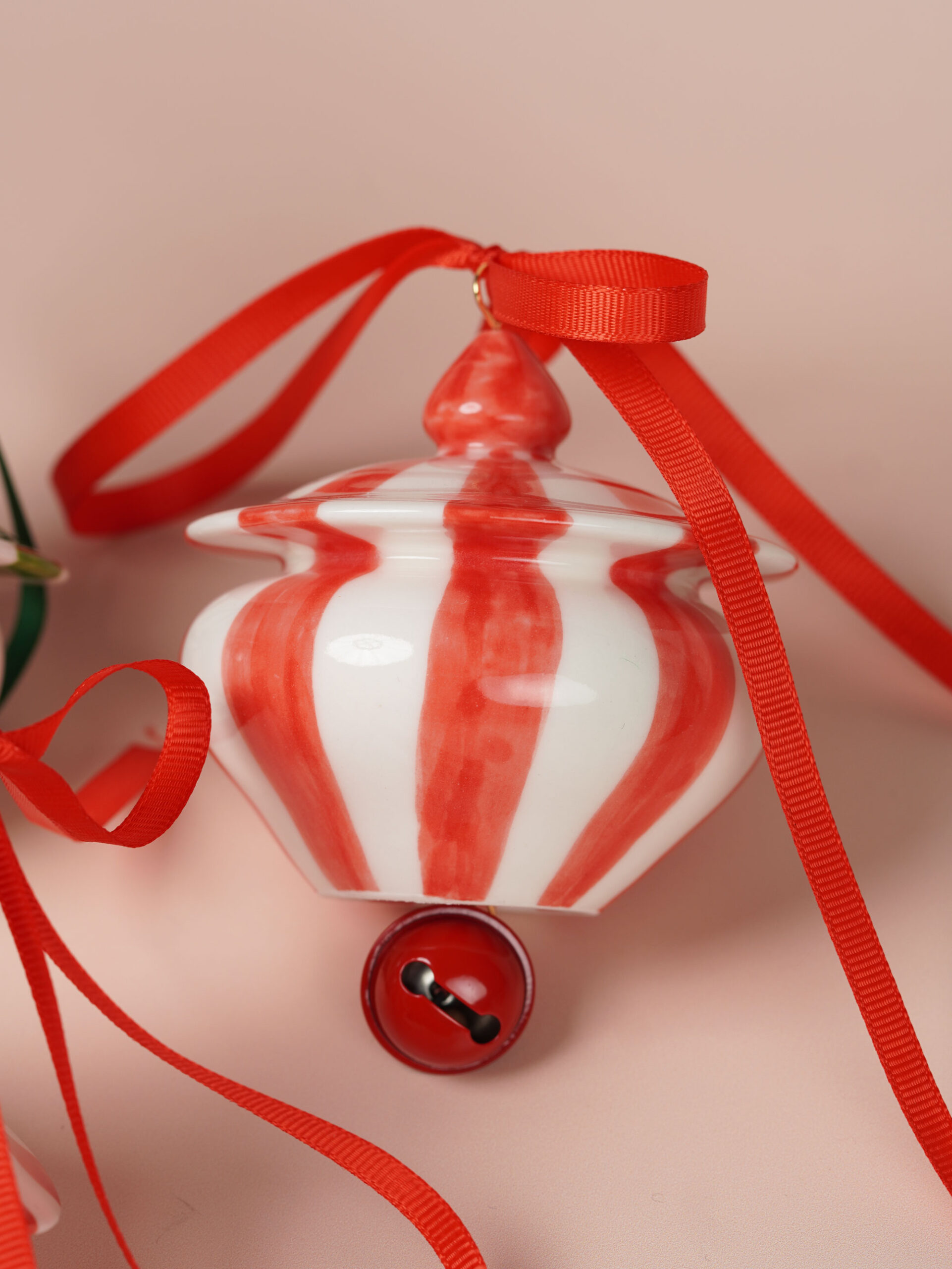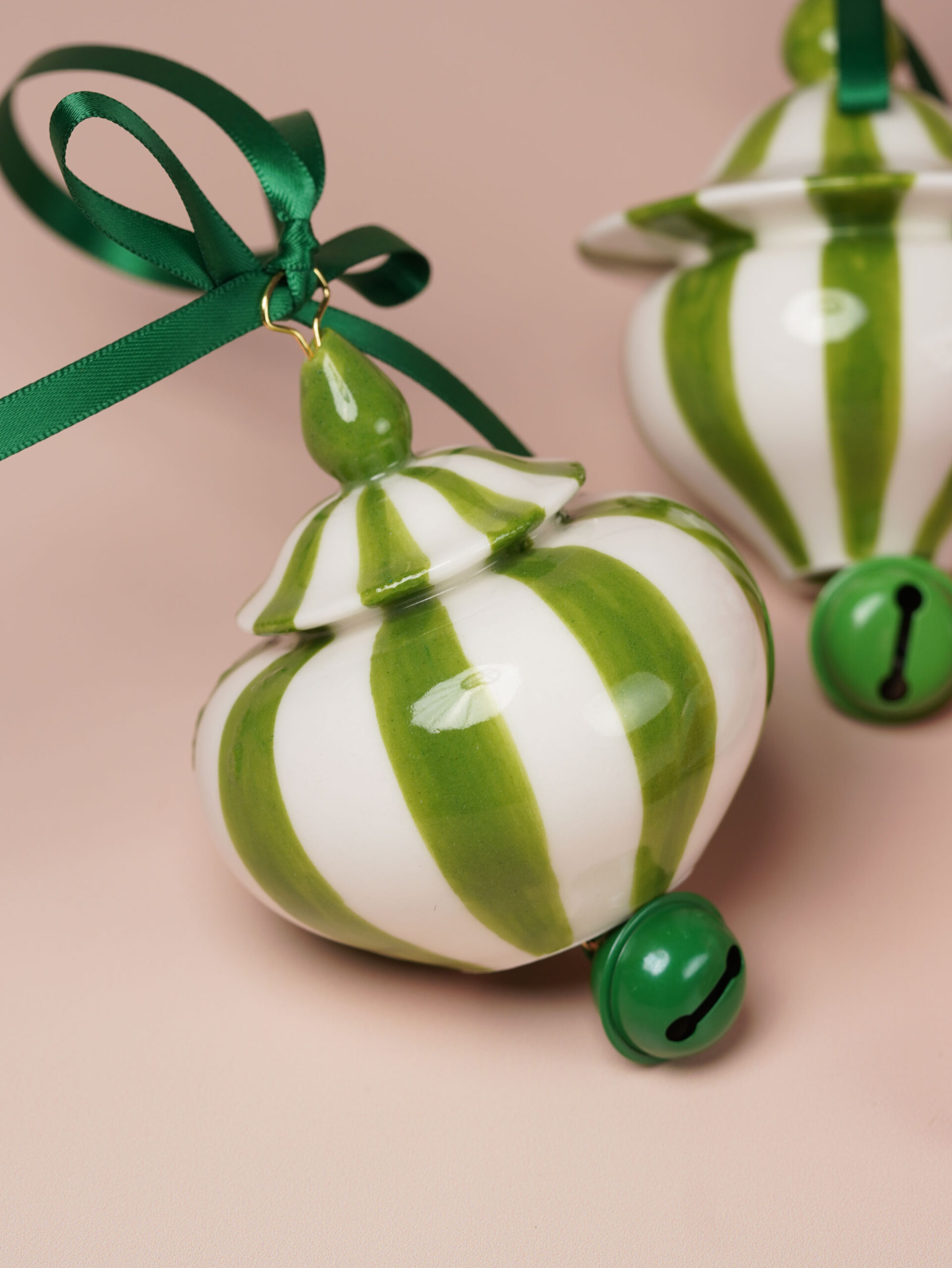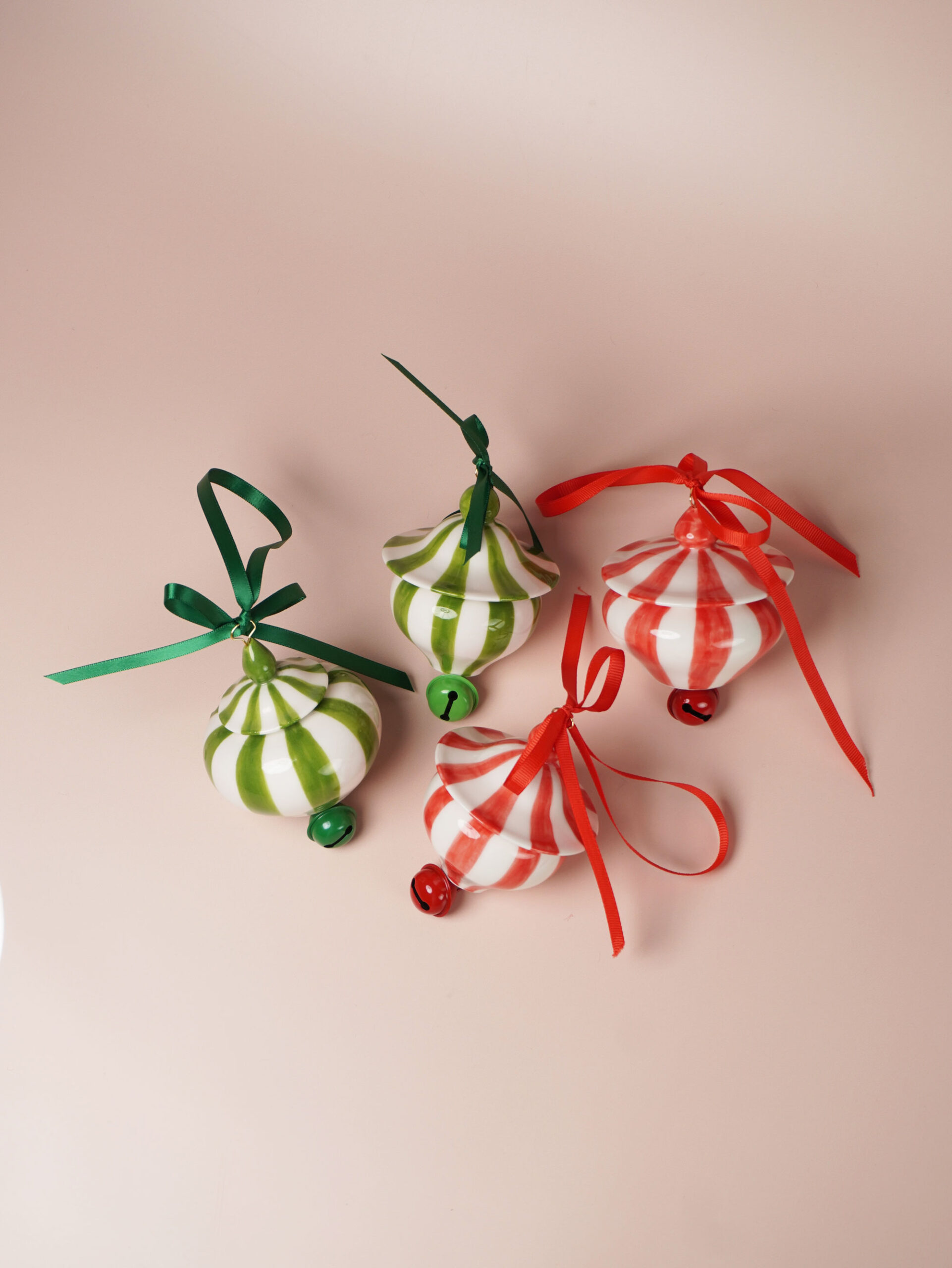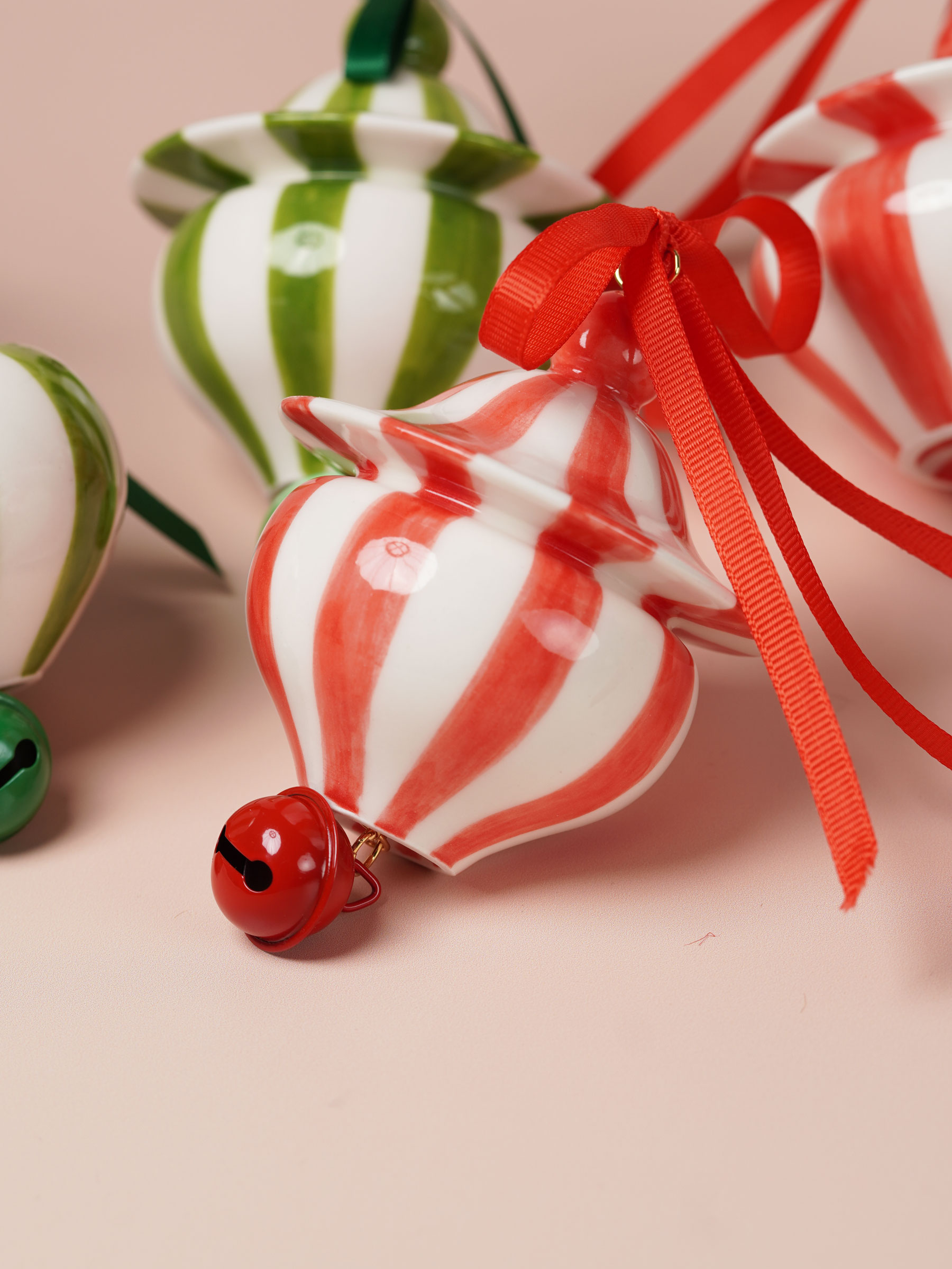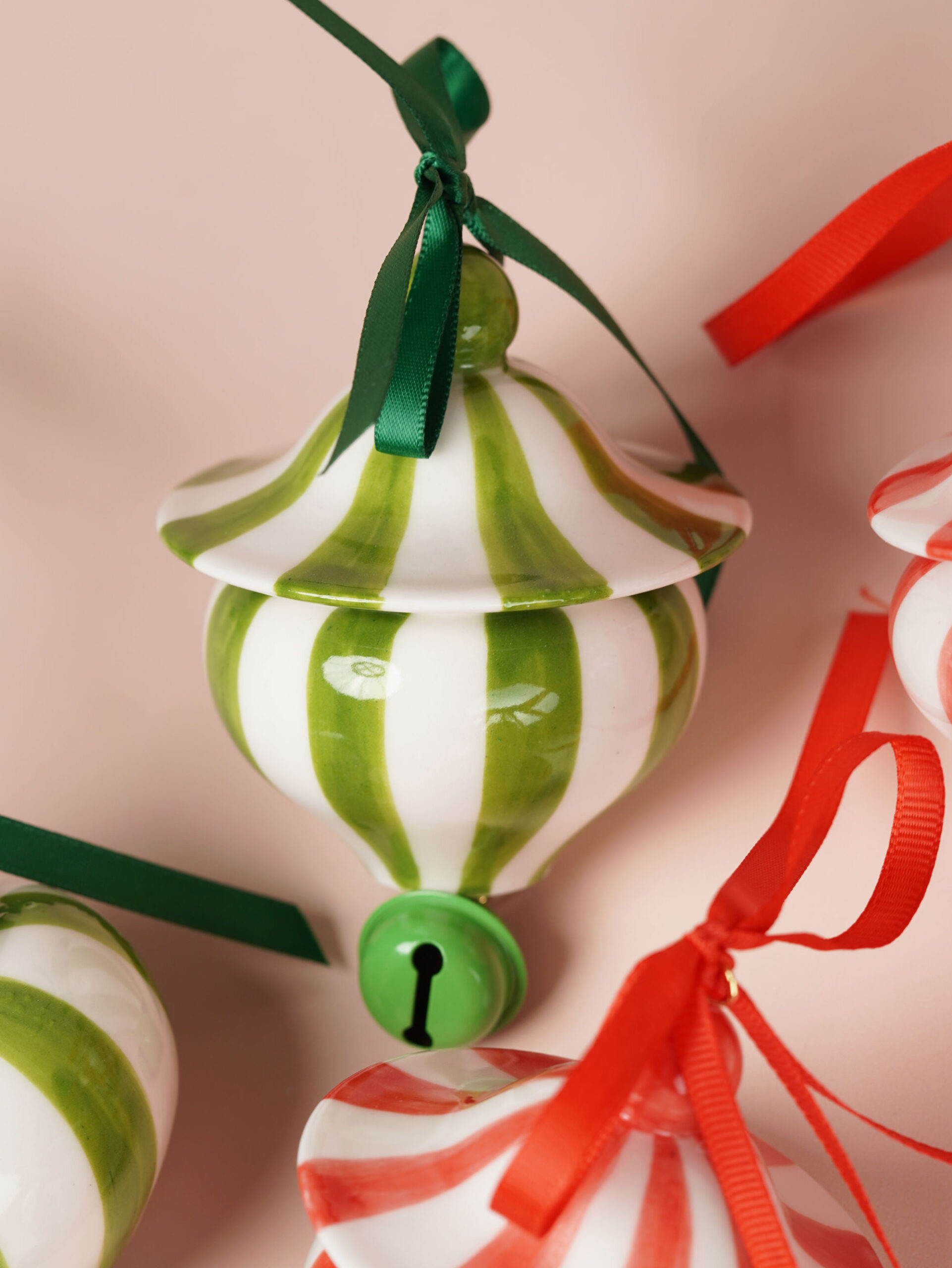 Each piece is slip-cast, hand-decorated with red and green underglazes, and coated in a clear glossy glaze. A soft 18k gold-gilded wire runs through the ornament, ready for hanging. Each ornament features a playful bell and finished with red and green ribbons for a festive touch.