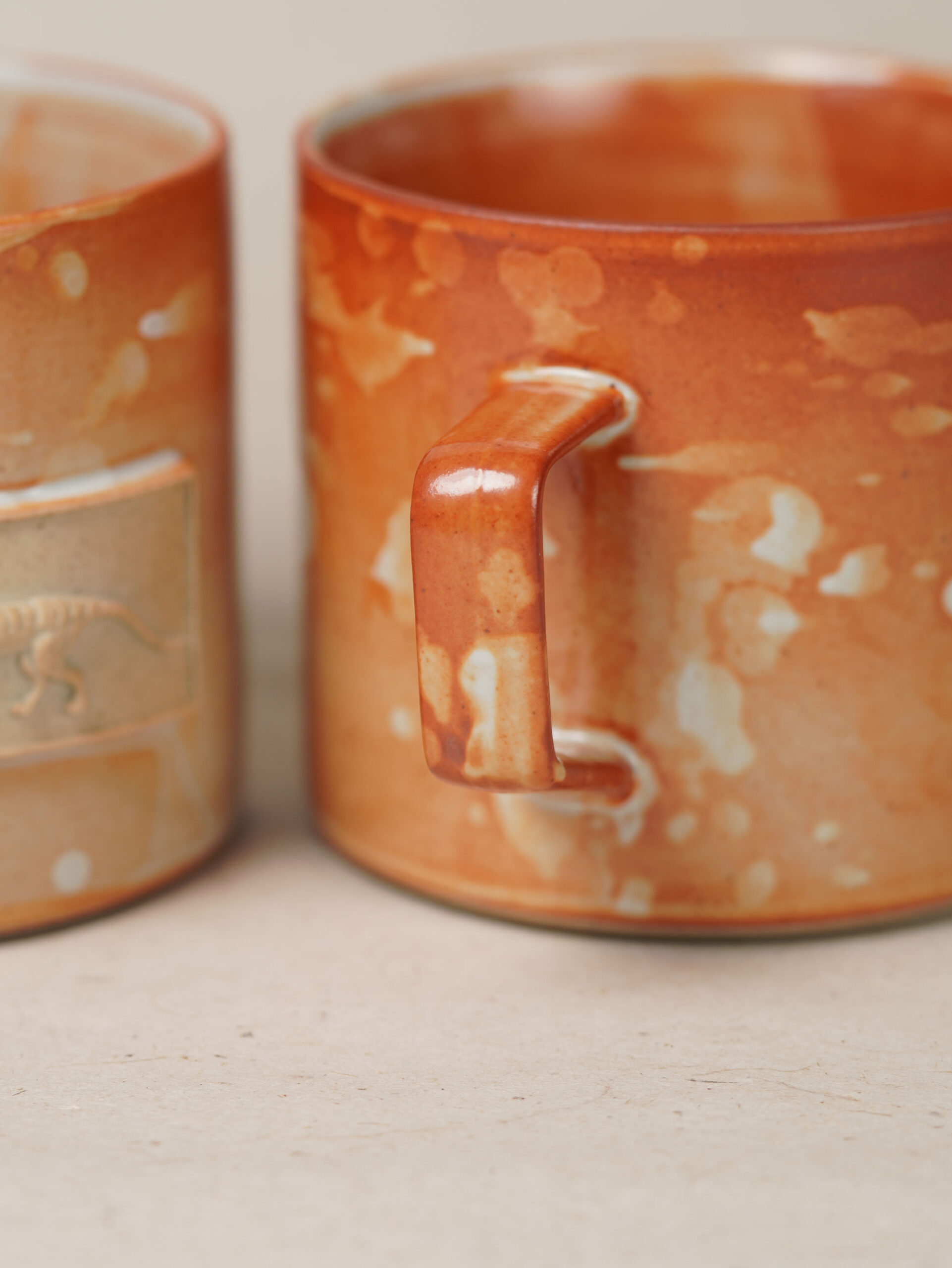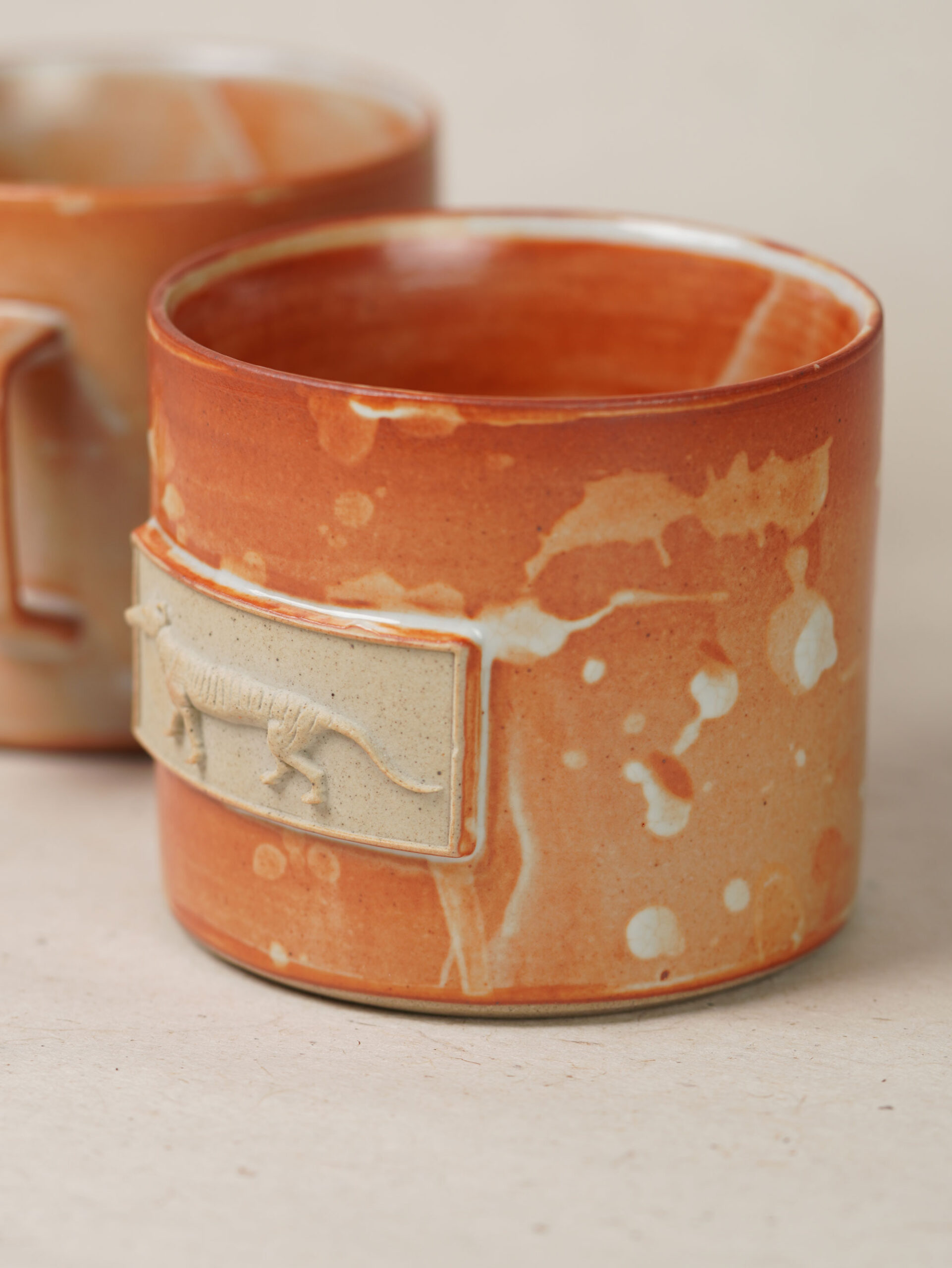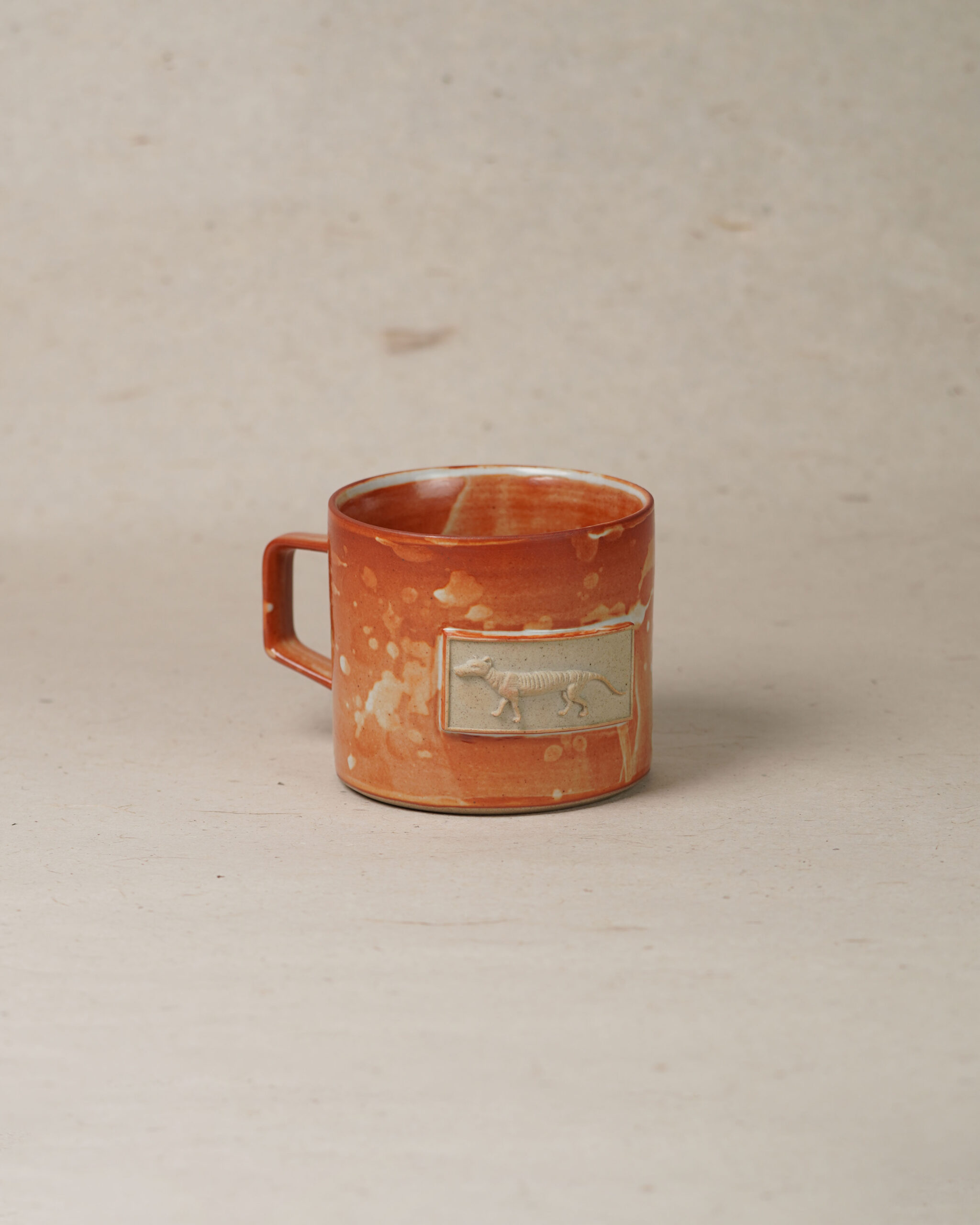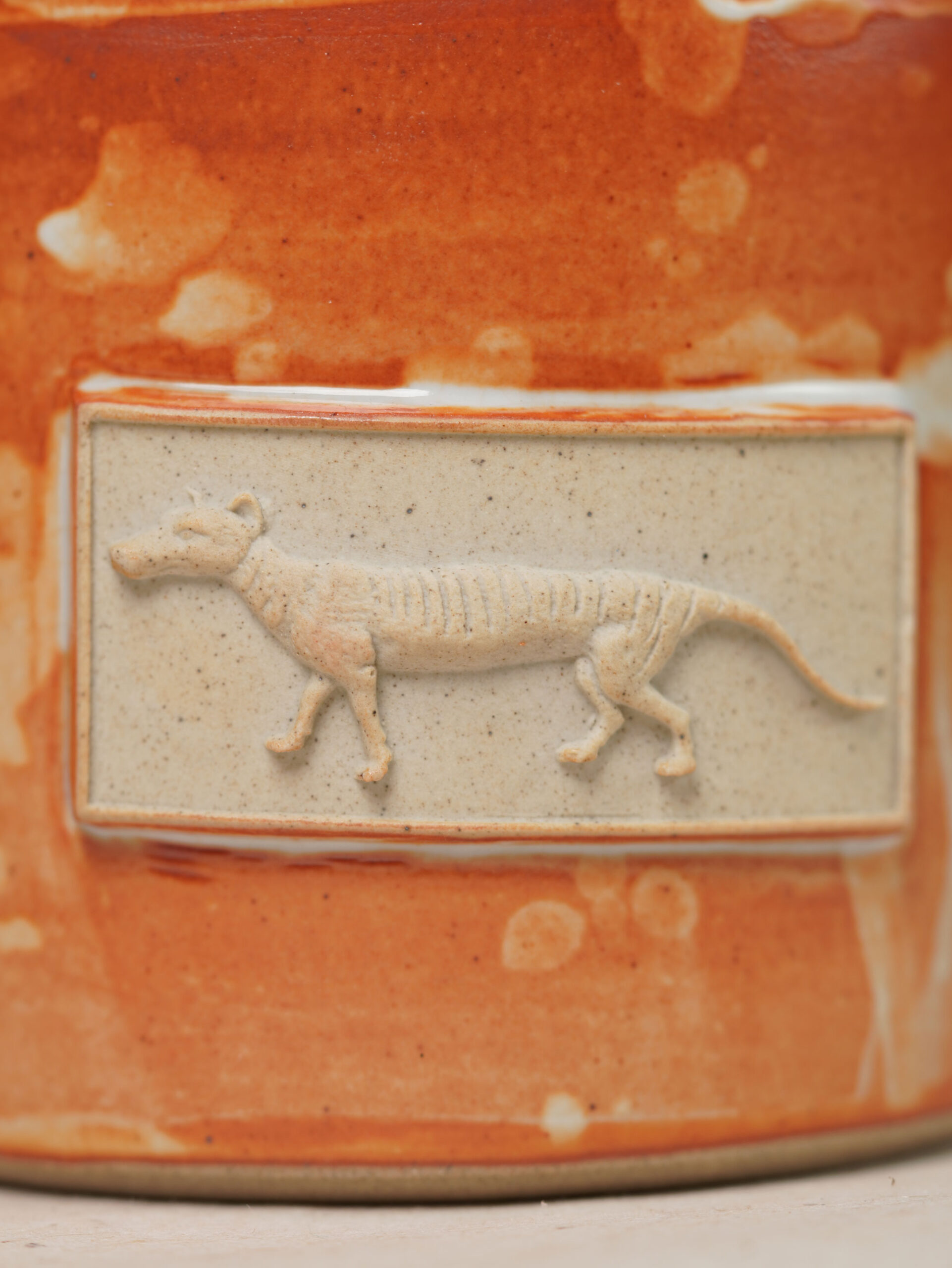 Larger in size with a generous 500ml volume. This Burnt Sienna chino glaze blends rich, earthy orange tones with soft milky speckles and reactive drips, creating a warm, dynamic surface. Developed for our beloved Neo Servingwares as a tribute to the red hues of the Australian outback — deep in natural history, long-lasting yet fragile — it pairs beautifully with the extinct thylacine, whose elusive story feels perfectly at home in this timeless, evocative glaze. The animal figure is inspired by the animal’s taxidermy on display in Melbourne Museum.