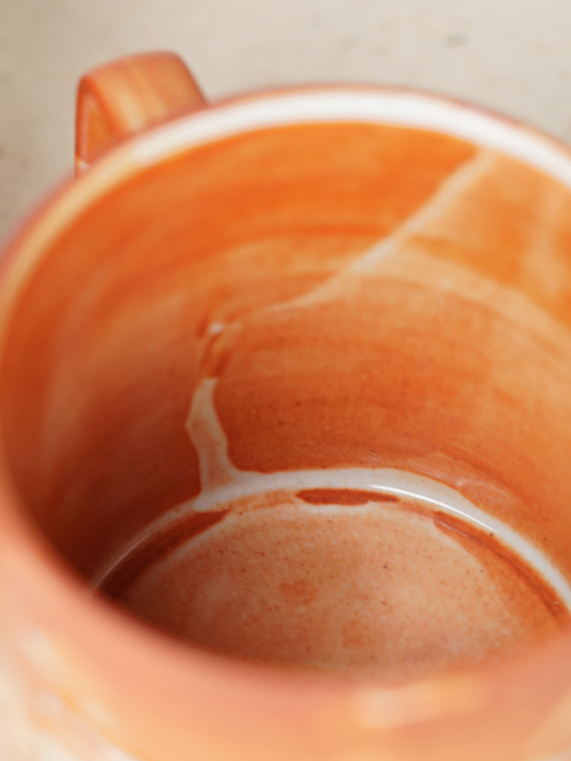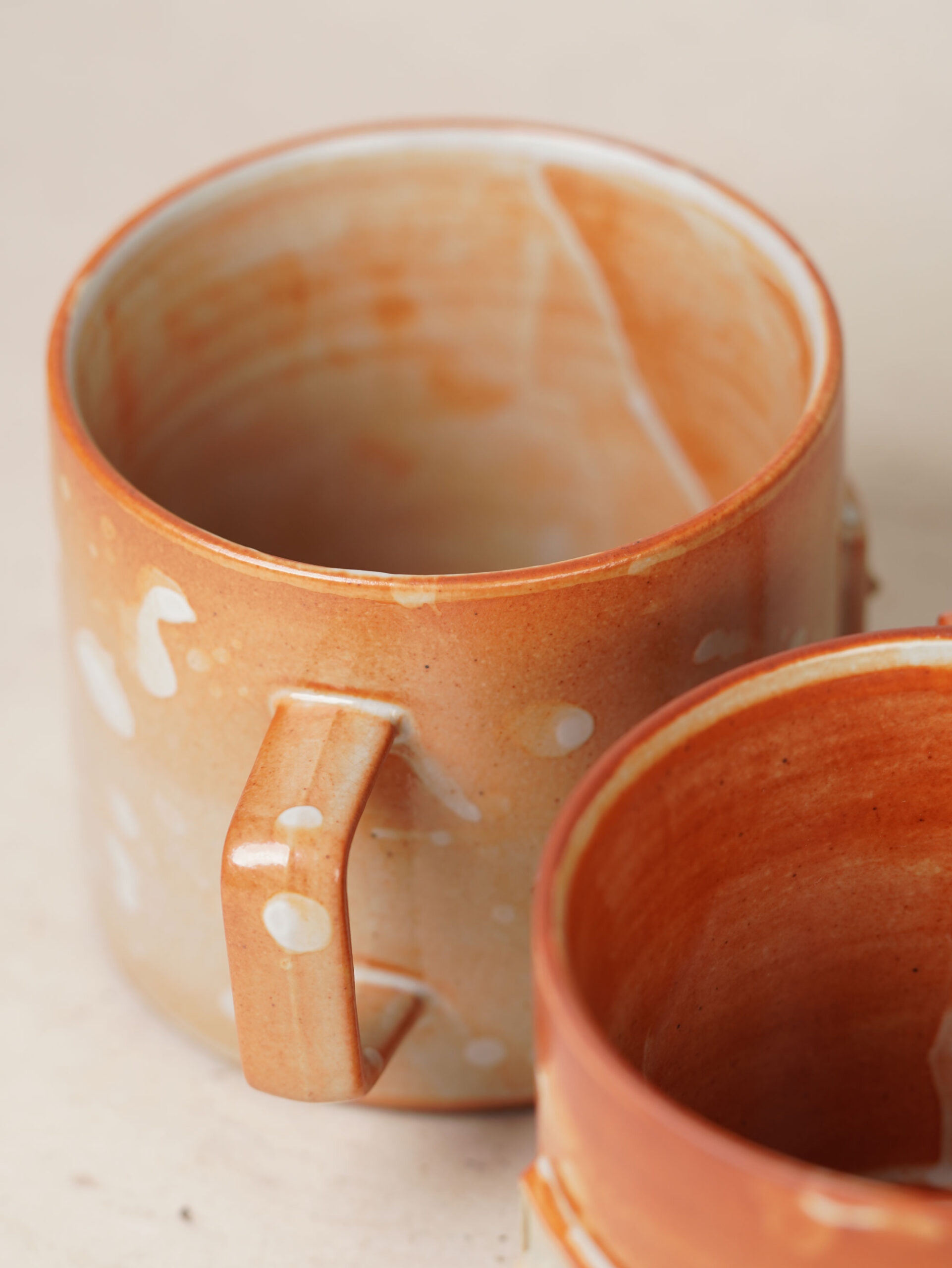Colour: A rich burnt sienna orange with soft milky speckles and natural reactive drips, echoing the red earth tones of the Australian outback.