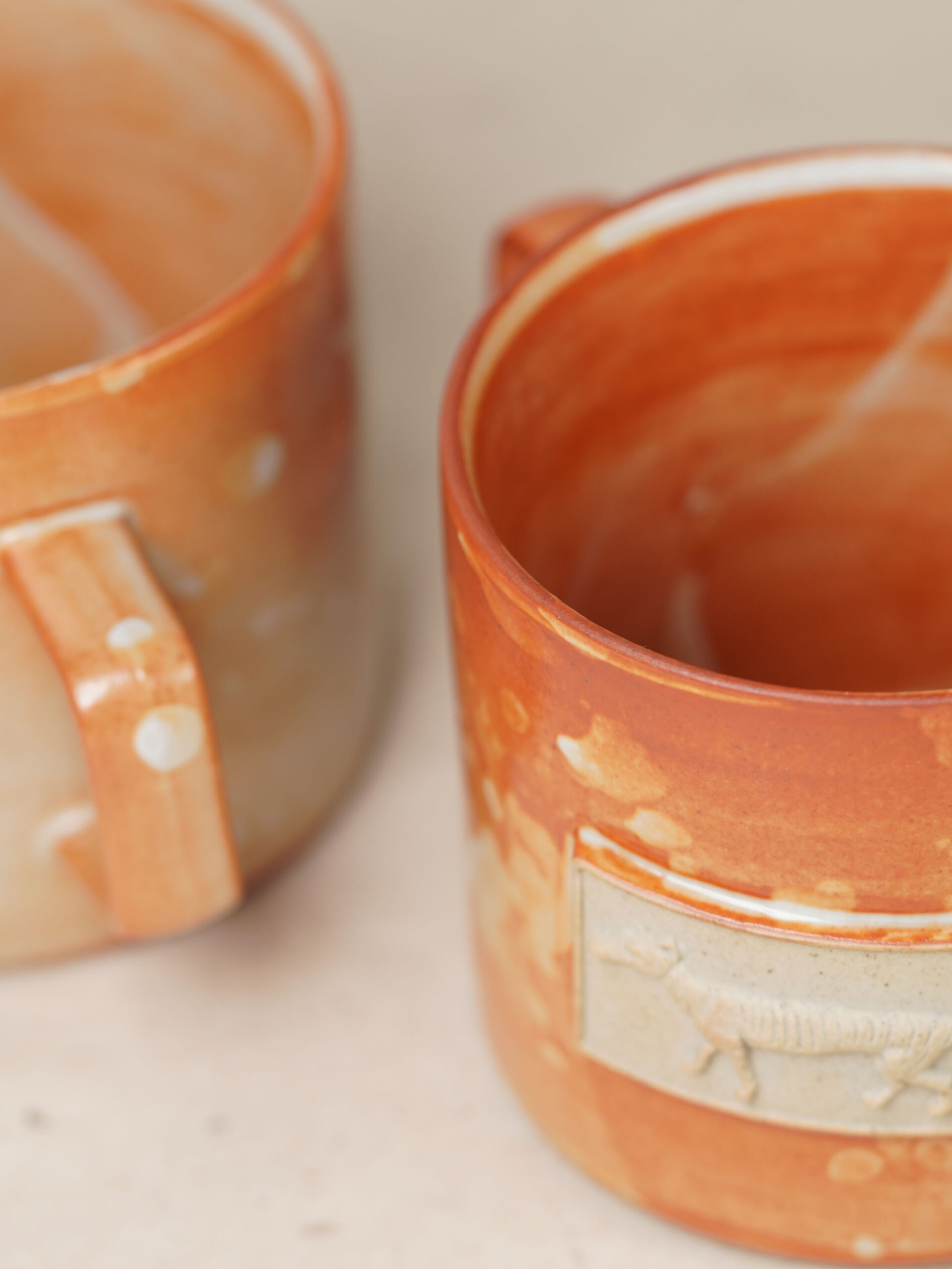 Every animal is captured mid-motion on a tiny ceramic tile, offering a moment of personality in relief. Tiles are positioned on classic, comfortable mug forms with handles designed to suit hands of all shapes and sizes. The glazing process is a blend of chemistry and chance: sometimes multiple colours are layered to encourage reactions in the extreme heat of a 1300°C gas kiln. During firing, the glazes shift, drift, and fuse into soft gradients, ensuring each mug emerges with a character all its own.