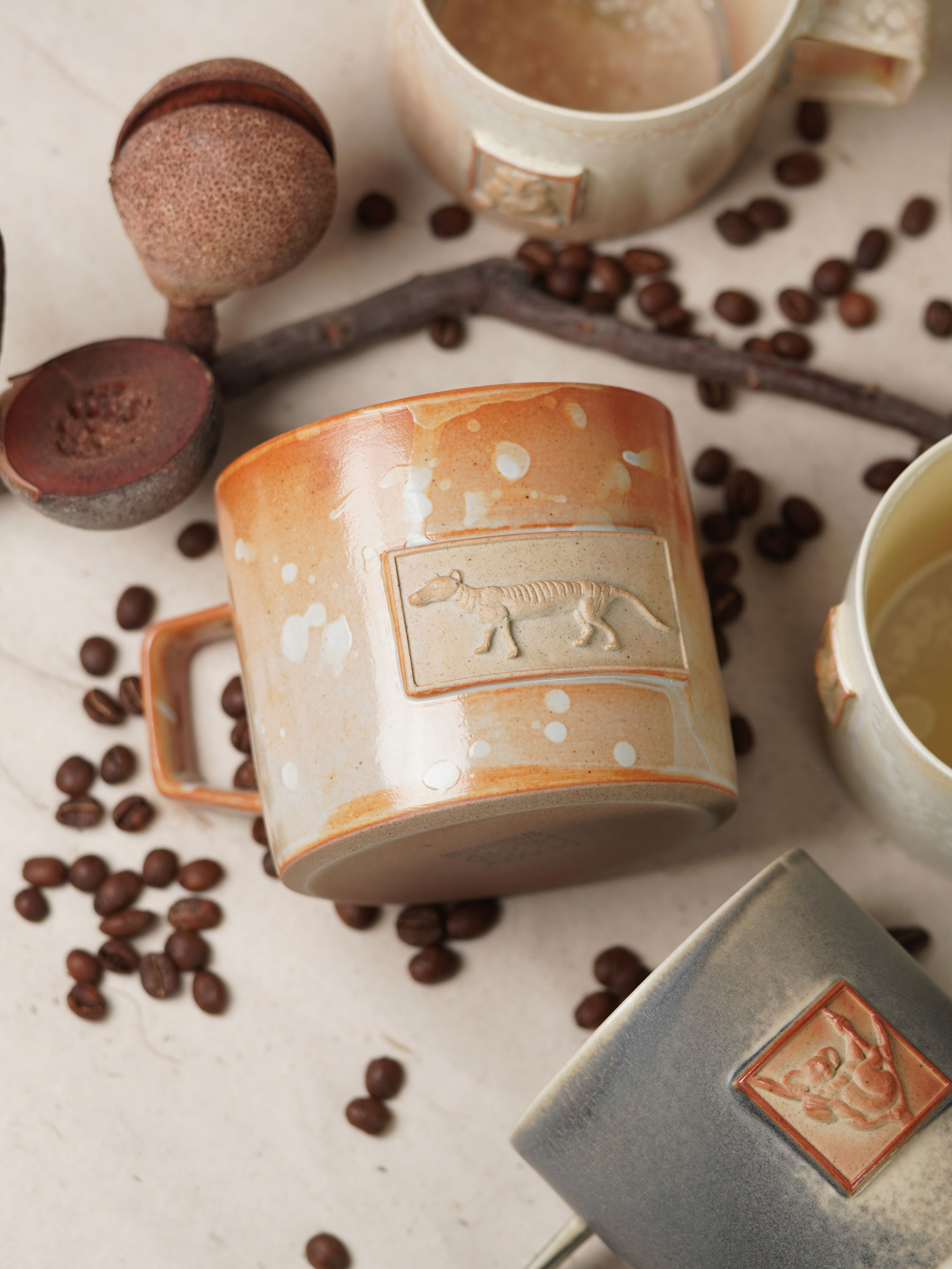 Mysterious Tasmanian Tiger Mug in the new Australian animal series begins its life on the potter’s wheel, formed by hand in clay or porcelain before being coated—inside and out — in food-safe glazes. The small animal tiles are kept unglazed to preserve the raw tactility of the clay. These tiles start as digital 3D sculptures, which are then 3D-printed, moulded in clay, and carefully attached by hand to each vessel. Our Poppy & Pepper mark is applied either through firing or laser engraving on the base.