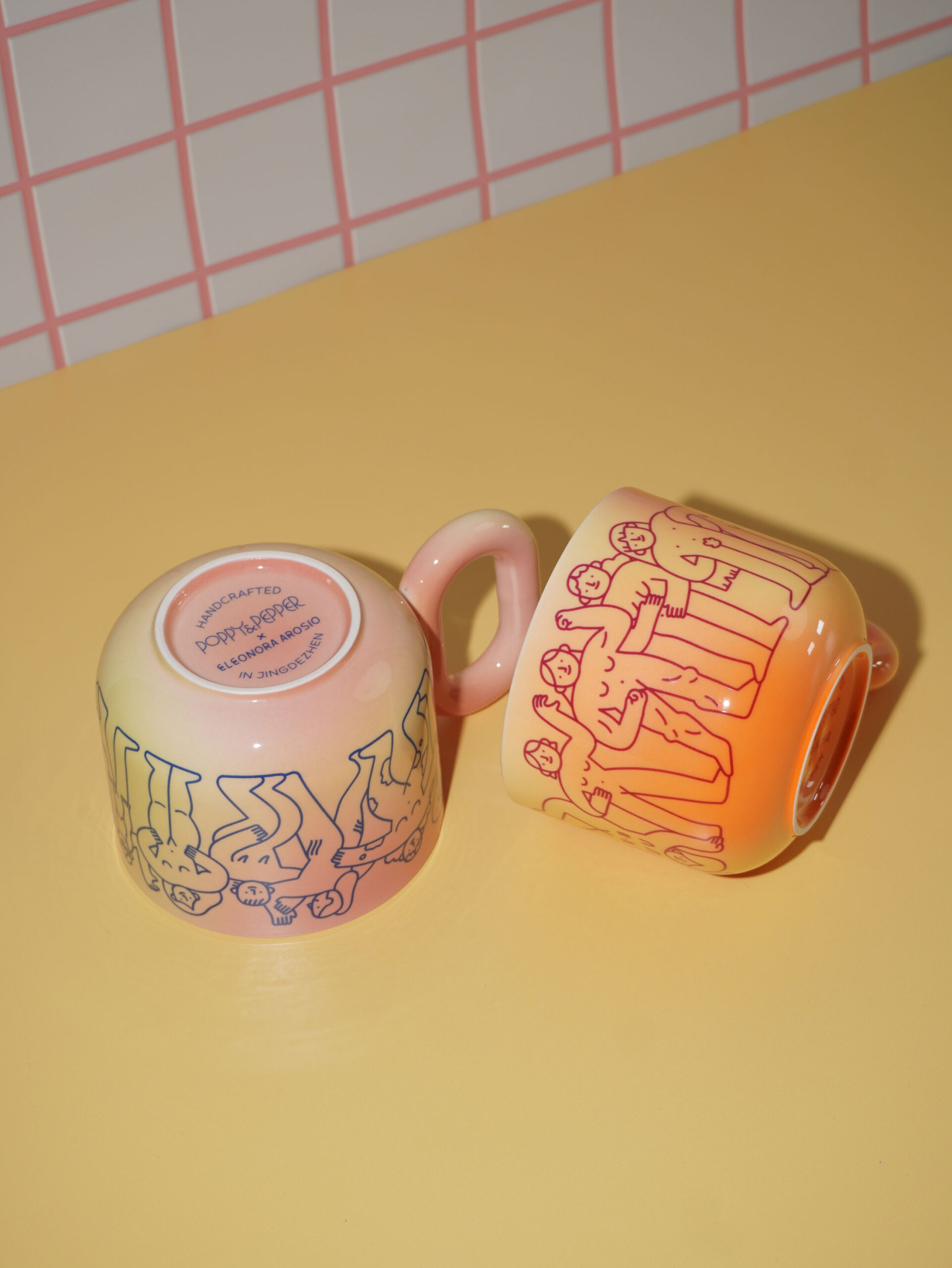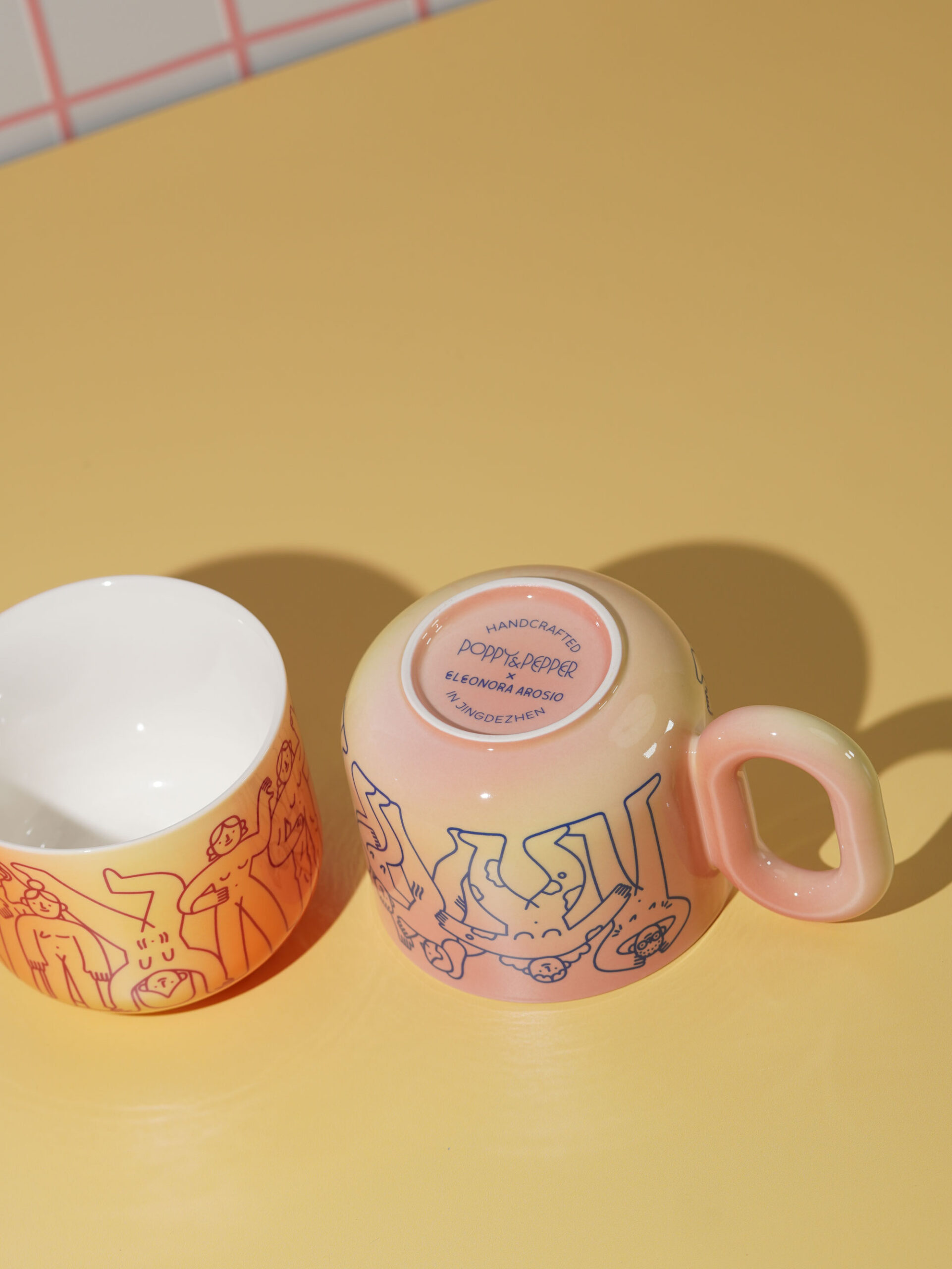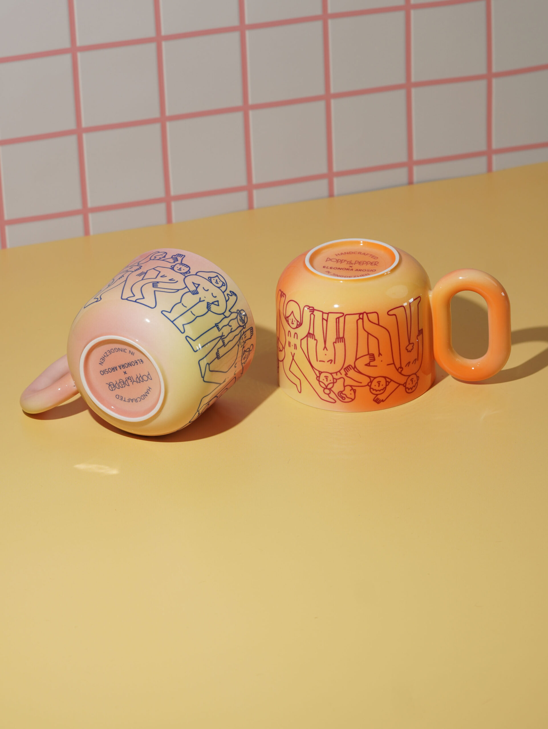 These extra-large mugs feature a round bottom and a playful, thick handle, designed to reflect Eleonora’s whimsical illustrations. Both beautiful and functional, these mugs are made for generous hot drinks, with a handle that’s easy to grip — whether your hands are big or small.