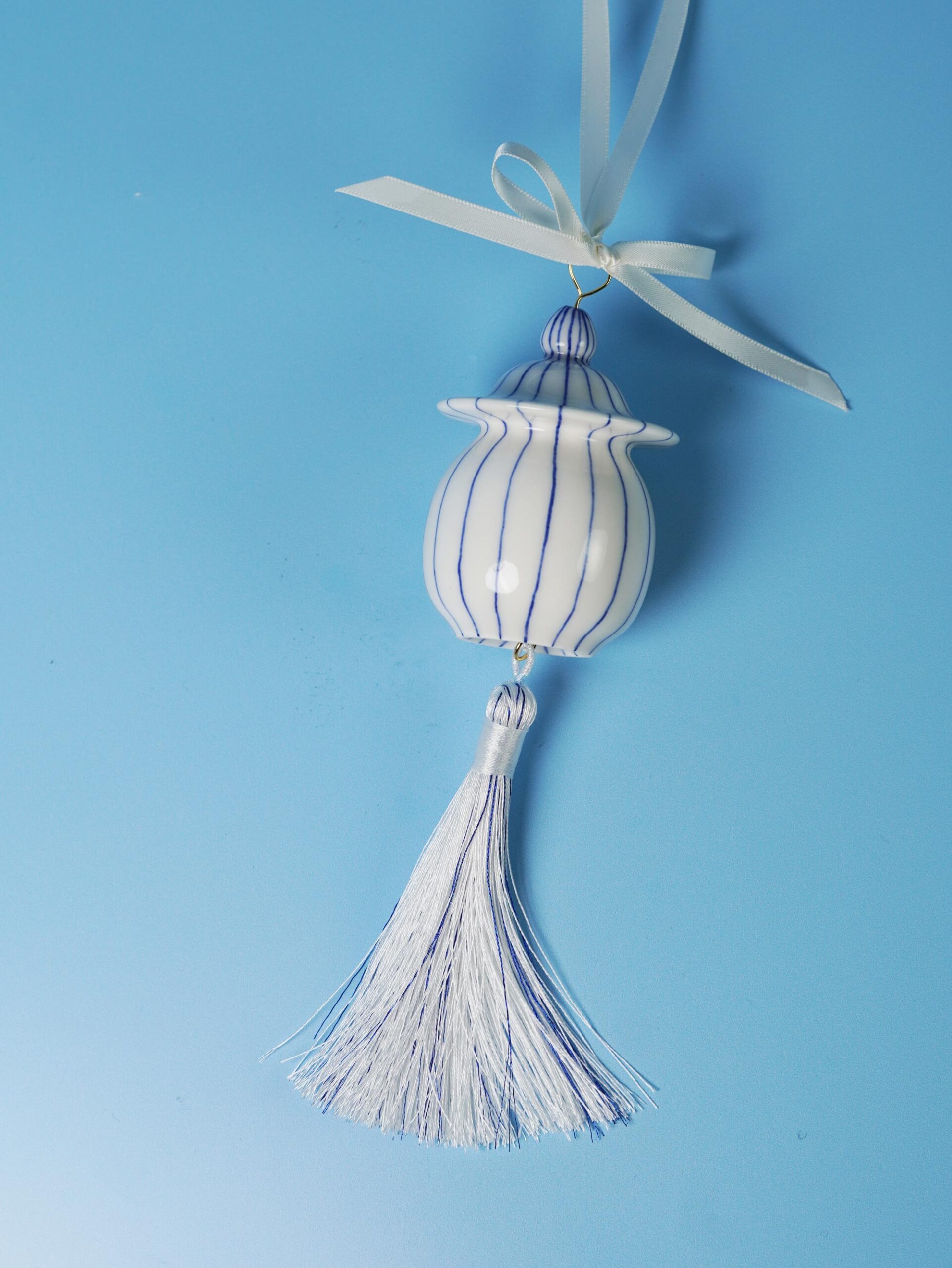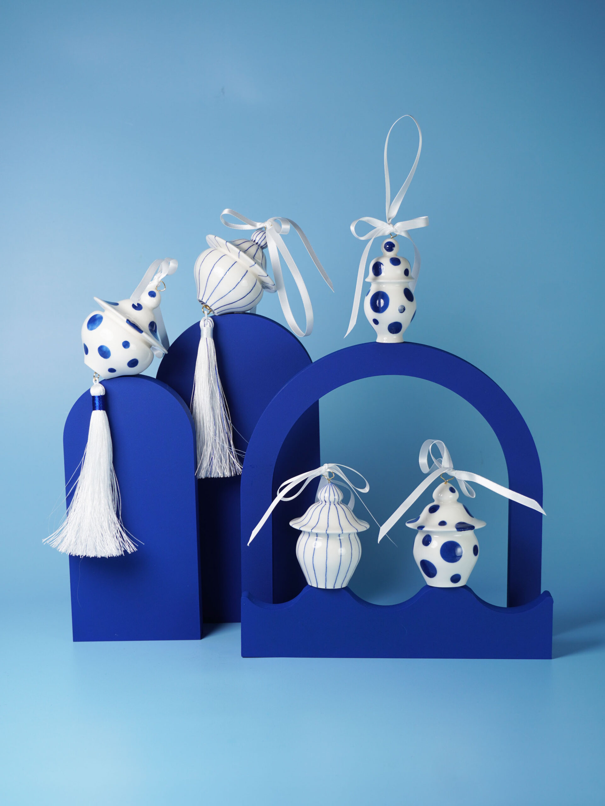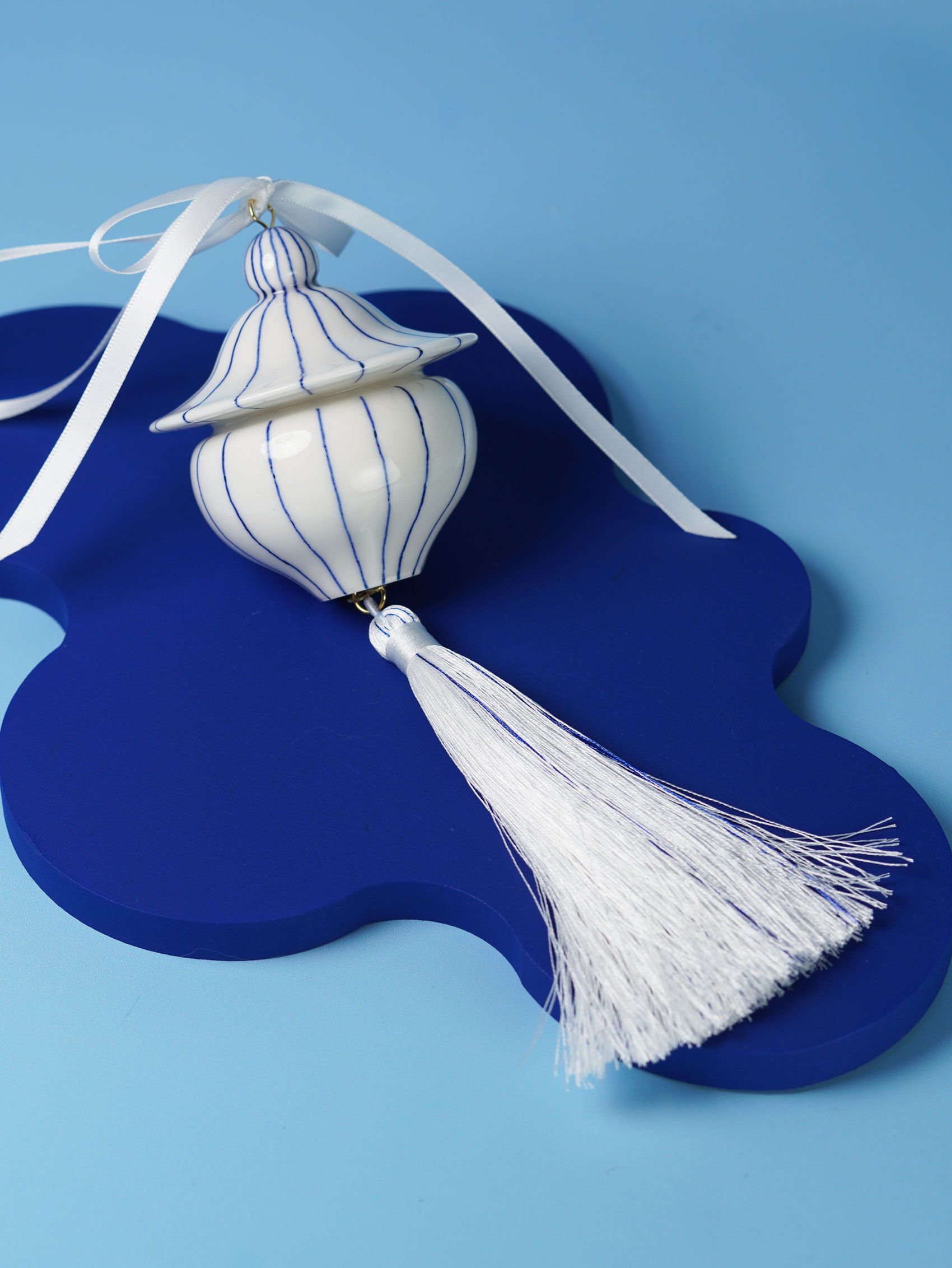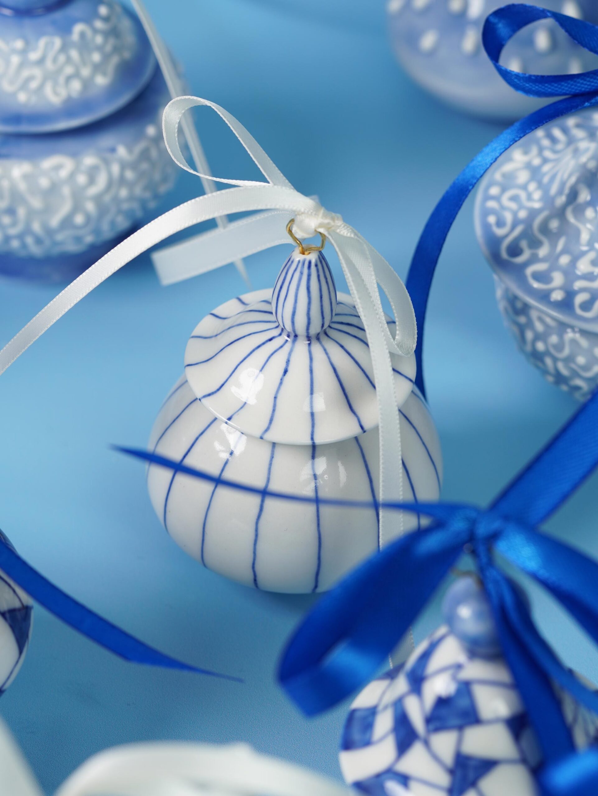 Each piece is slip-cast, hand-decorated with cobalt blue underglaze, and coated in a clear glossy glaze. A soft 18k gold-gilded wire runs through the ornament, ready for hanging. Finished with blue, white, or red ribbons for a festive touch, and some accented with one or more tassels.