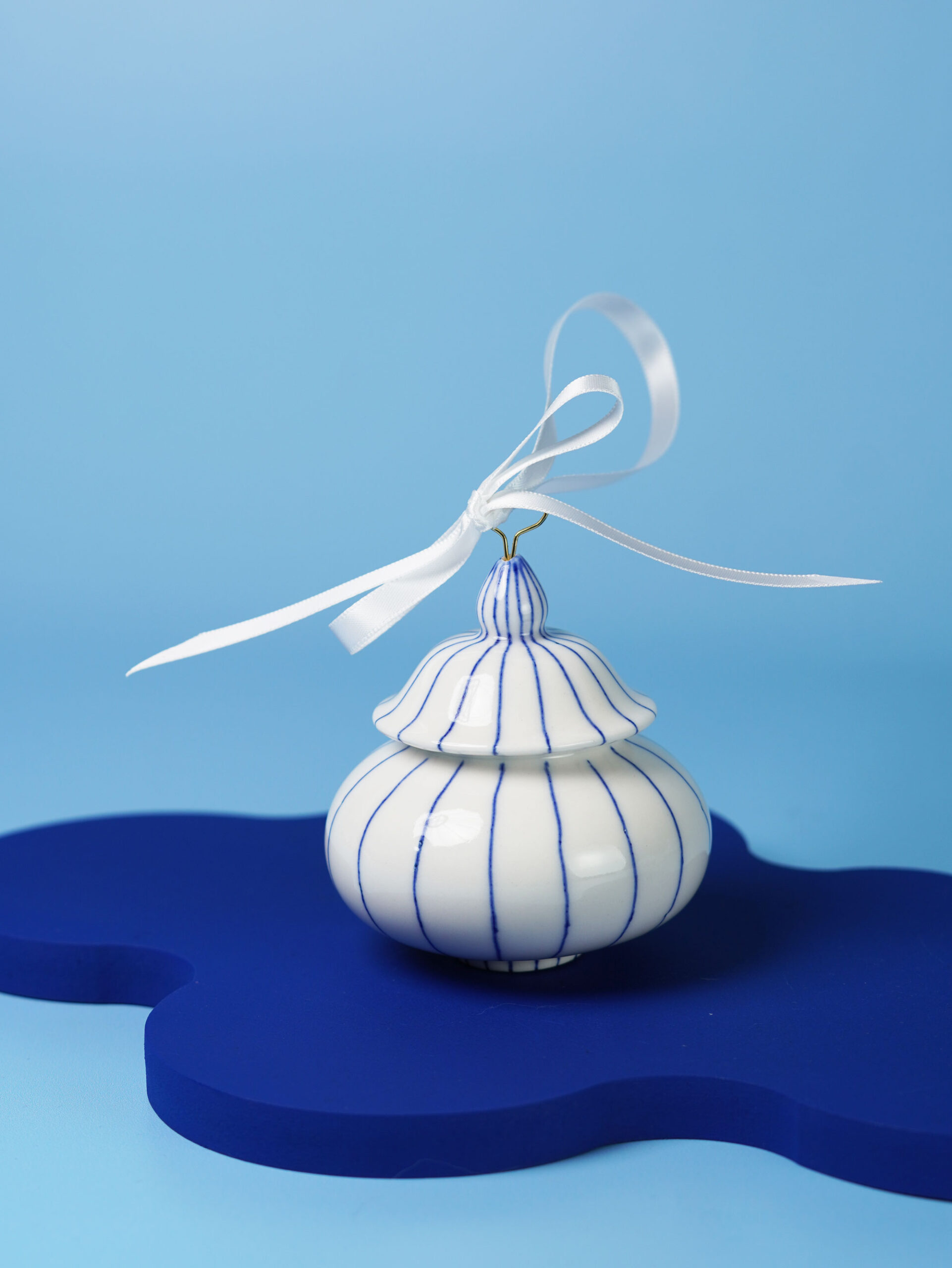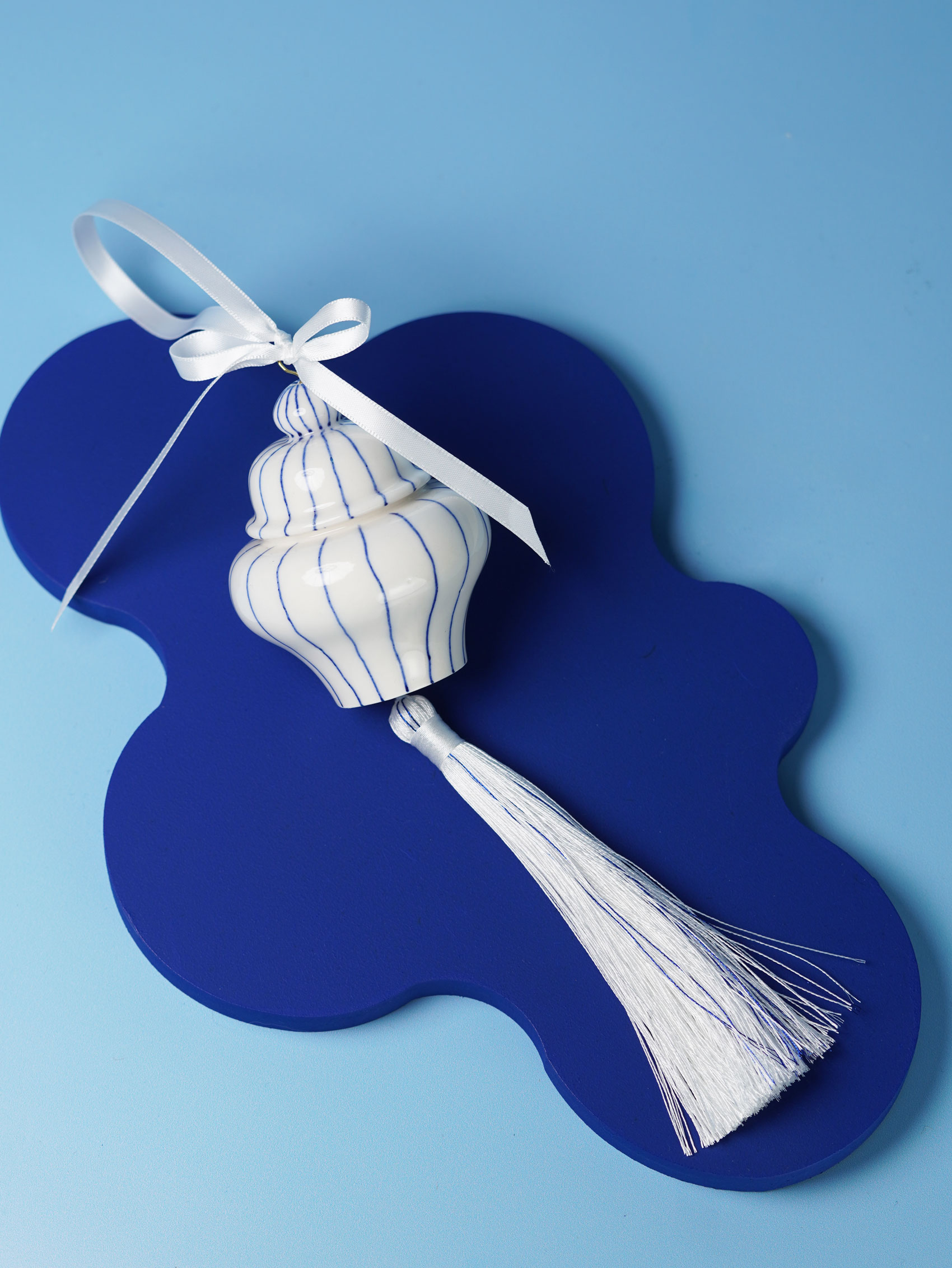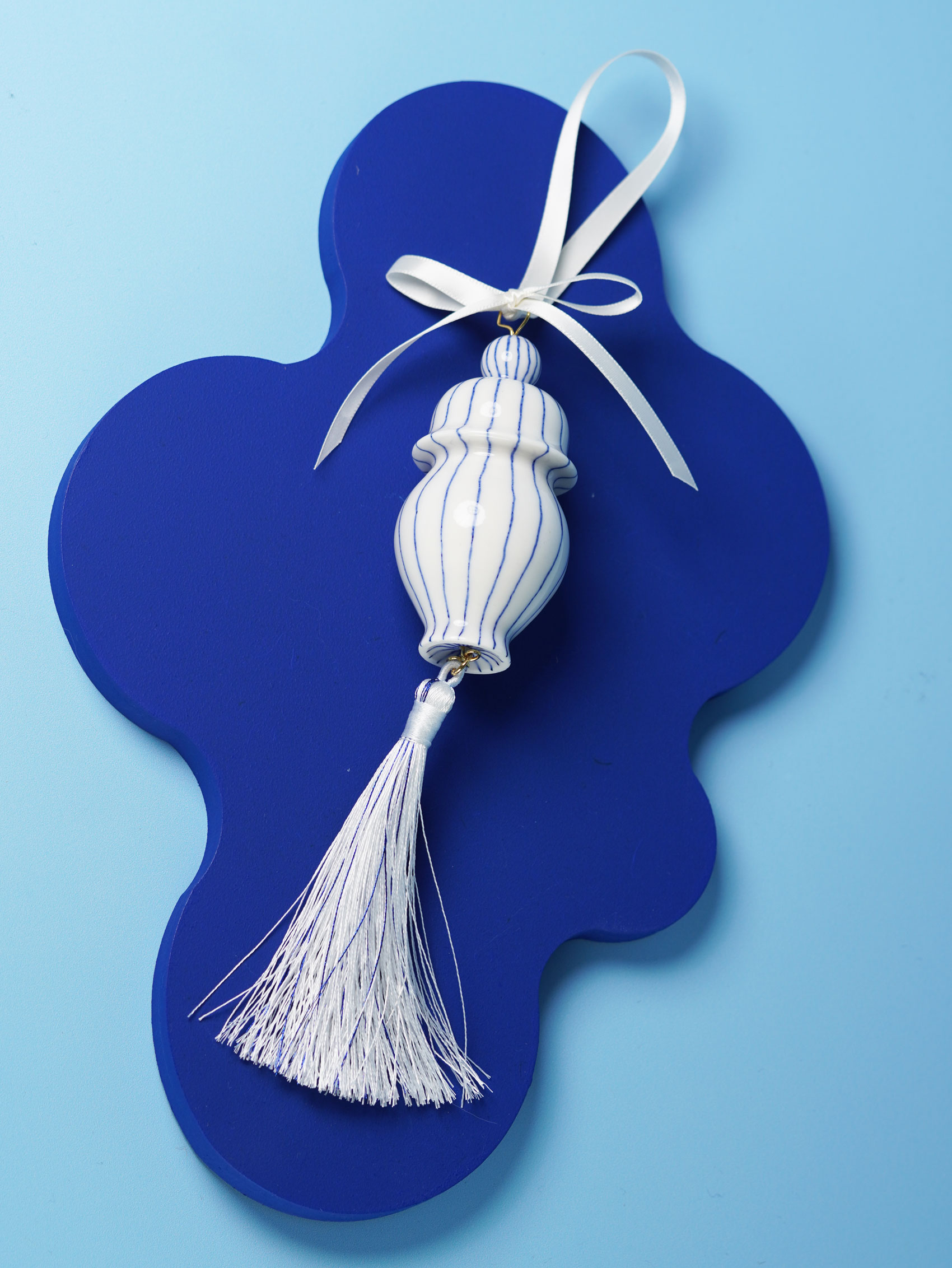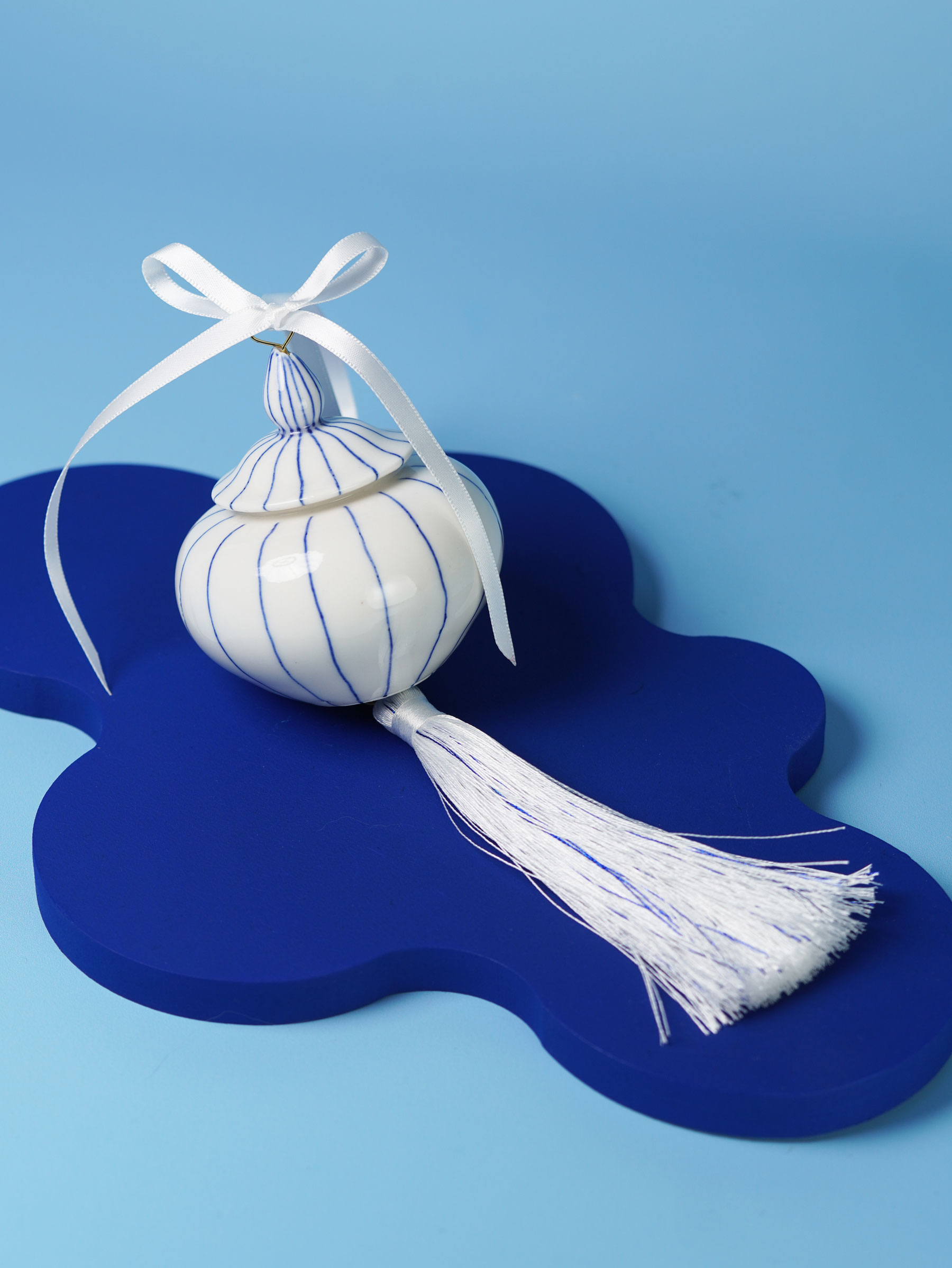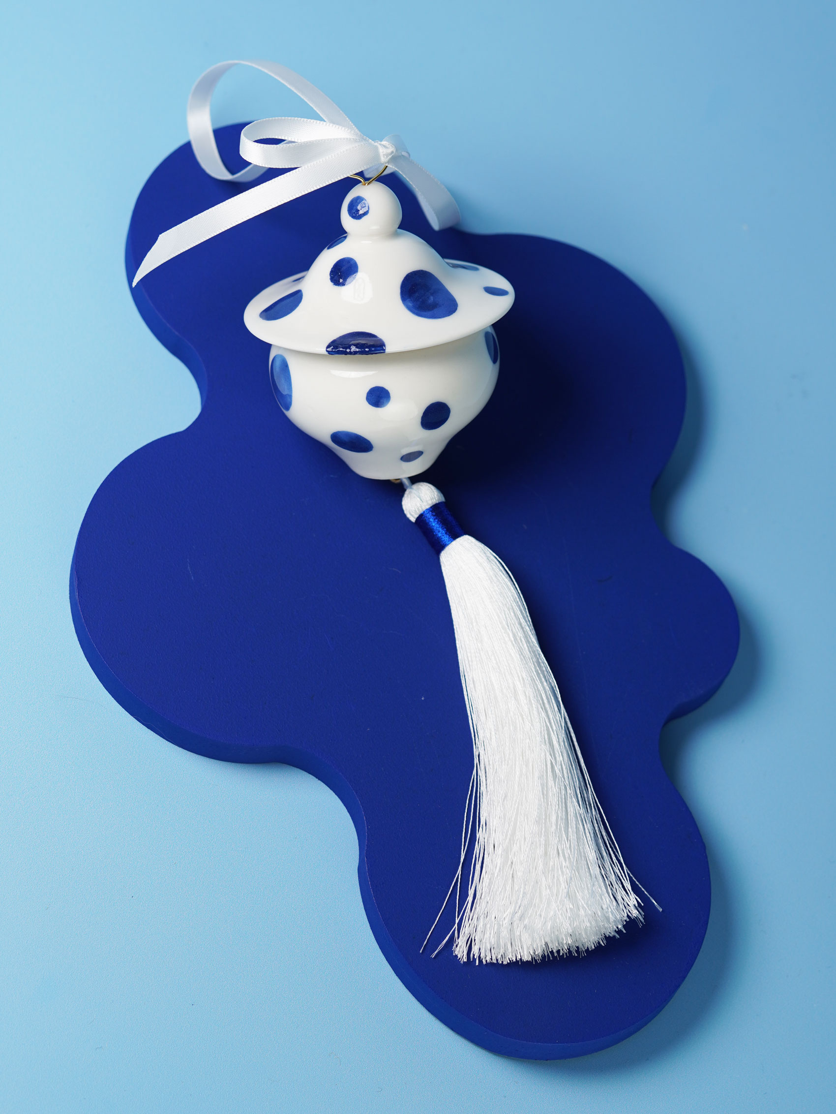 Each piece is slip-cast, hand-decorated with cobalt blue underglaze, and coated in a clear glossy glaze. A soft 18k gold-gilded wire runs through the ornament, ready for hanging. Finished with blue, white, or red ribbons for a festive touch, and some accented with one or more tassels.