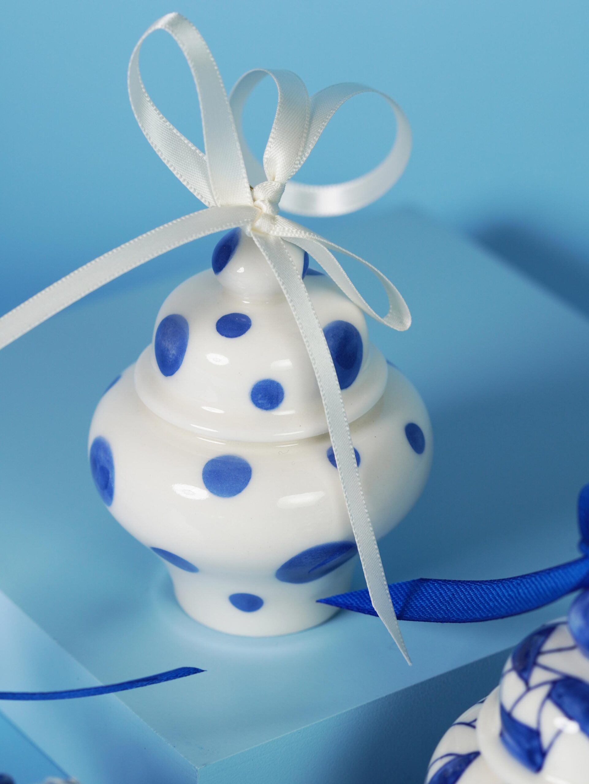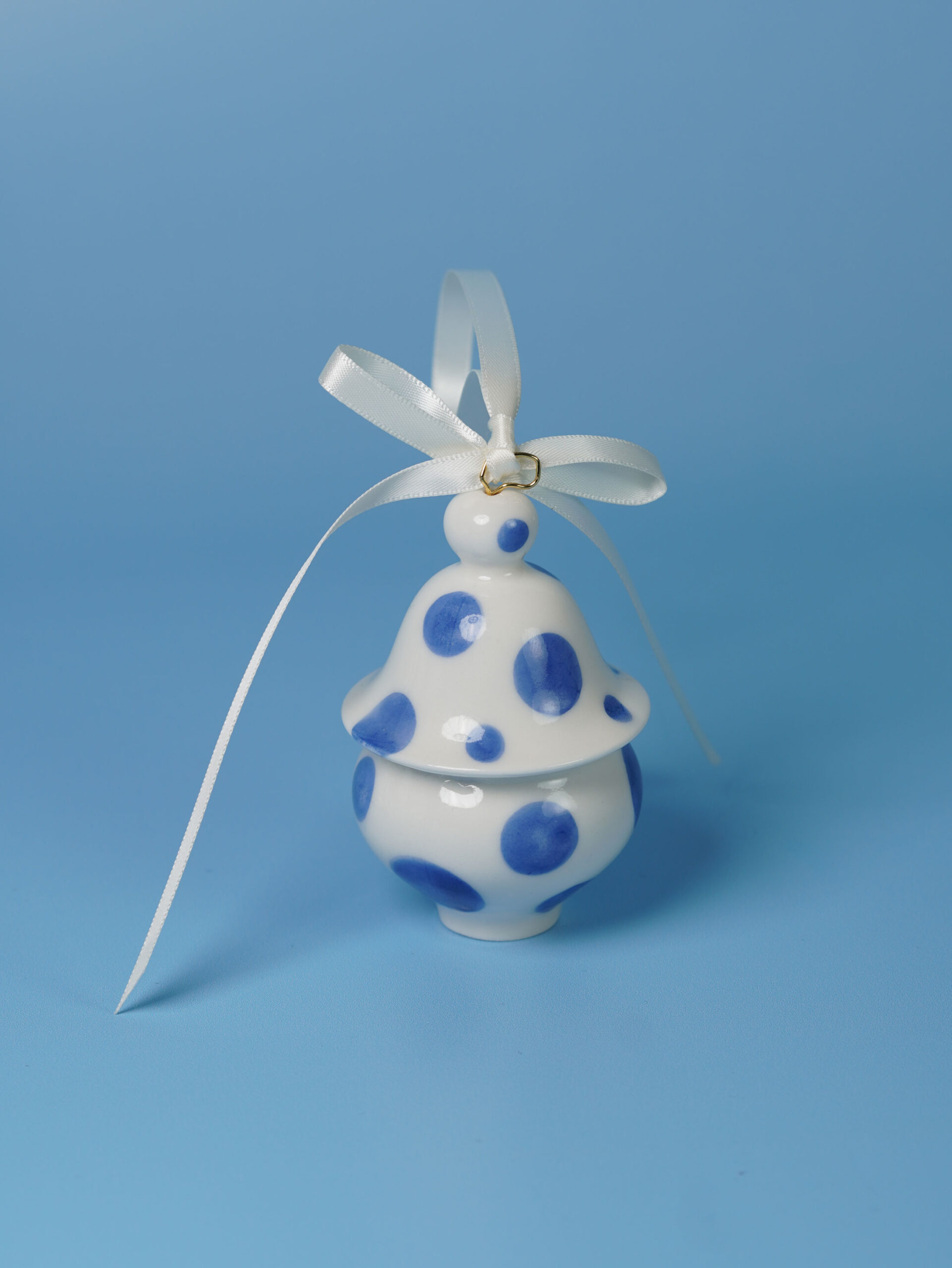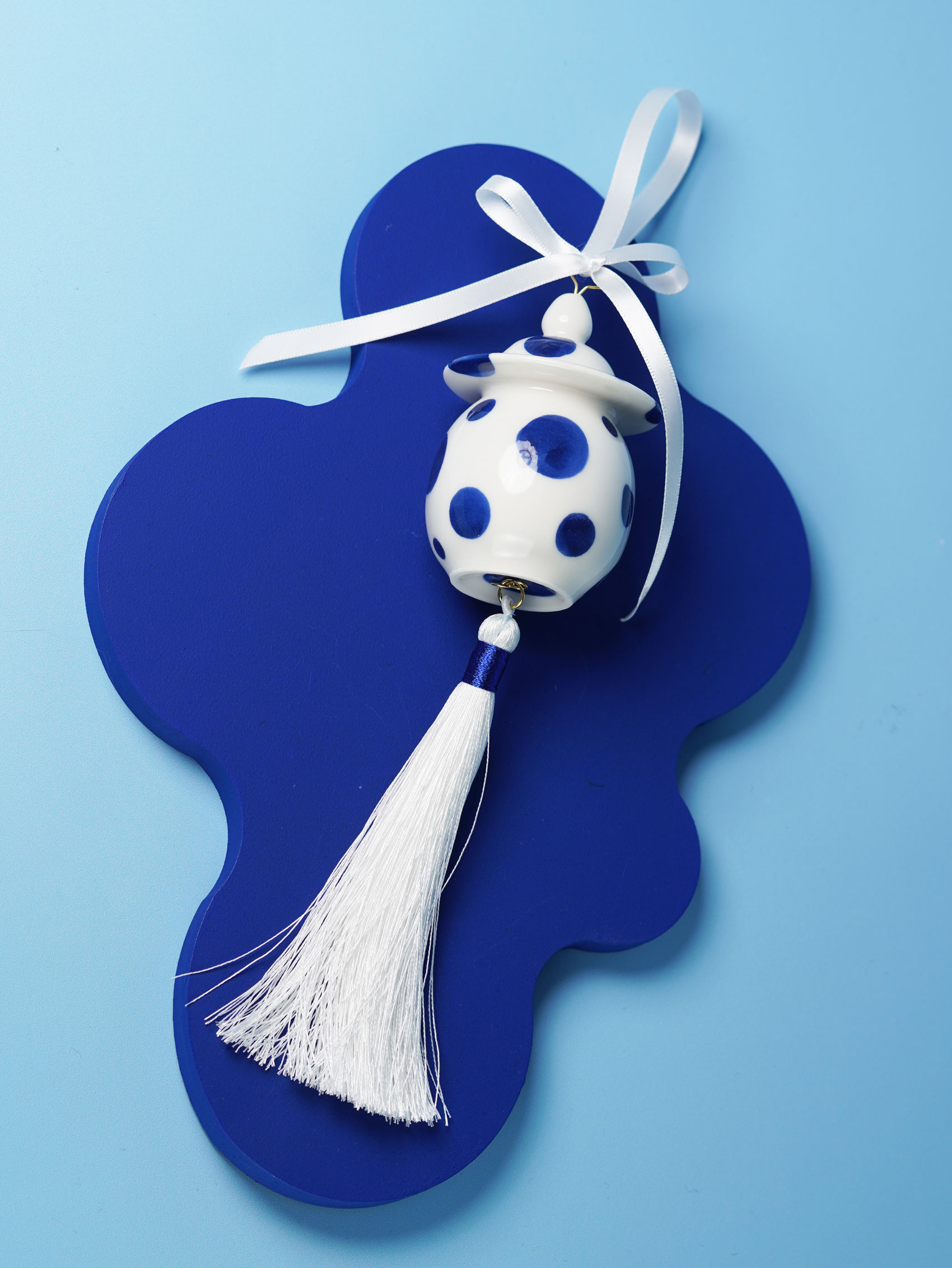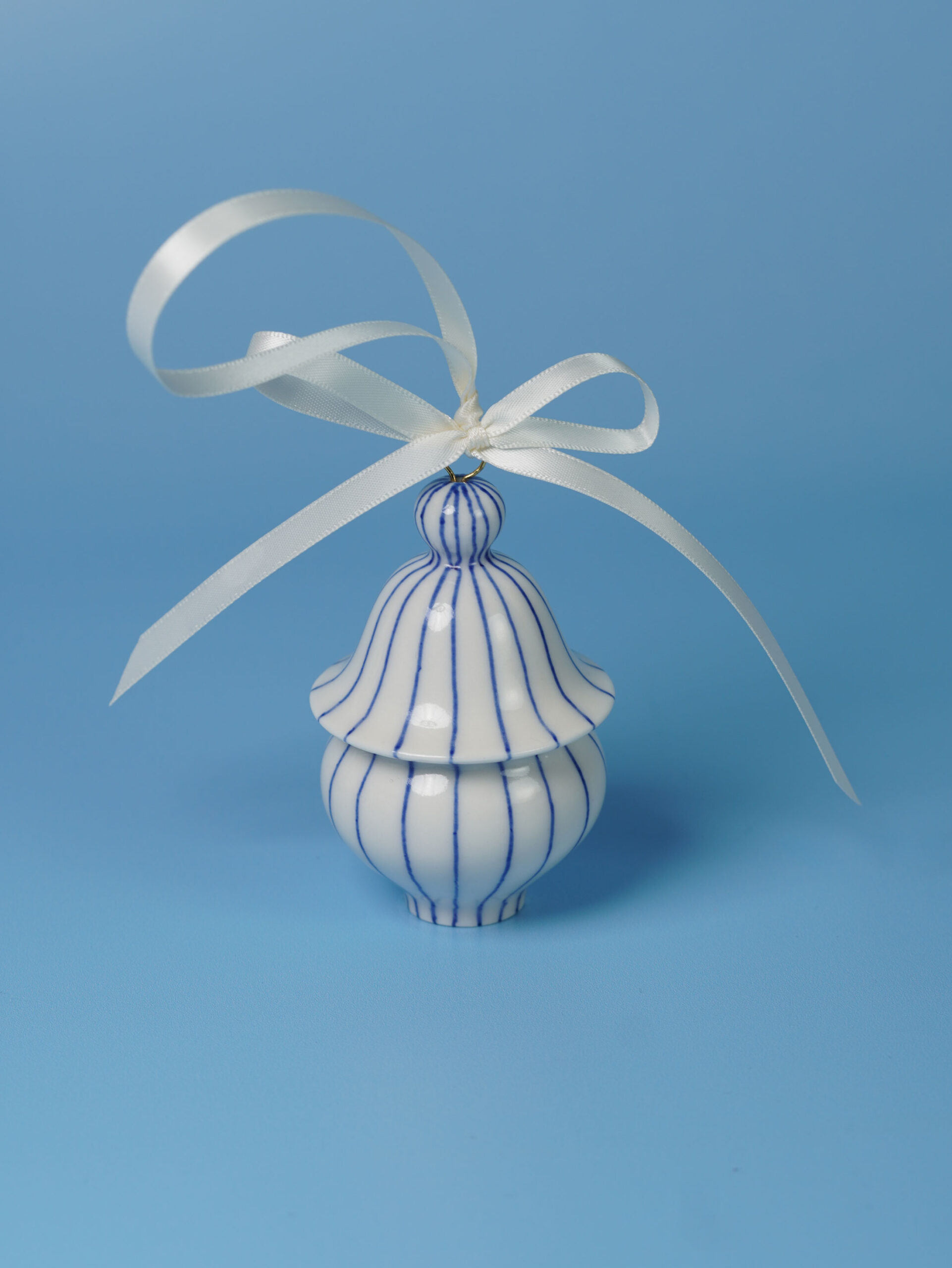Each piece is slip-cast, hand-decorated with cobalt blue underglaze, and coated in a clear glossy glaze. A soft 18k gold-gilded wire runs through the ornament, ready for hanging. Finished with blue, white, or red ribbons for a festive touch, and some accented with one or more tassels.