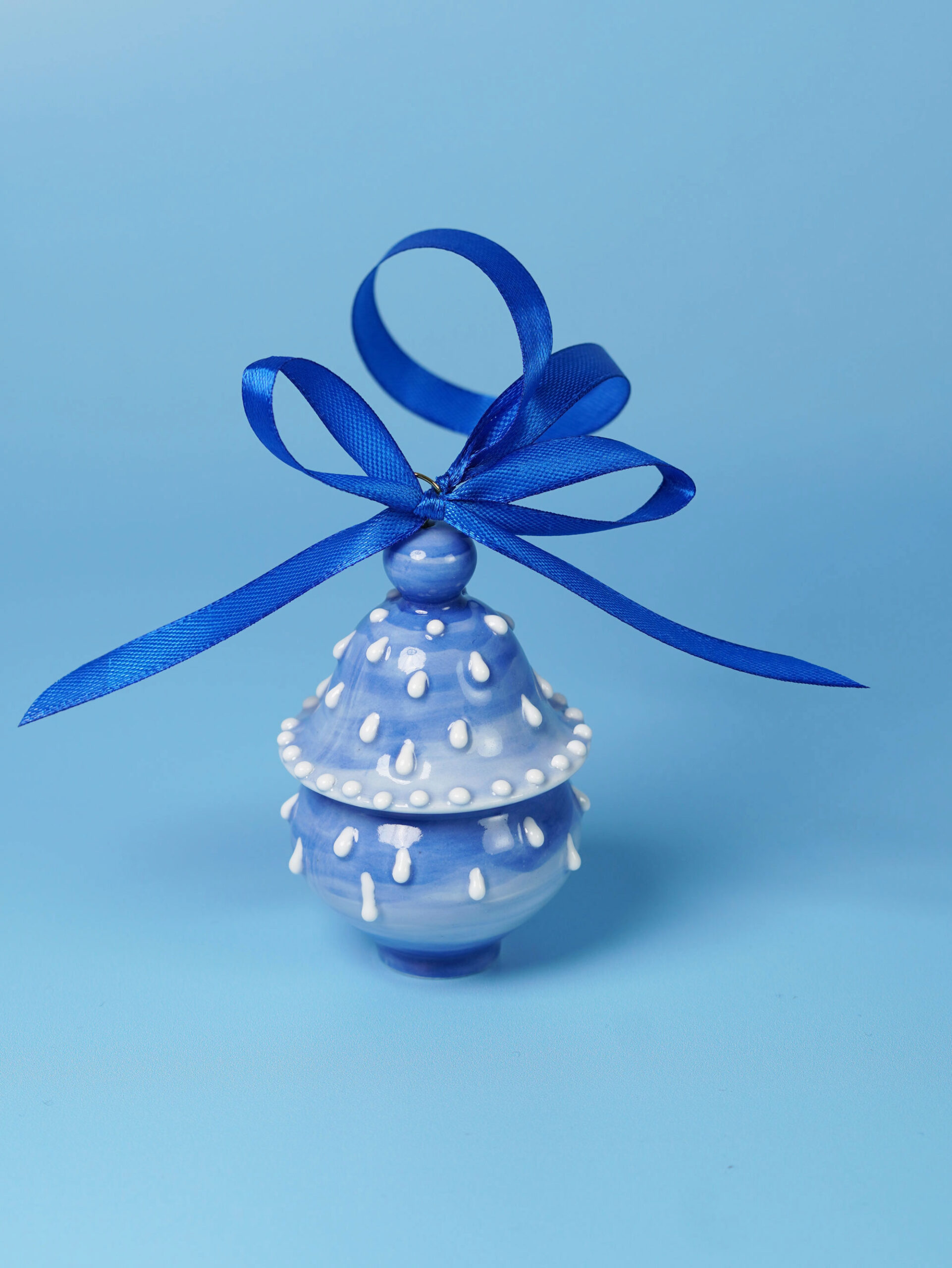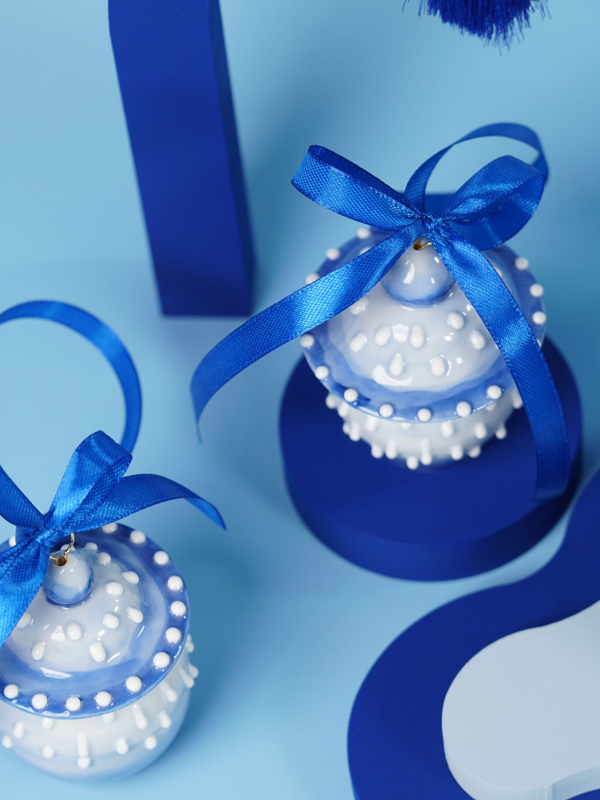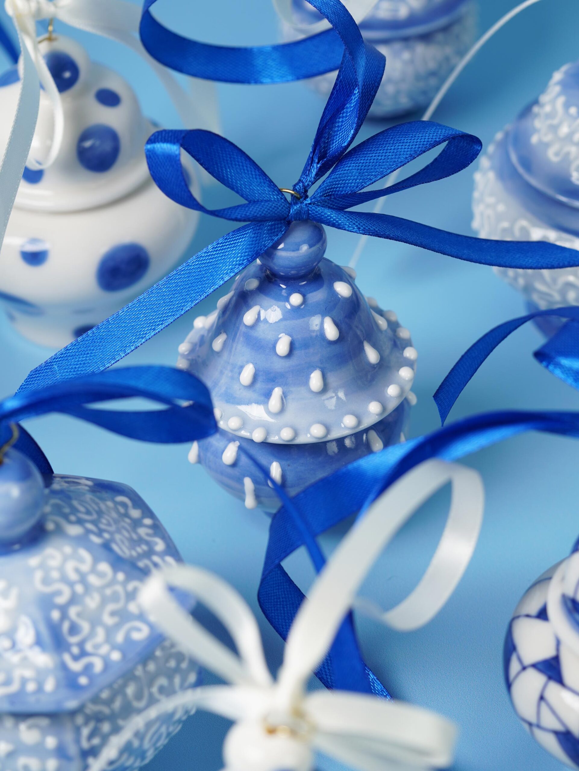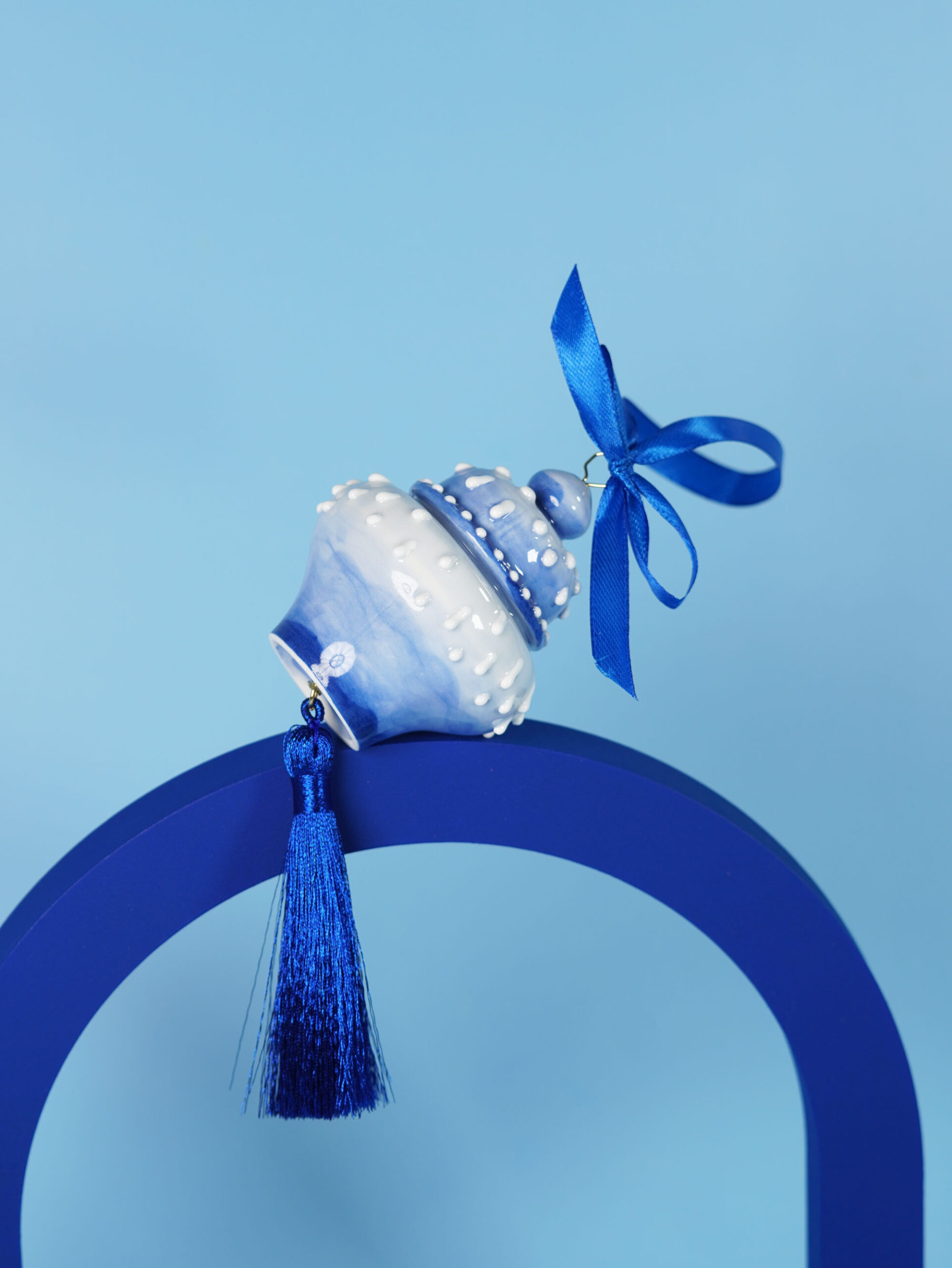 Each piece is slip-cast, hand-decorated with cobalt blue underglaze, and coated in a clear glossy glaze. A soft 18k gold-gilded wire runs through the ornament, ready for hanging. Finished with blue, white, or red ribbons for a festive touch, and some accented with one or more tassels.