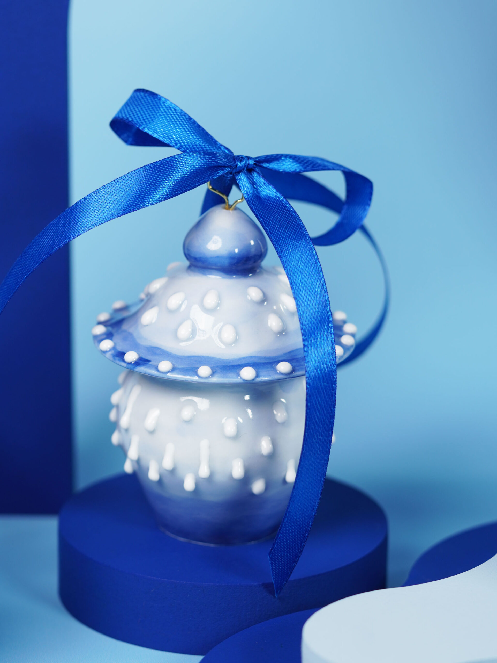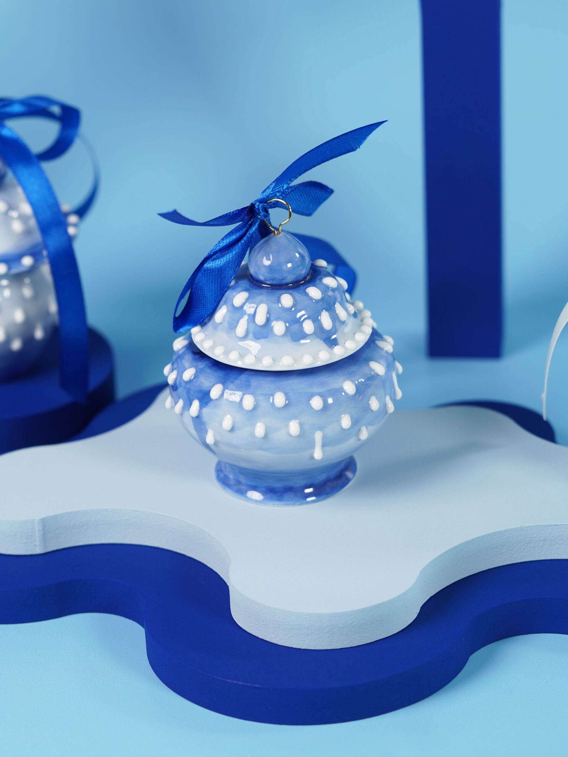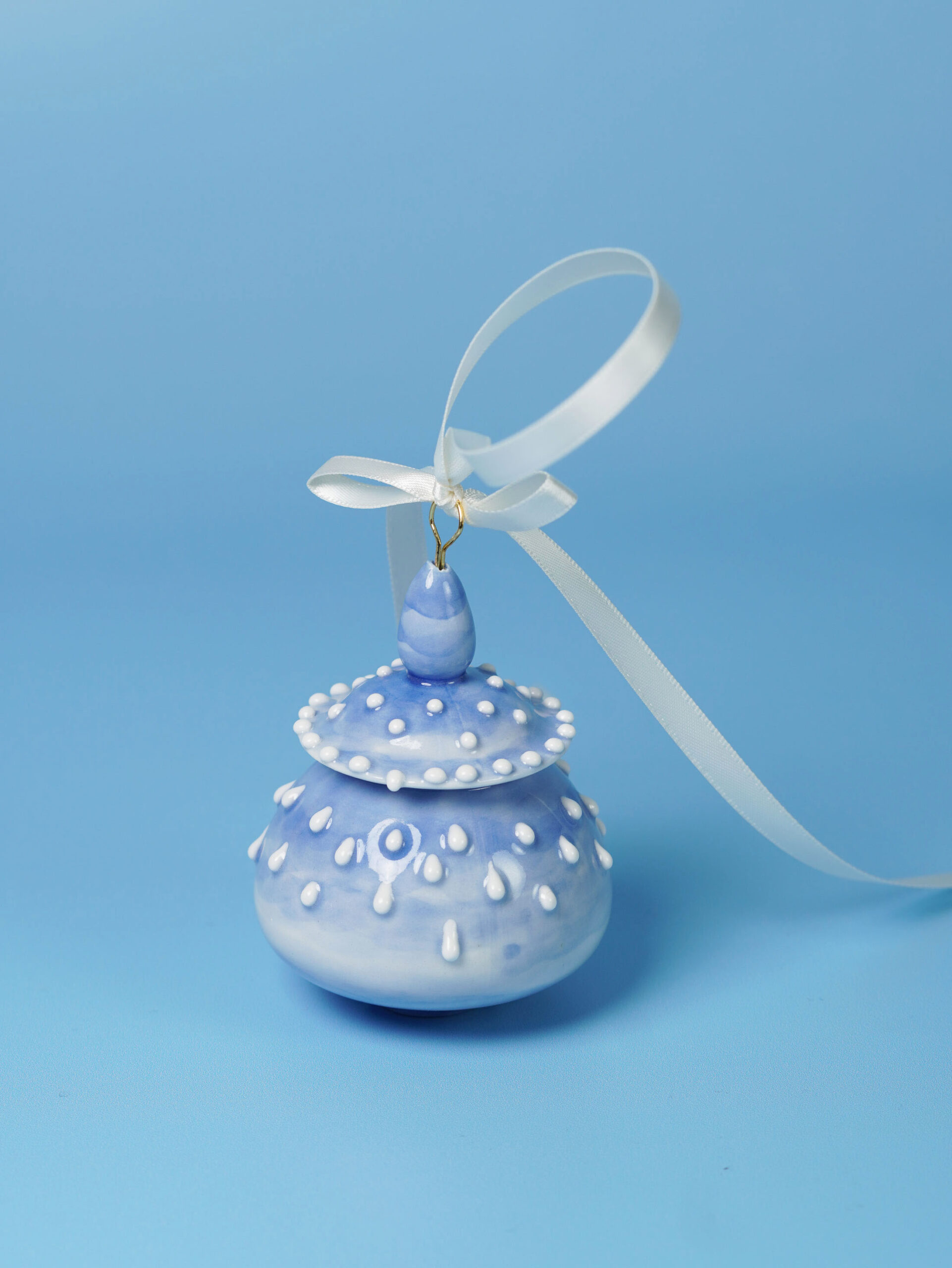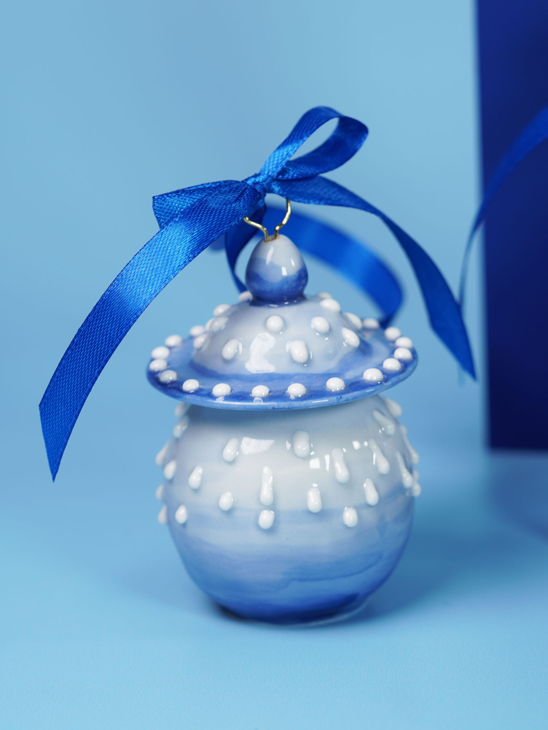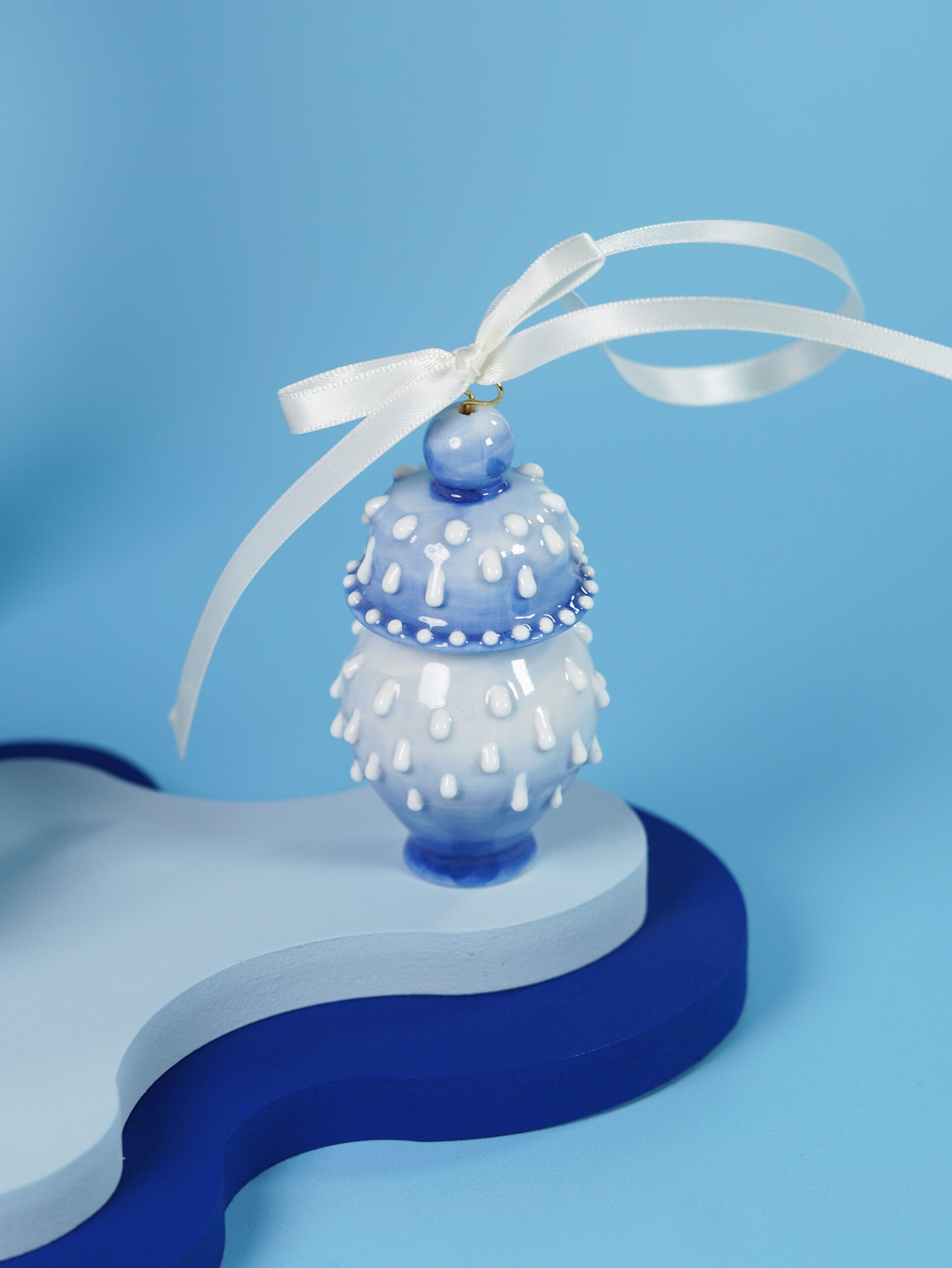 Each piece is slip-cast, hand-decorated with cobalt blue underglaze, and coated in a clear glossy glaze. A soft 18k gold-gilded wire runs through the ornament, ready for hanging. Finished with blue, white, or red ribbons for a festive touch, and some accented with one or more tassels.