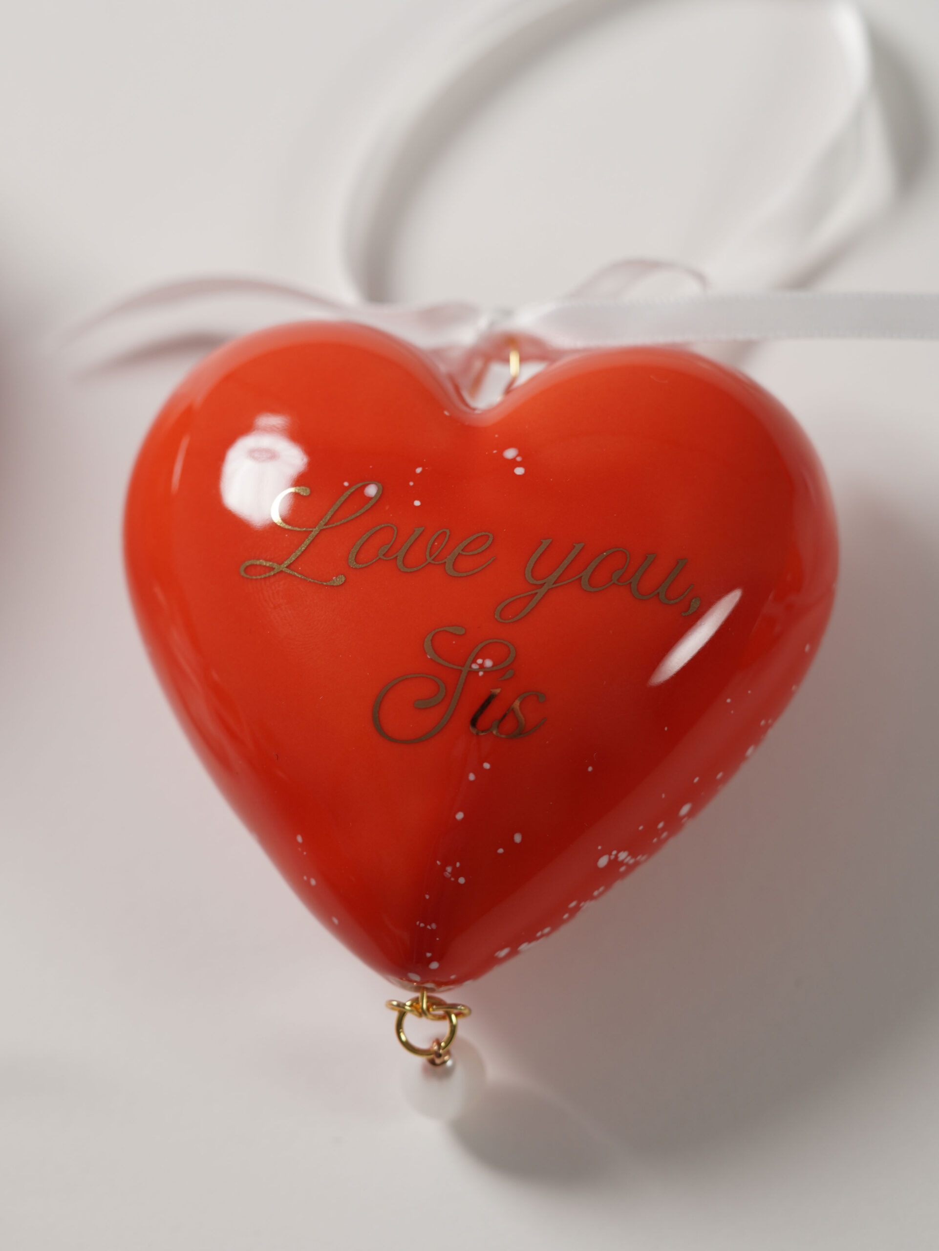 Each piece is slip-cast, hand-decorated with cobalt blue underglaze, and coated in a clear glossy glaze. Screen-printed Love quotes are fired again over glaze. A soft 18k gold-gilded wire runs through the ornament, ready for hanging. Finished with white ribbons for a festive touch, and accented with a faux teardrop shaped pearl.