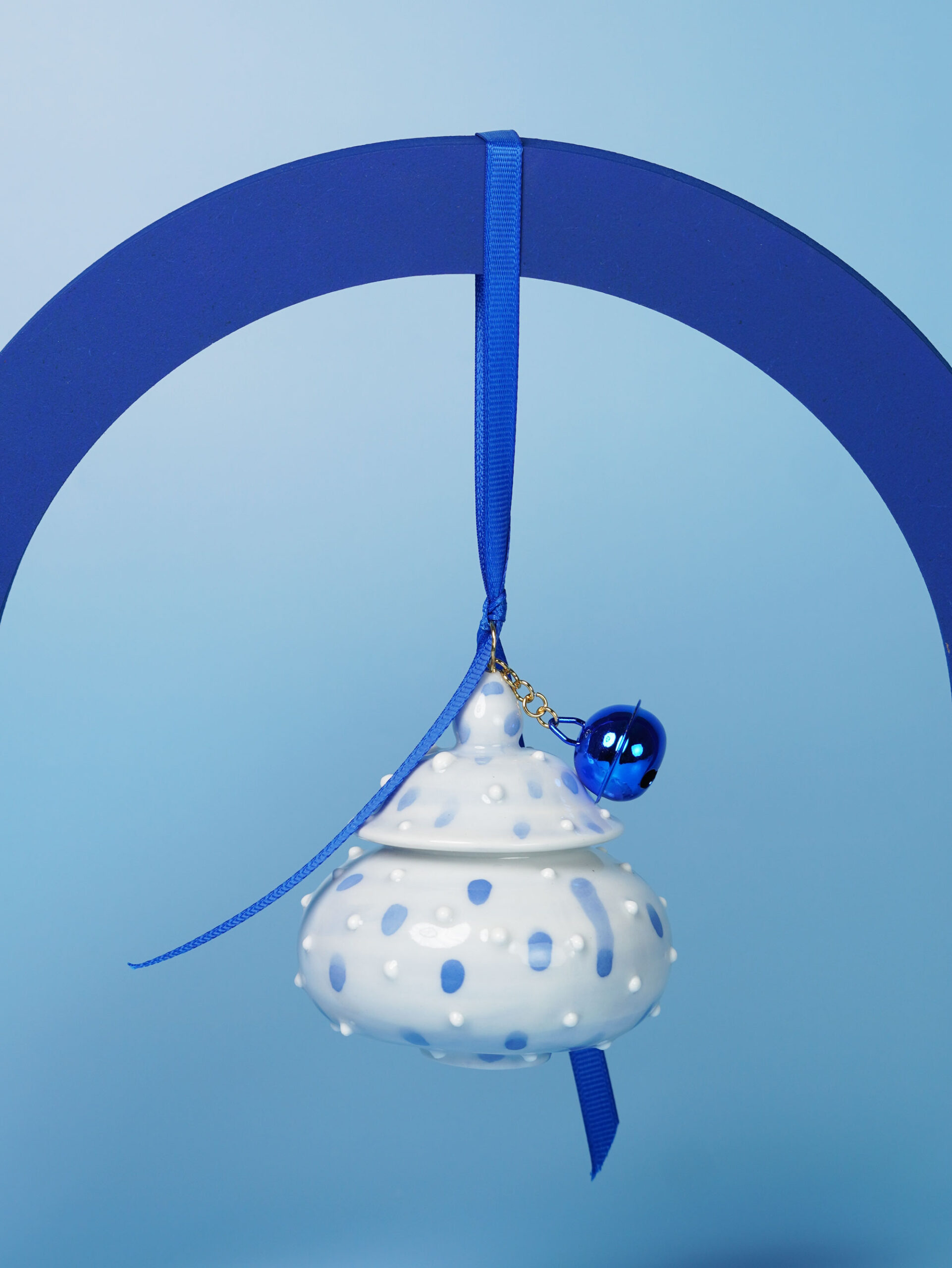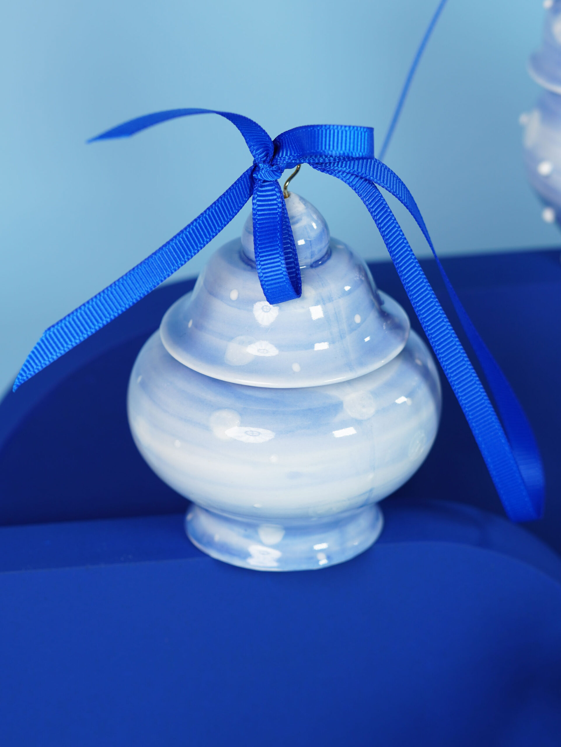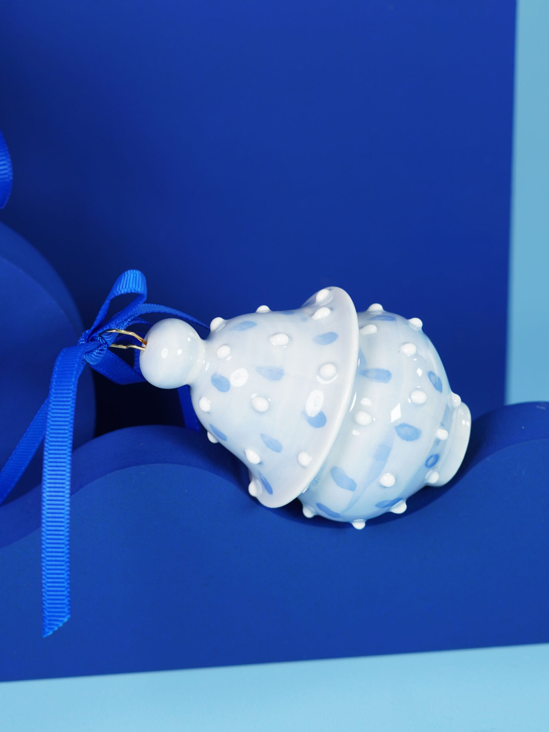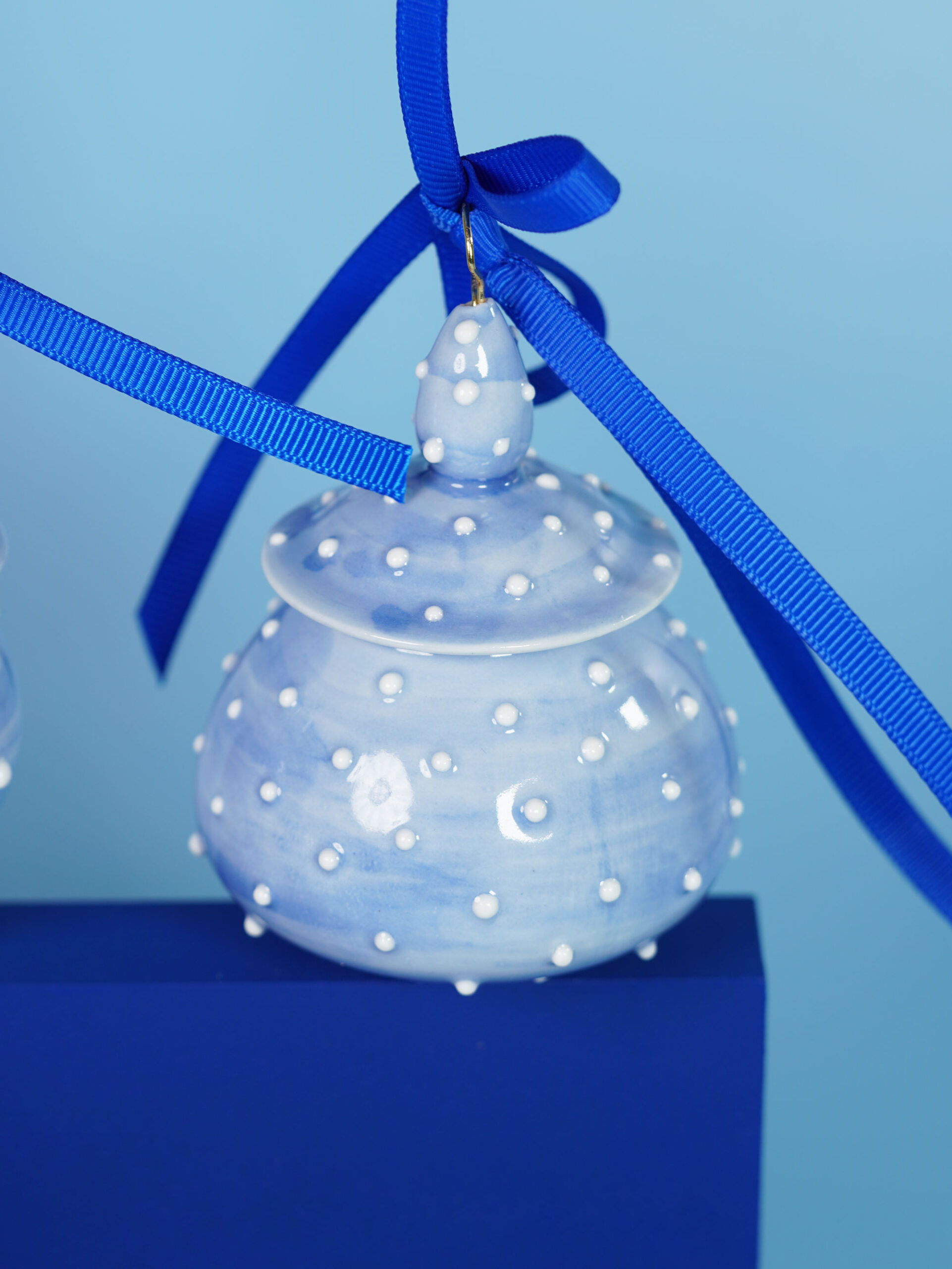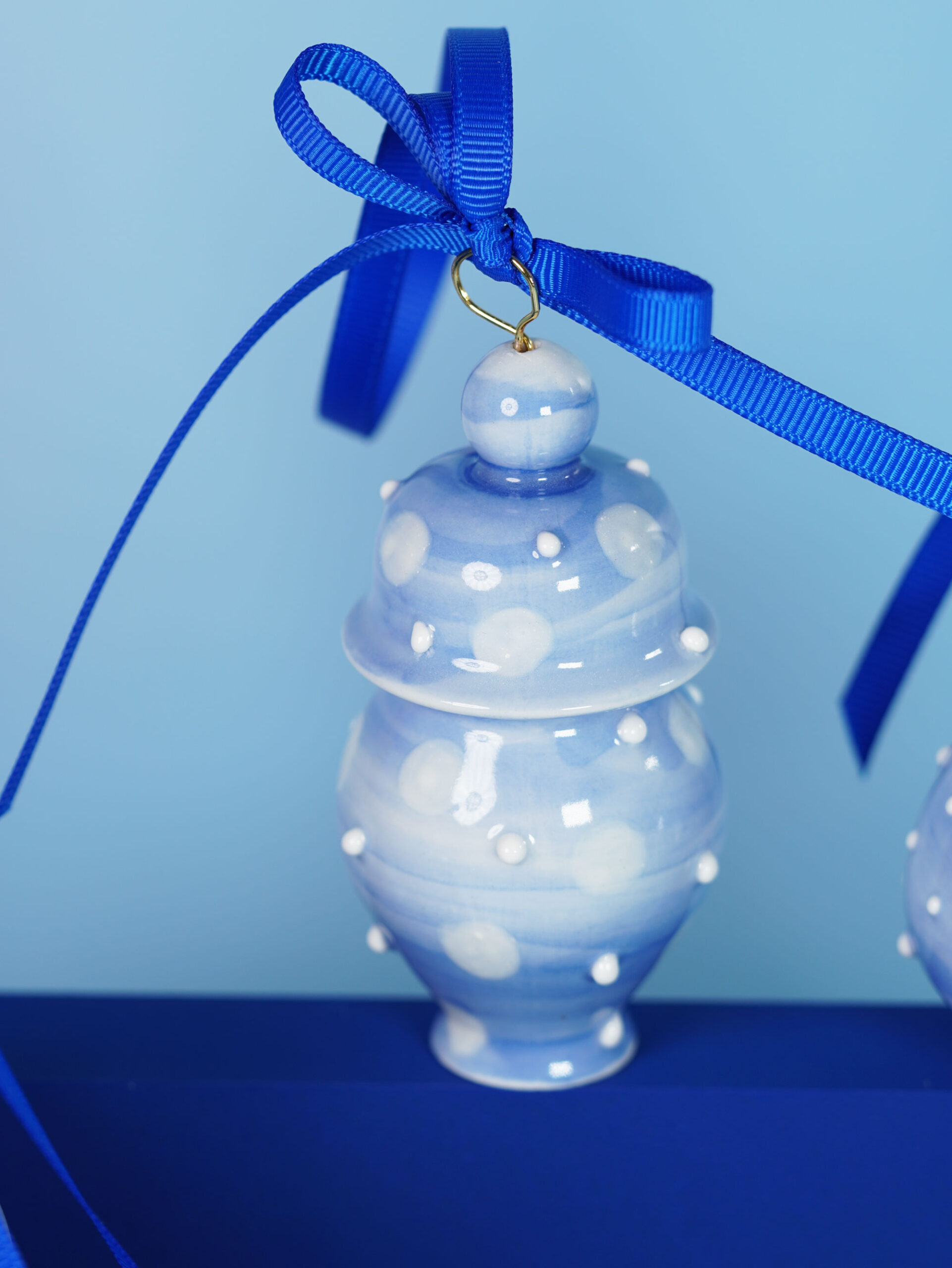 Each piece is slip-cast, hand-decorated with cobalt blue underglaze, and coated in a clear glossy glaze. A soft 18k gold-gilded wire runs through the ornament, ready for hanging. Finished with blue, white, or red ribbons for a festive touch, and some accented with one or more tassels.