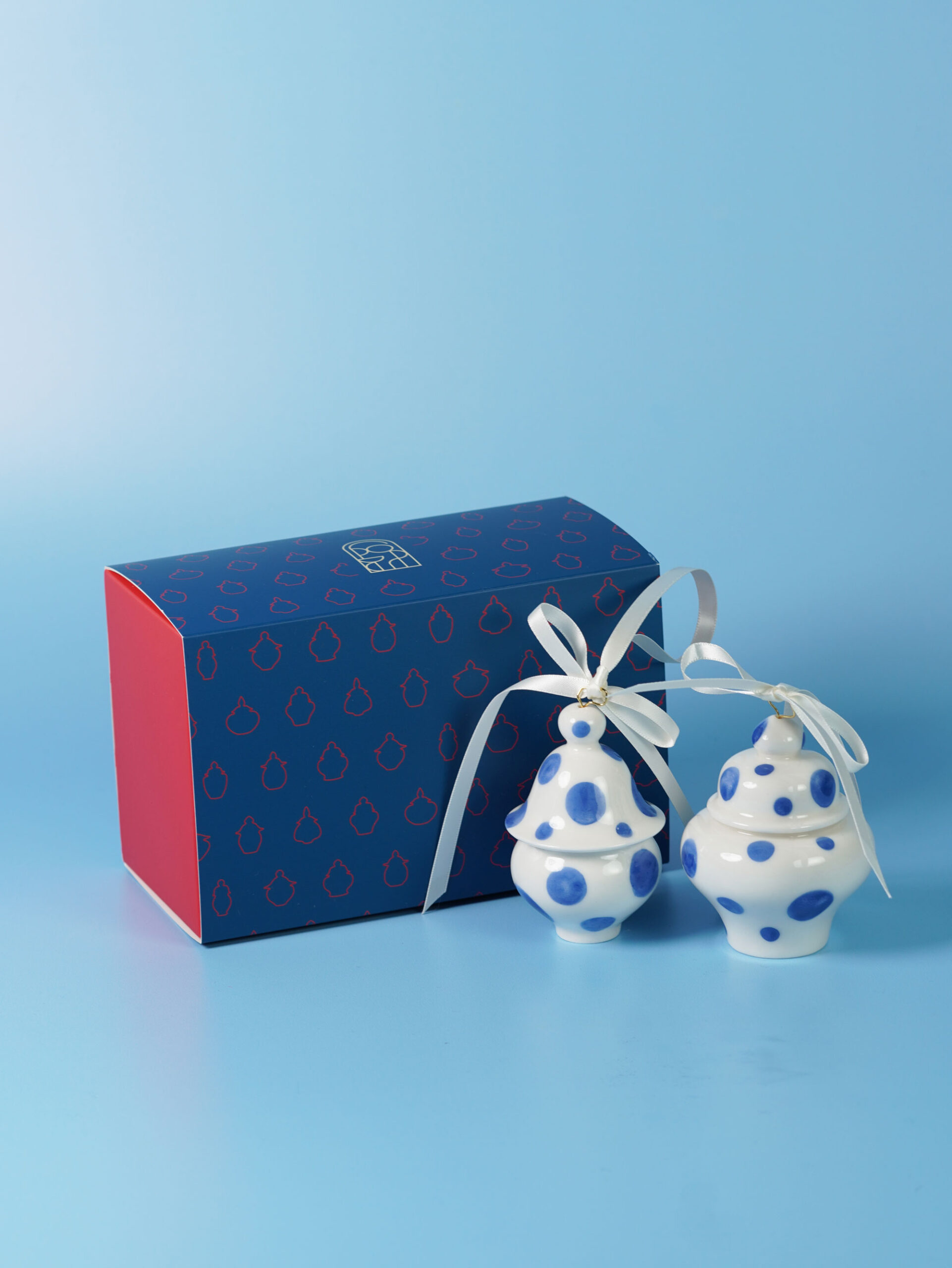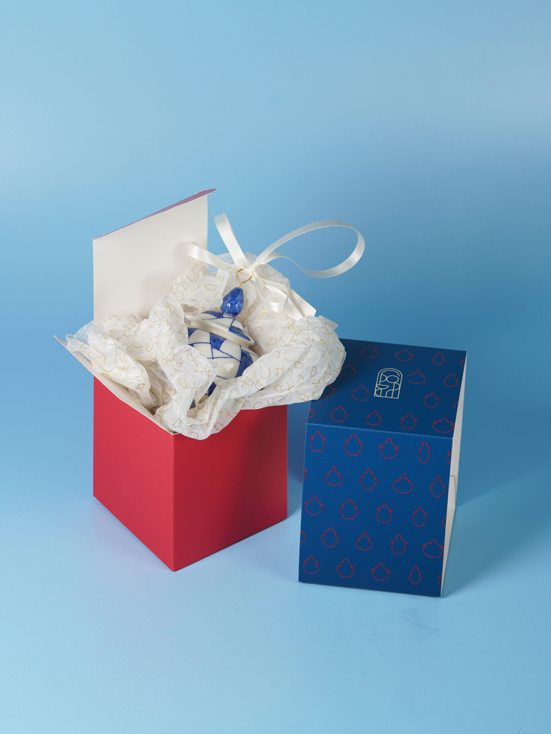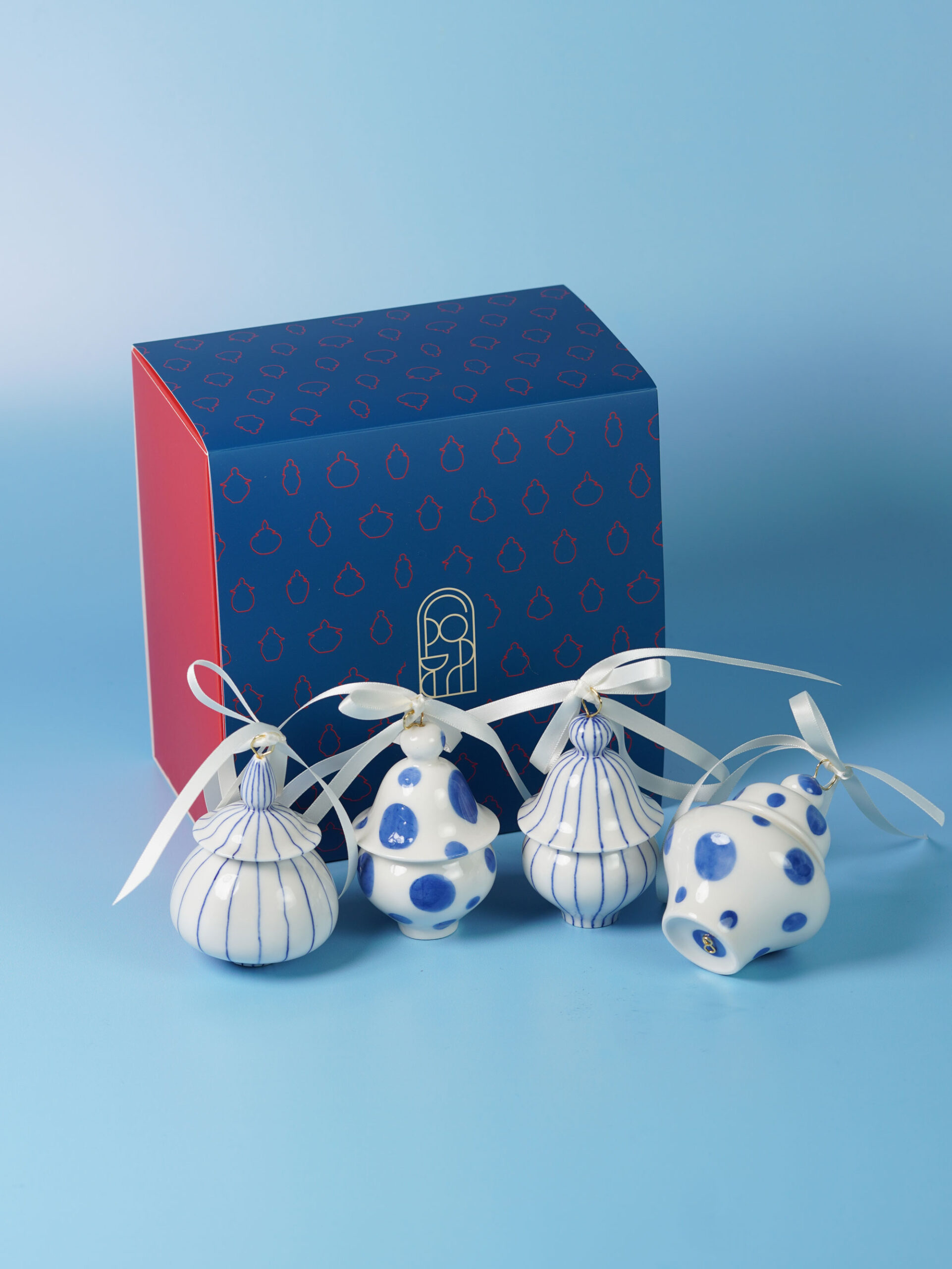 Each piece is slip-cast, hand-decorated with cobalt blue underglaze, and coated in a clear glossy glaze. A soft 18k gold-gilded wire runs through the ornament, ready for hanging. Finished with blue, white, or red ribbons for a festive touch, and some accented with one or more tassels.