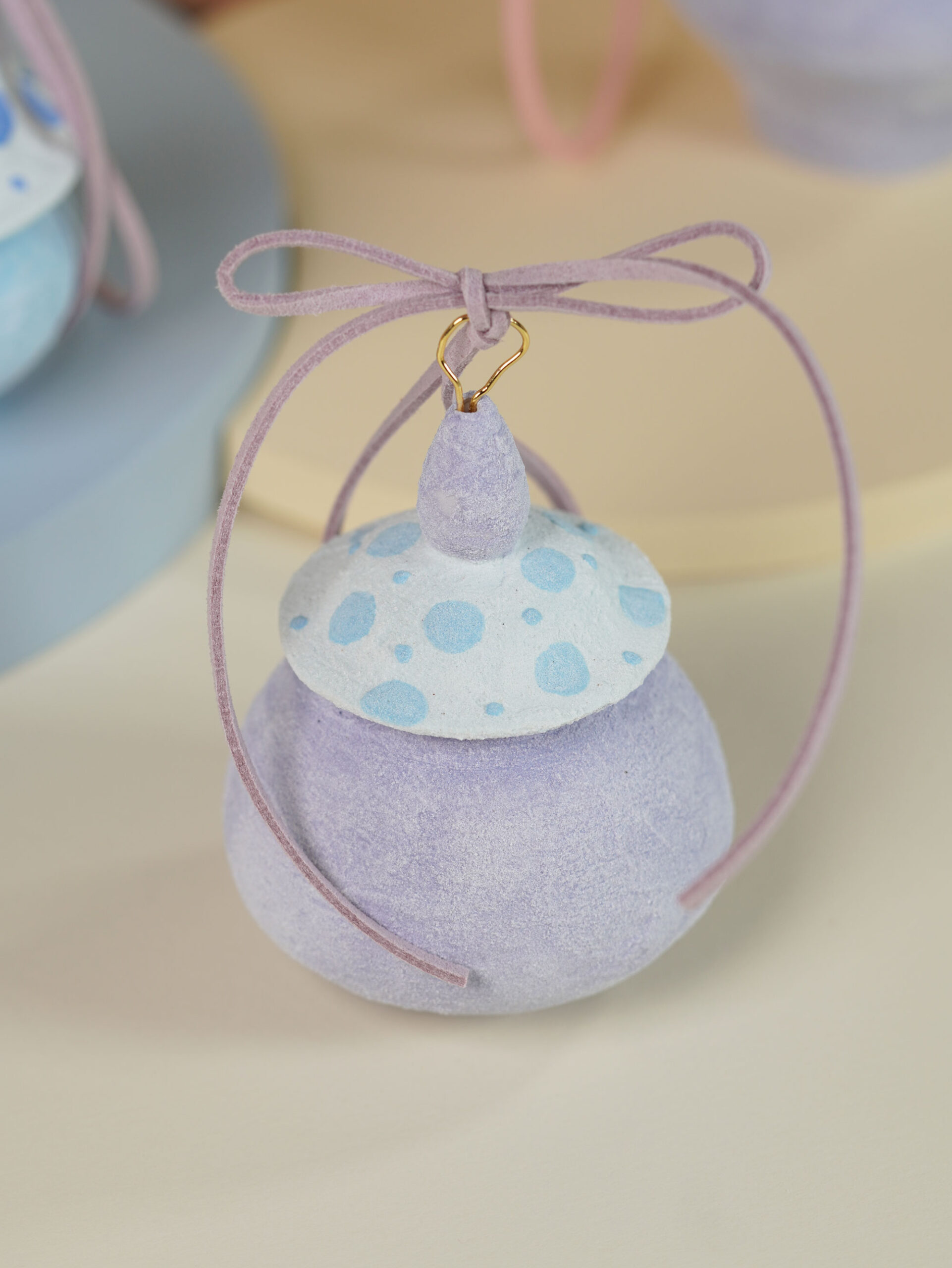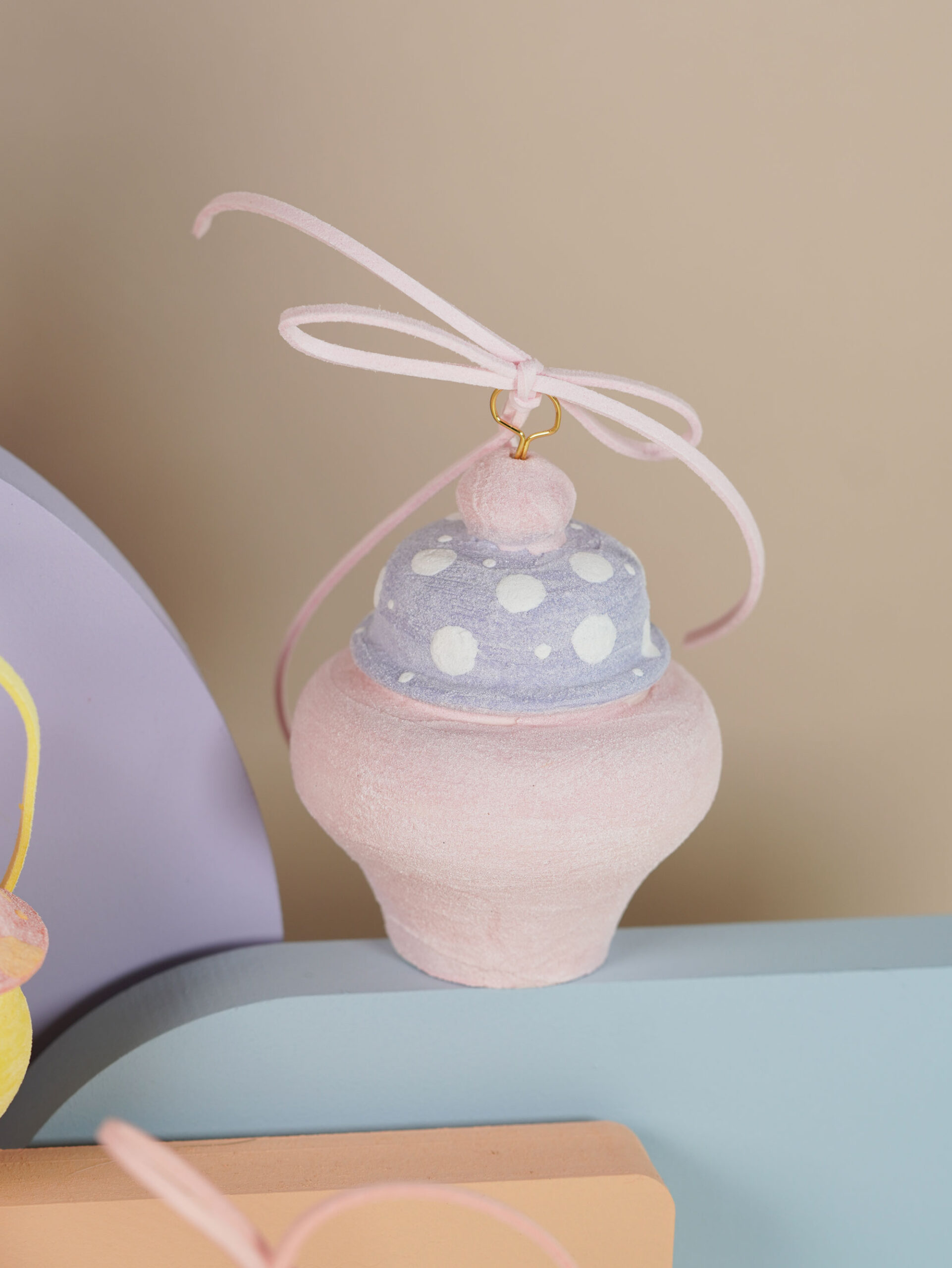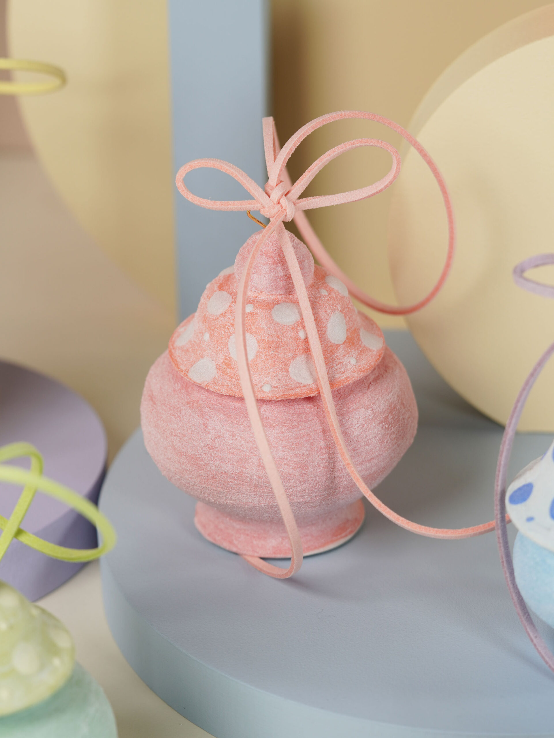 Porcelain slip, underglaze, and overglaze sourced from Australia, New Zealand, and China. Finished with a clear glossy glaze. Ribbons, wire, and threads are carefully sourced from Korea, Japan, and China.