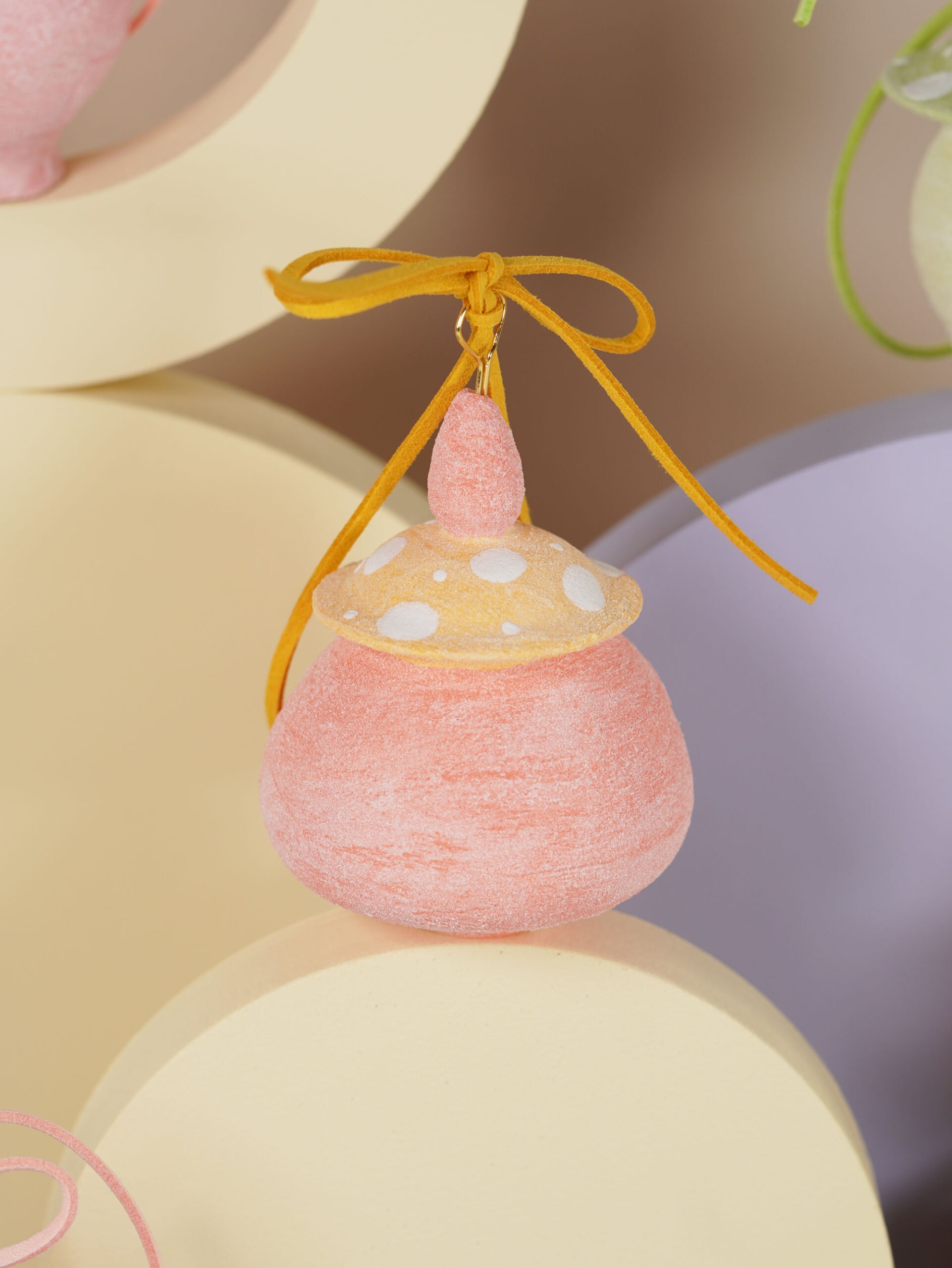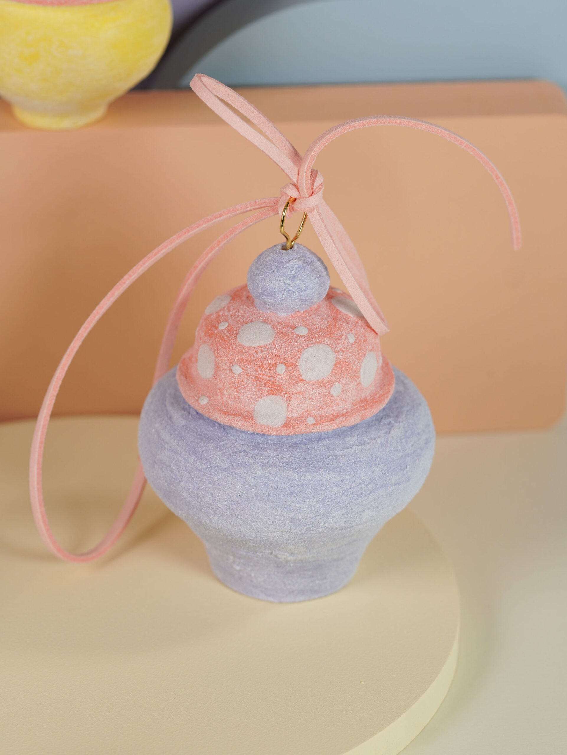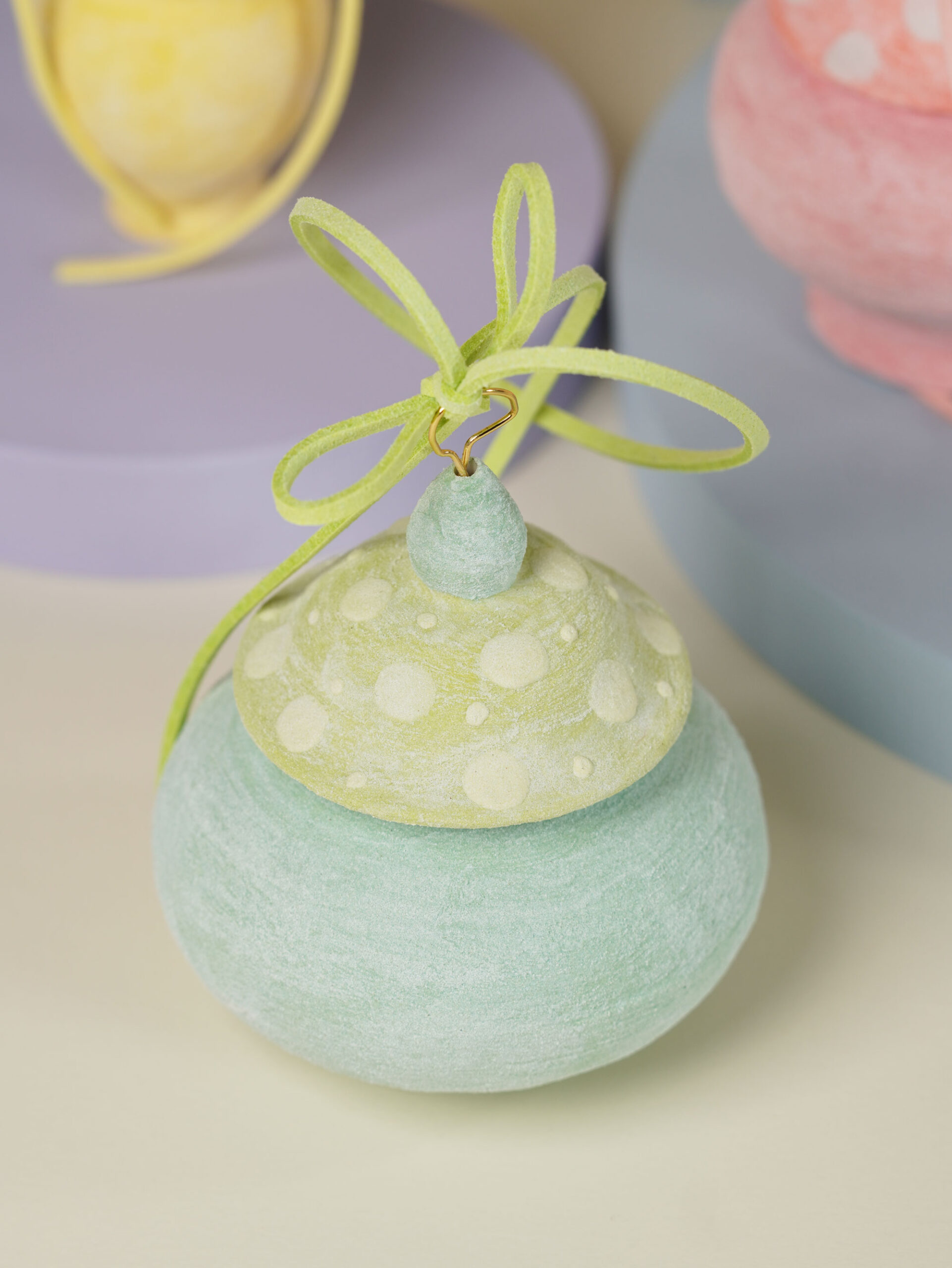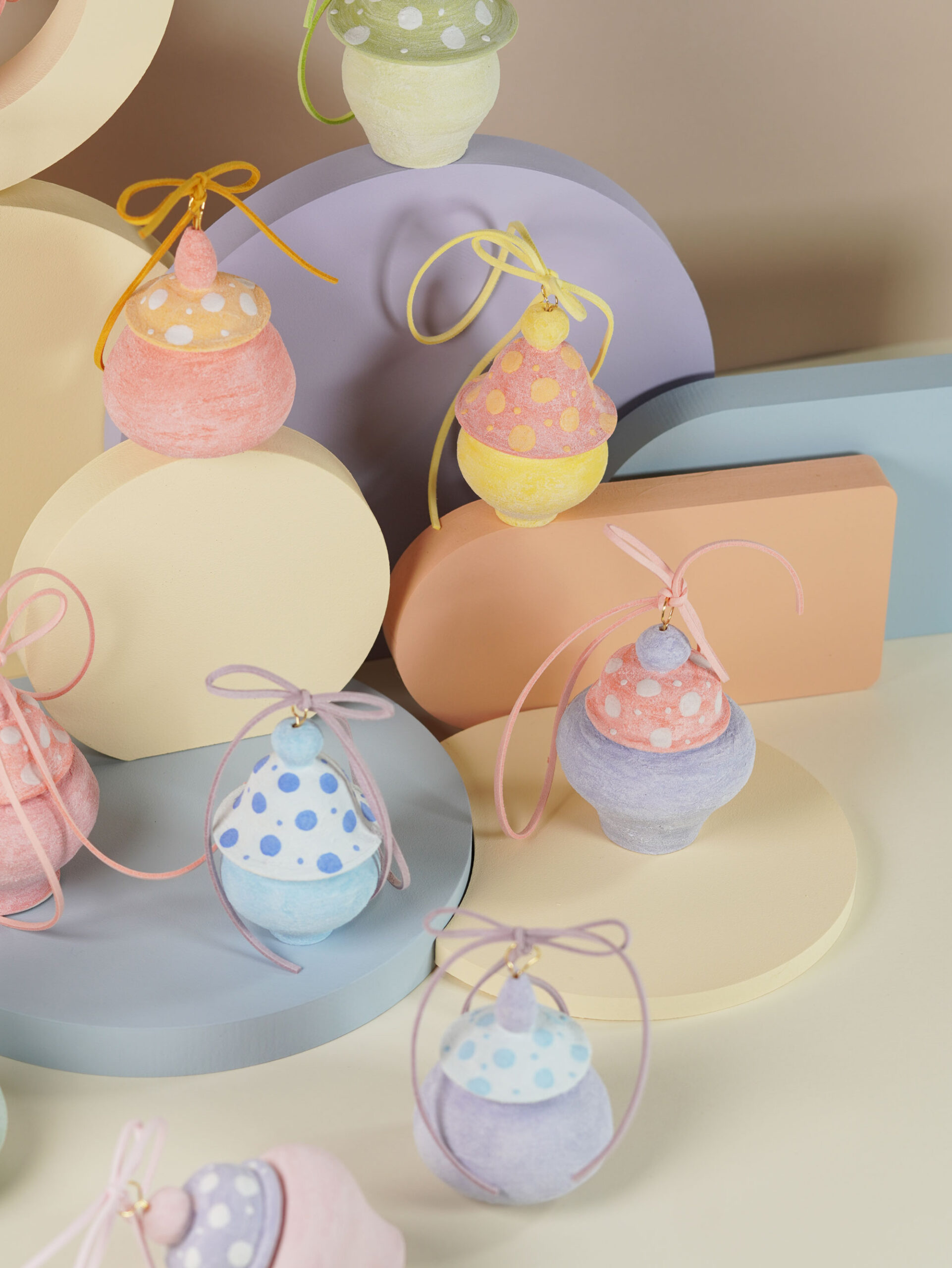 Porcelain slip, underglaze, and overglaze sourced from Australia, New Zealand, and China. Finished with a clear glossy glaze. Ribbons, wire, and threads are carefully sourced from Korea, Japan, and China.