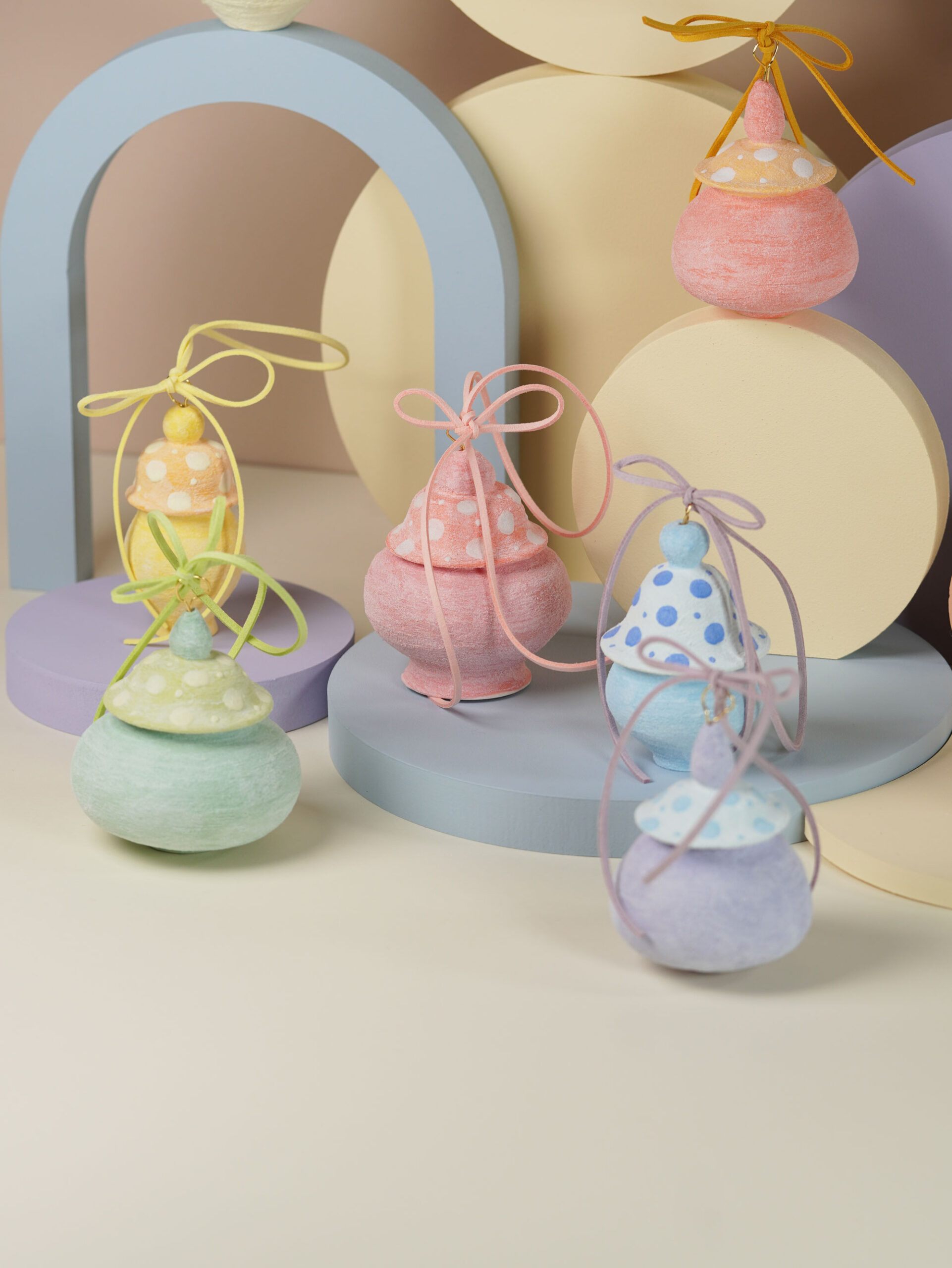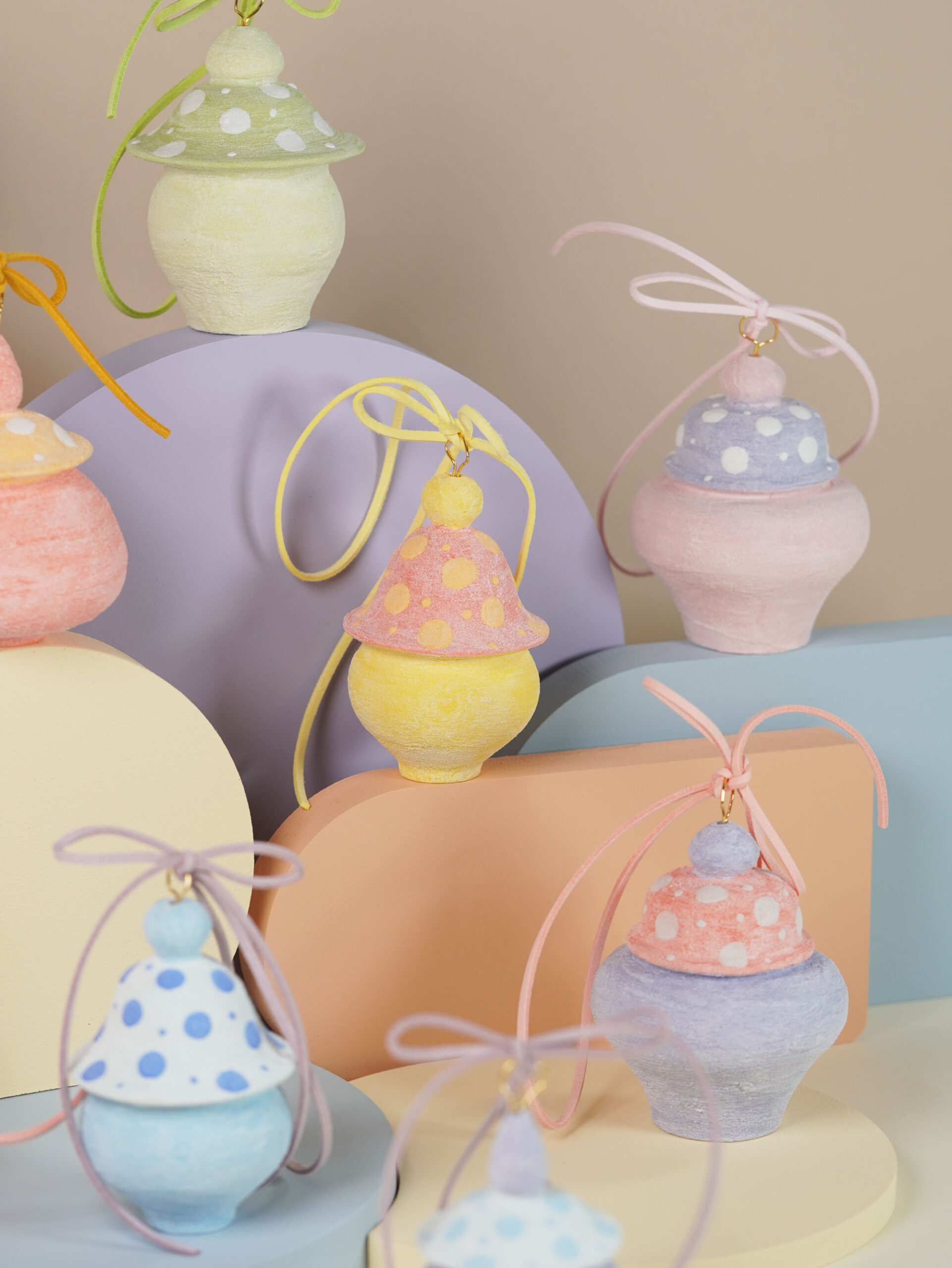 13 original jar shapes, inspired by ancient Chinese porcelain yet reimagined for today. Each ornament is a one-piece form—some with a base, others without. Modern motifs recall timeless designs, with no two ever the same.