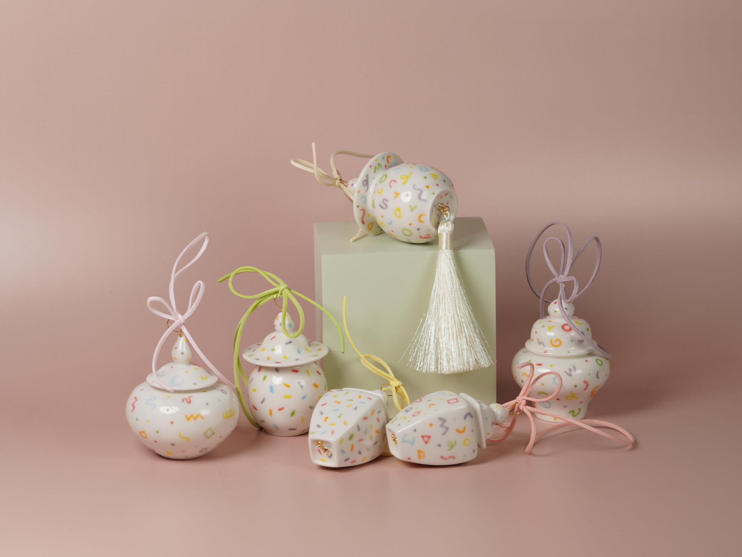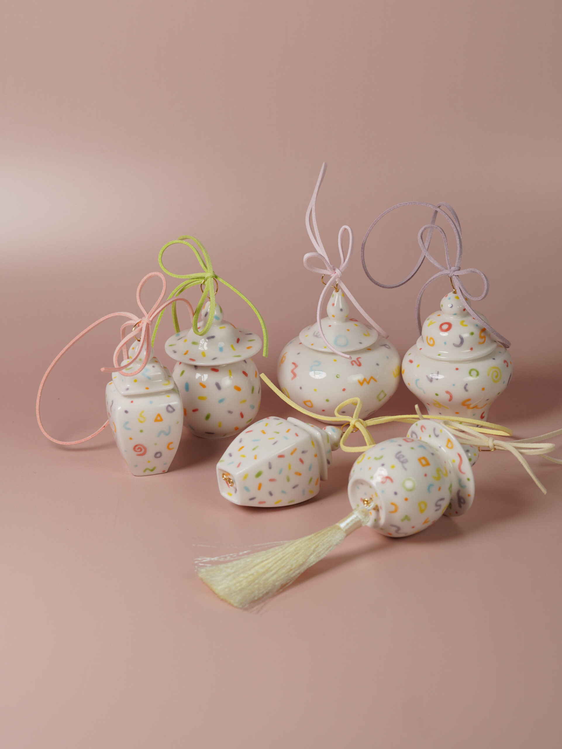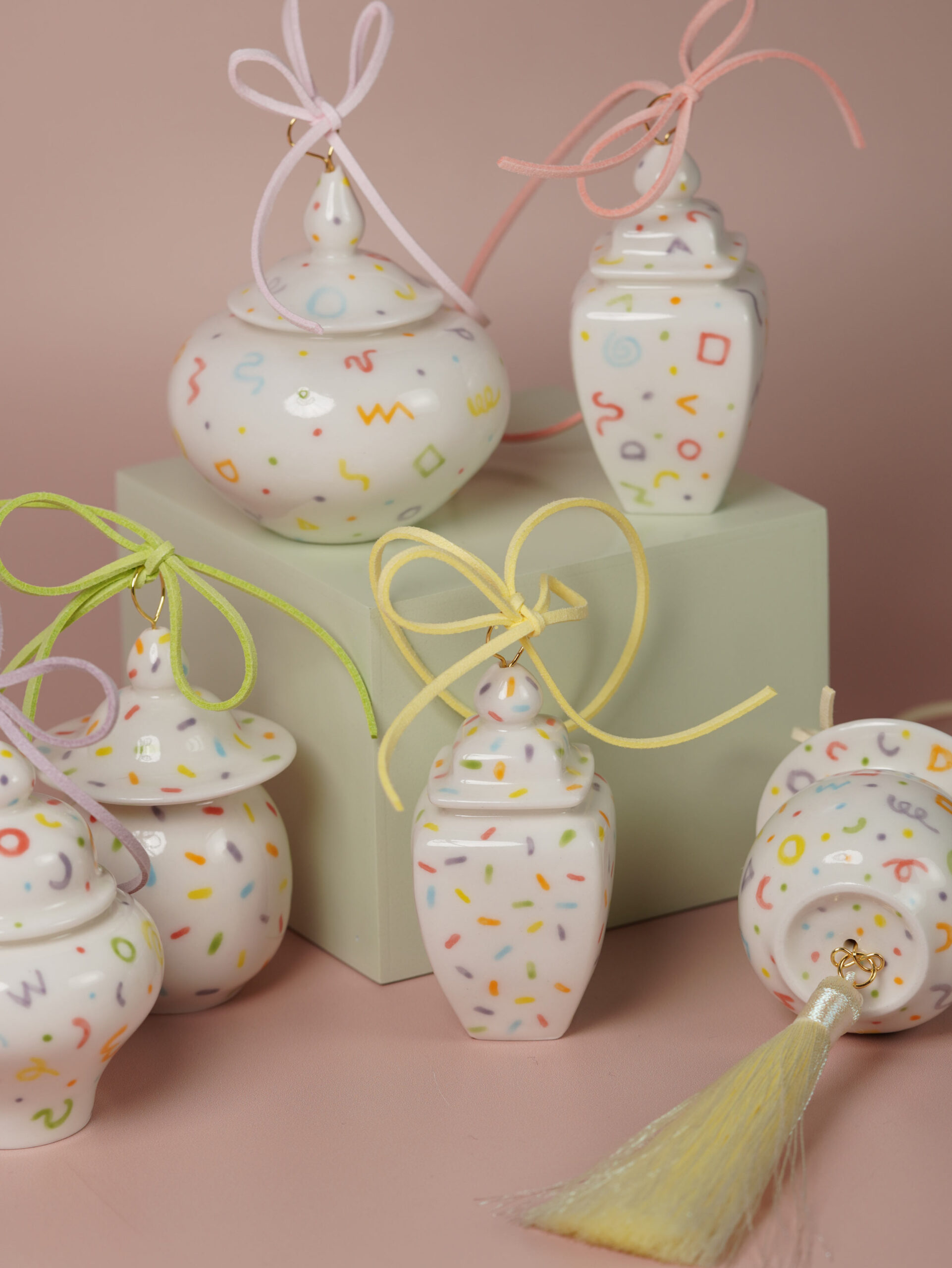 13 original jar shapes, inspired by ancient Chinese porcelain yet reimagined for today. Each ornament is a one-piece form—some with a base, others without. Modern motifs recall timeless designs, with no two ever the same.