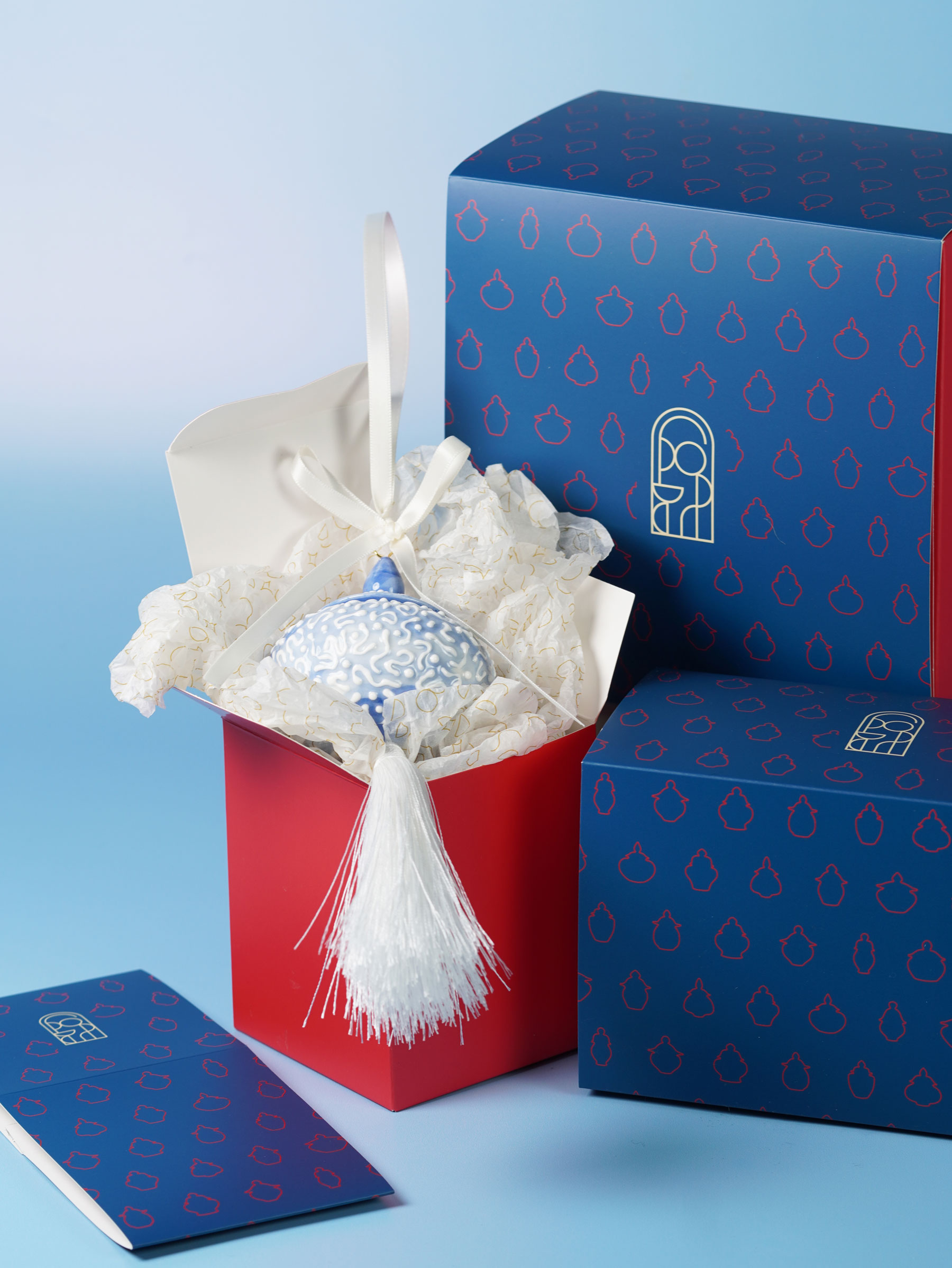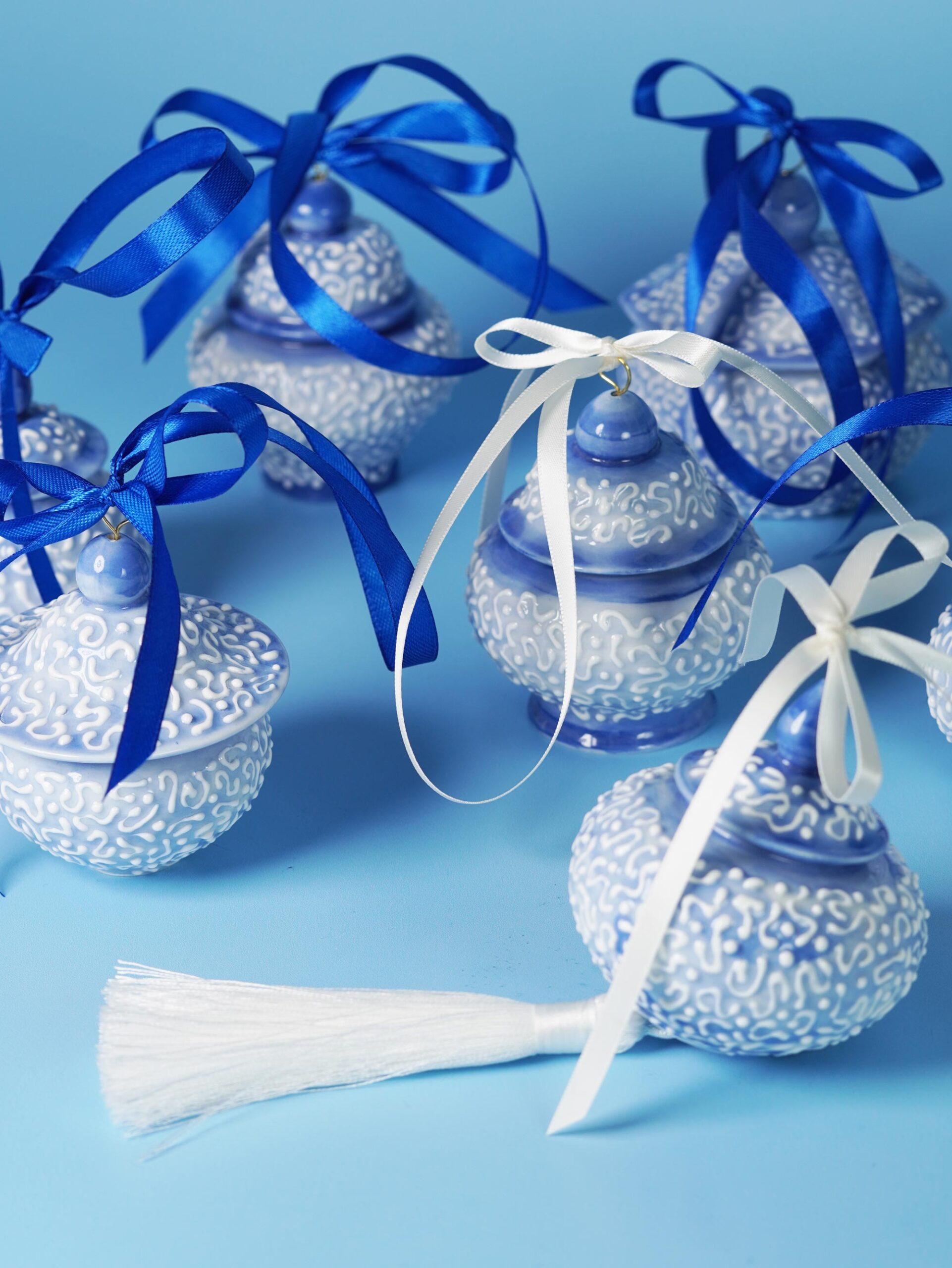 13 original jar shapes, inspired by ancient Chinese porcelain yet reimagined for today. Each ornament is a one-piece form—some with a base, others without. Modern motifs recall timeless designs, with no two ever the same.