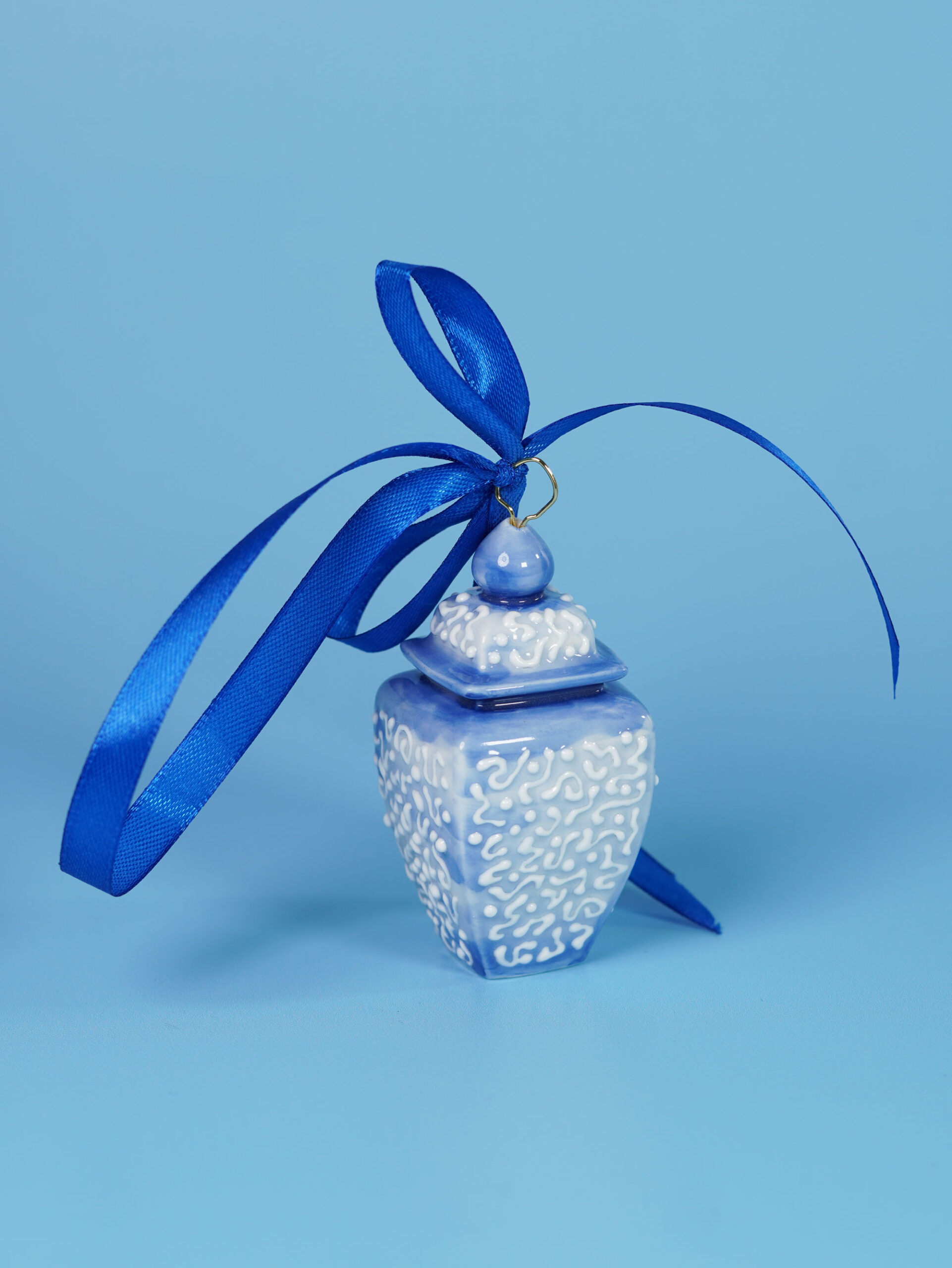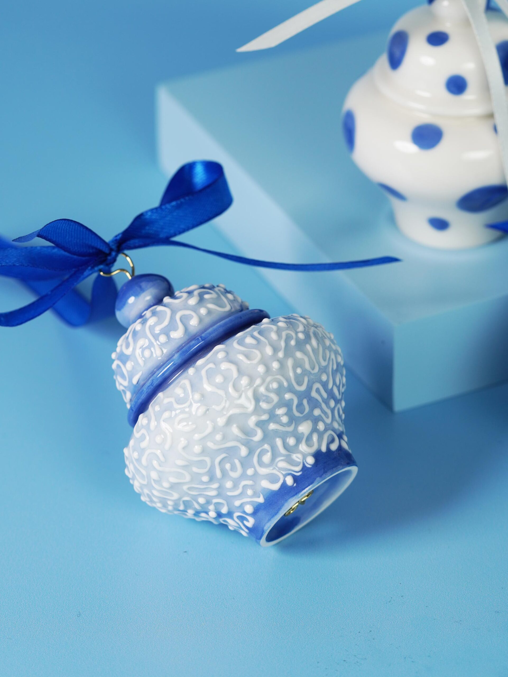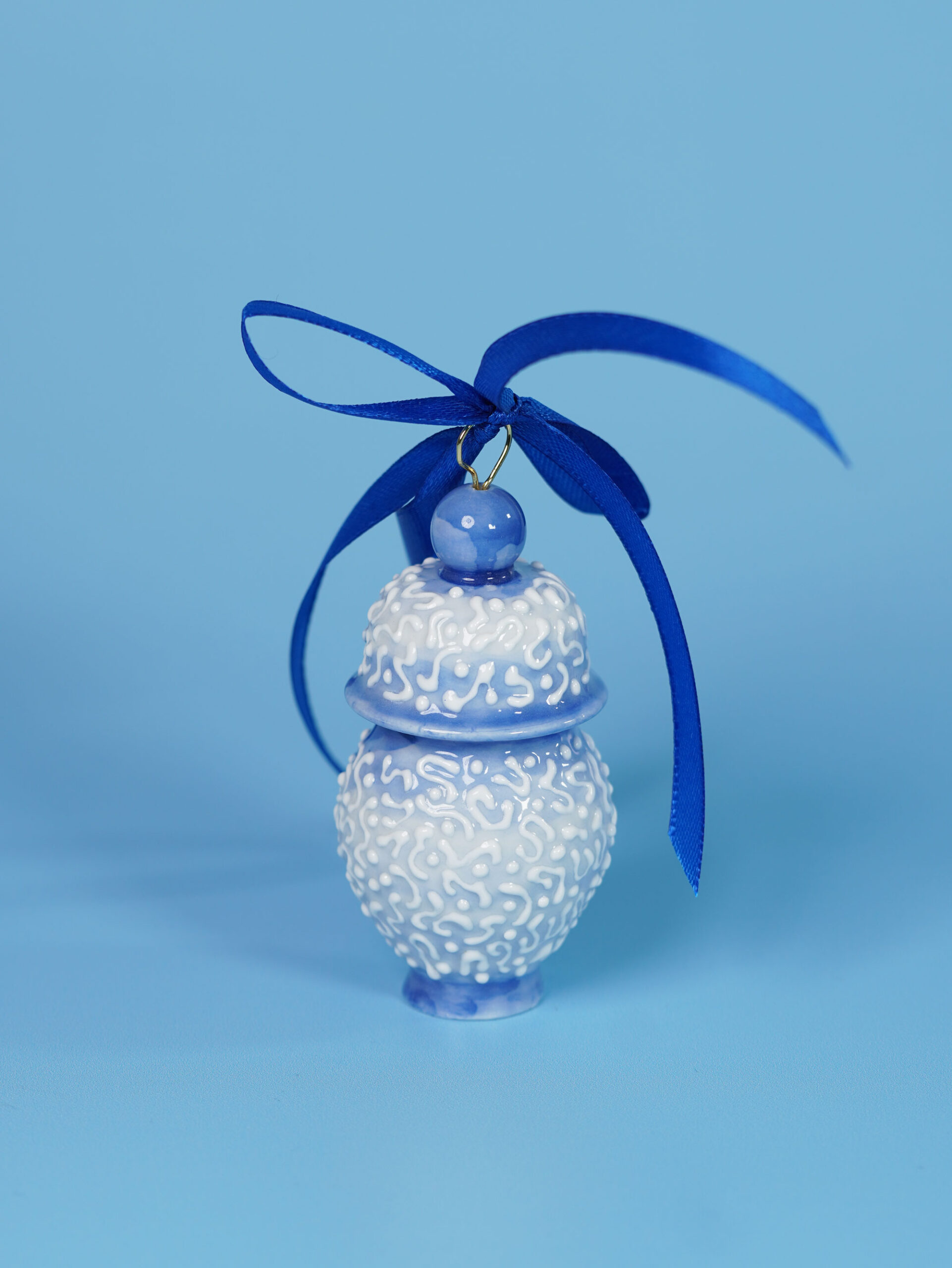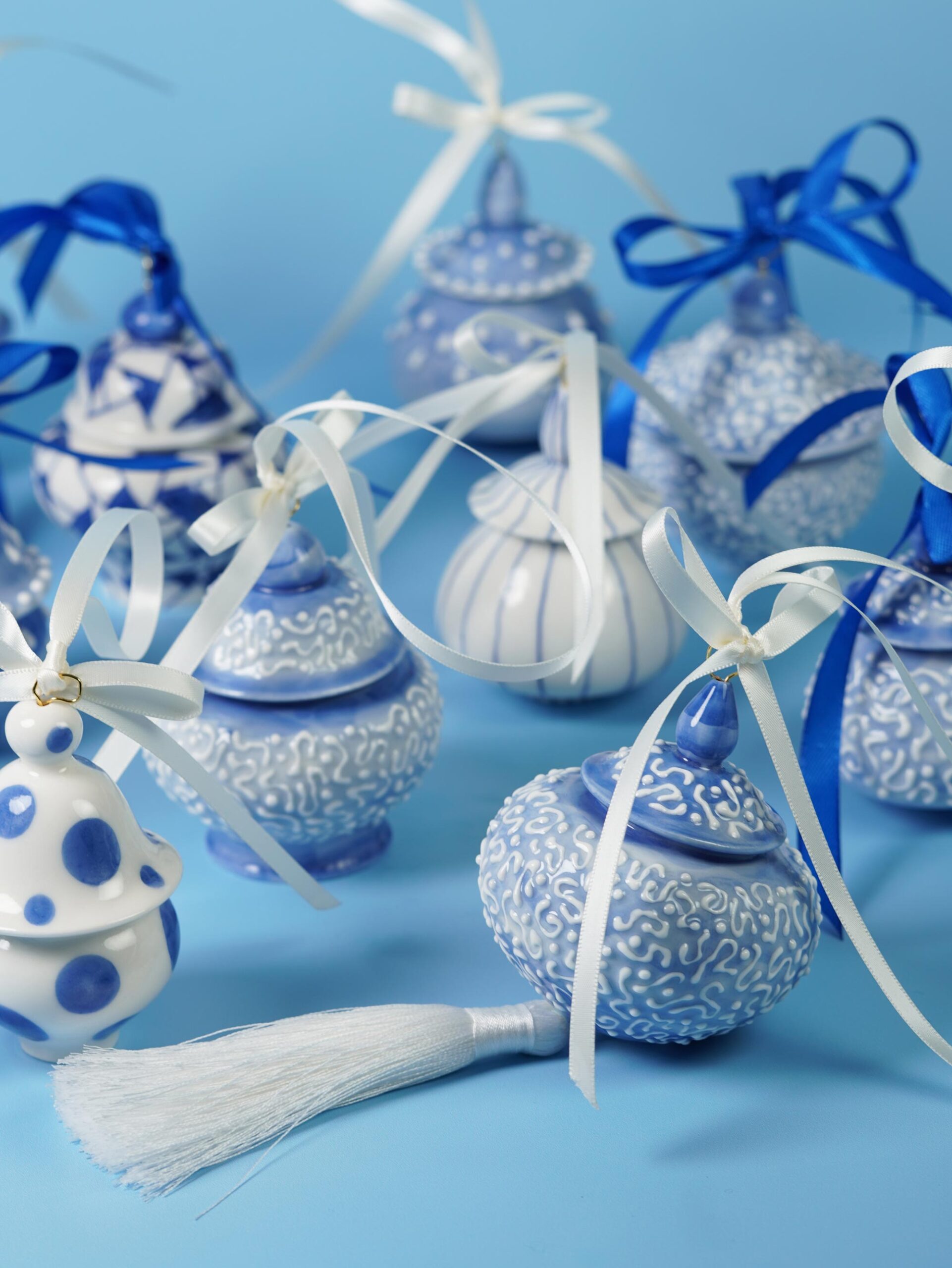 Each piece is slip-cast, hand-decorated with cobalt blue underglaze, and coated in a clear glossy glaze. A soft 18k gold-gilded wire runs through the ornament, ready for hanging. Finished with blue, white, or red ribbons for a festive touch, and some accented with one or more tassels.