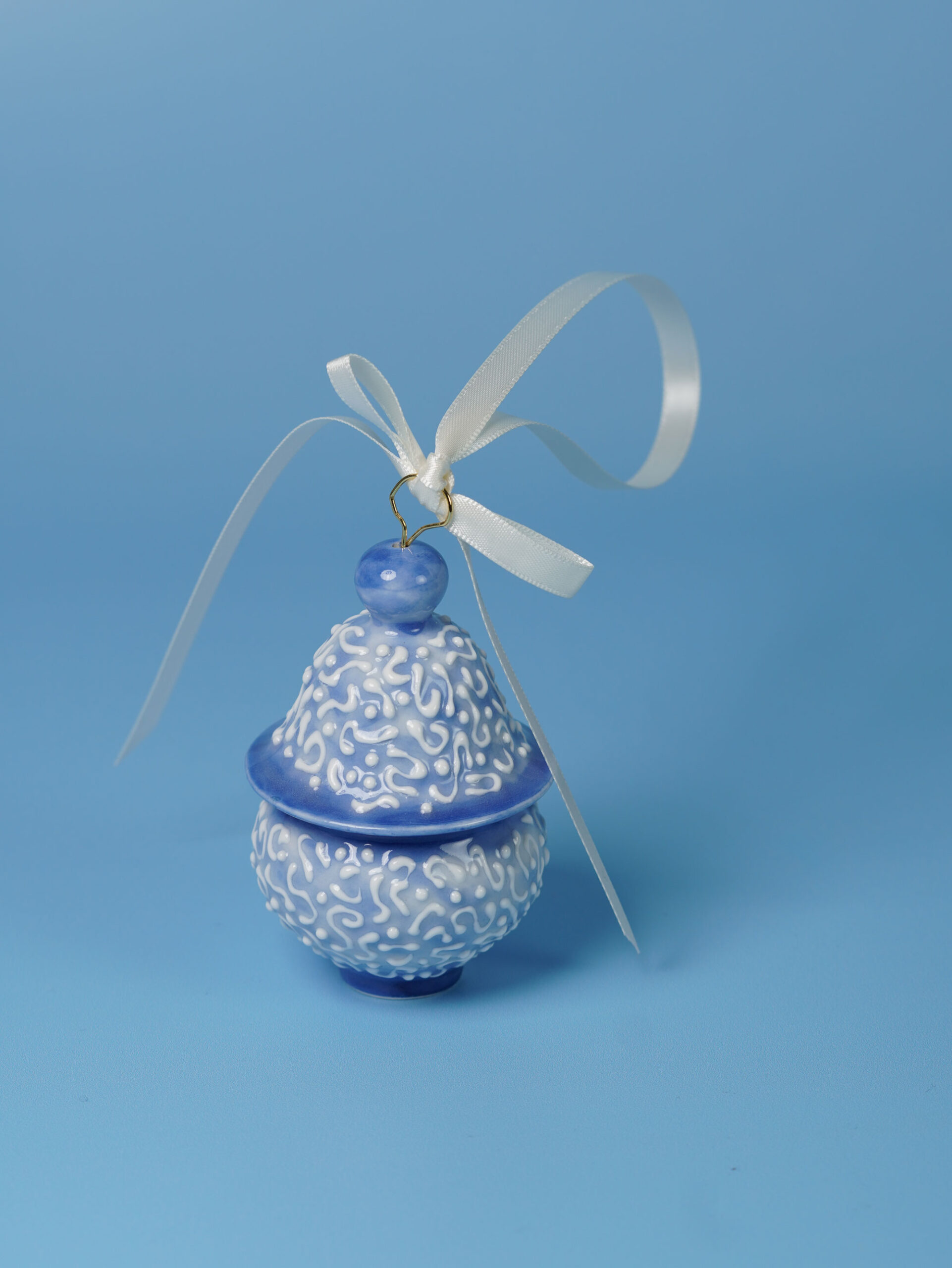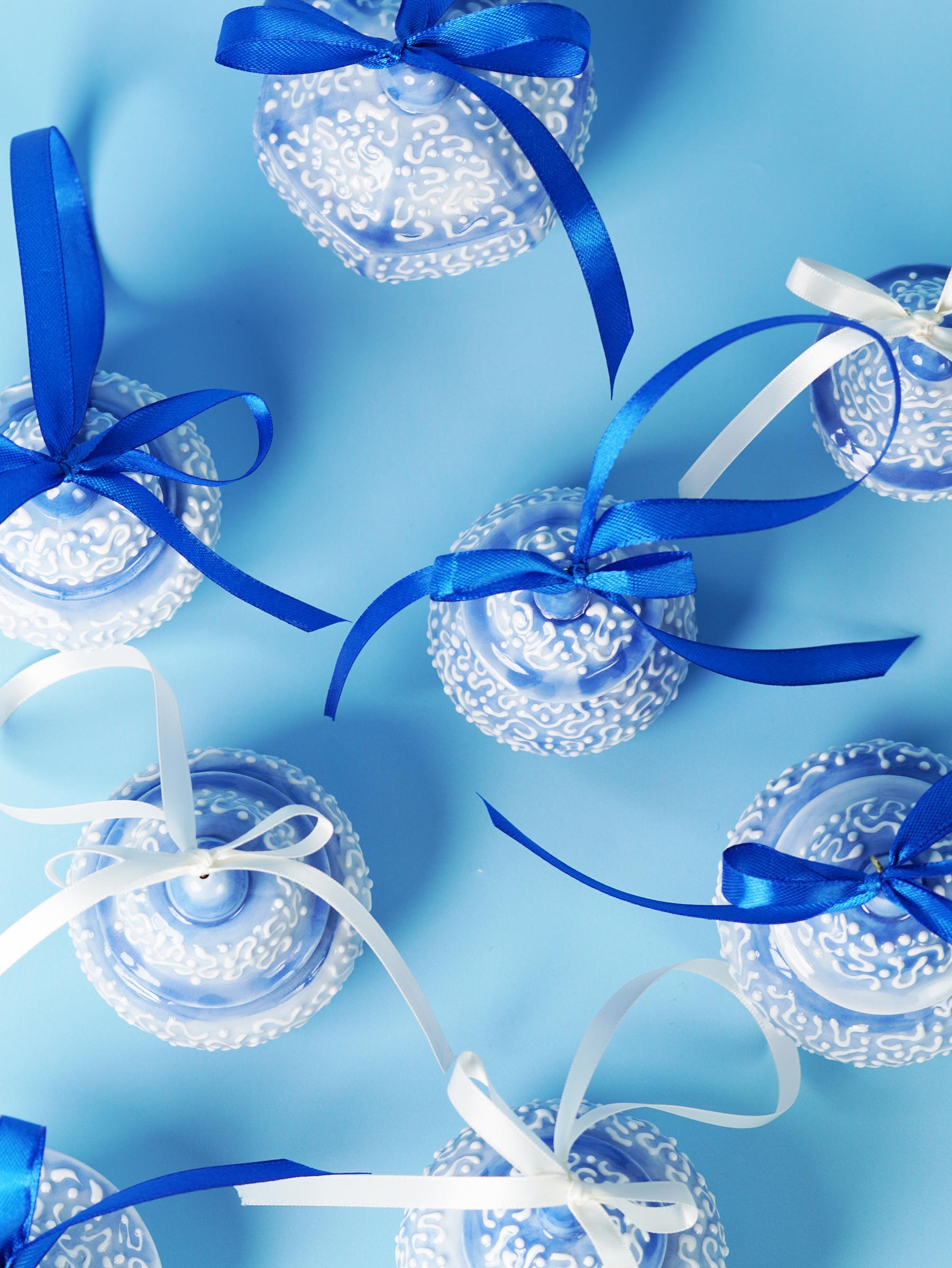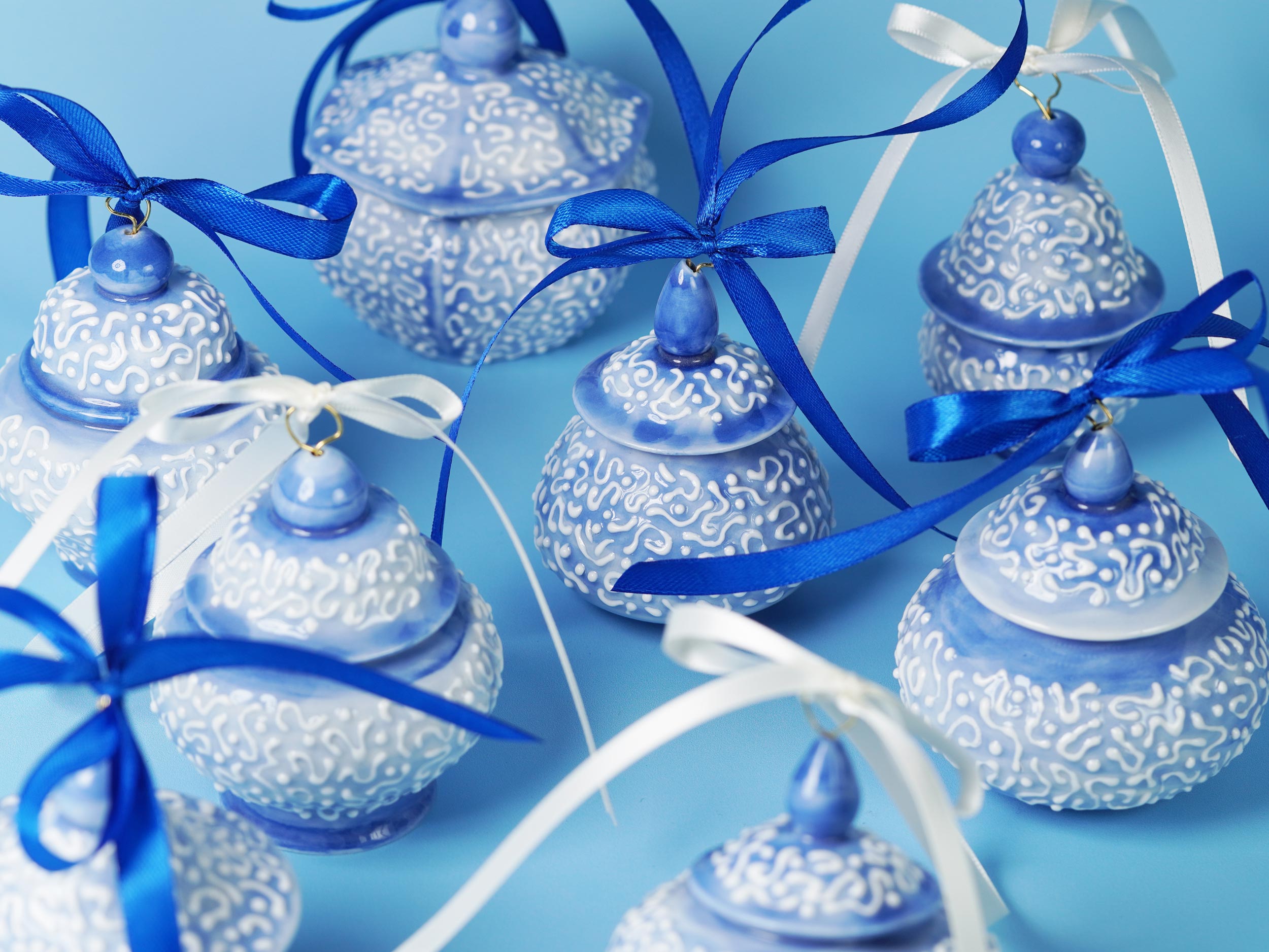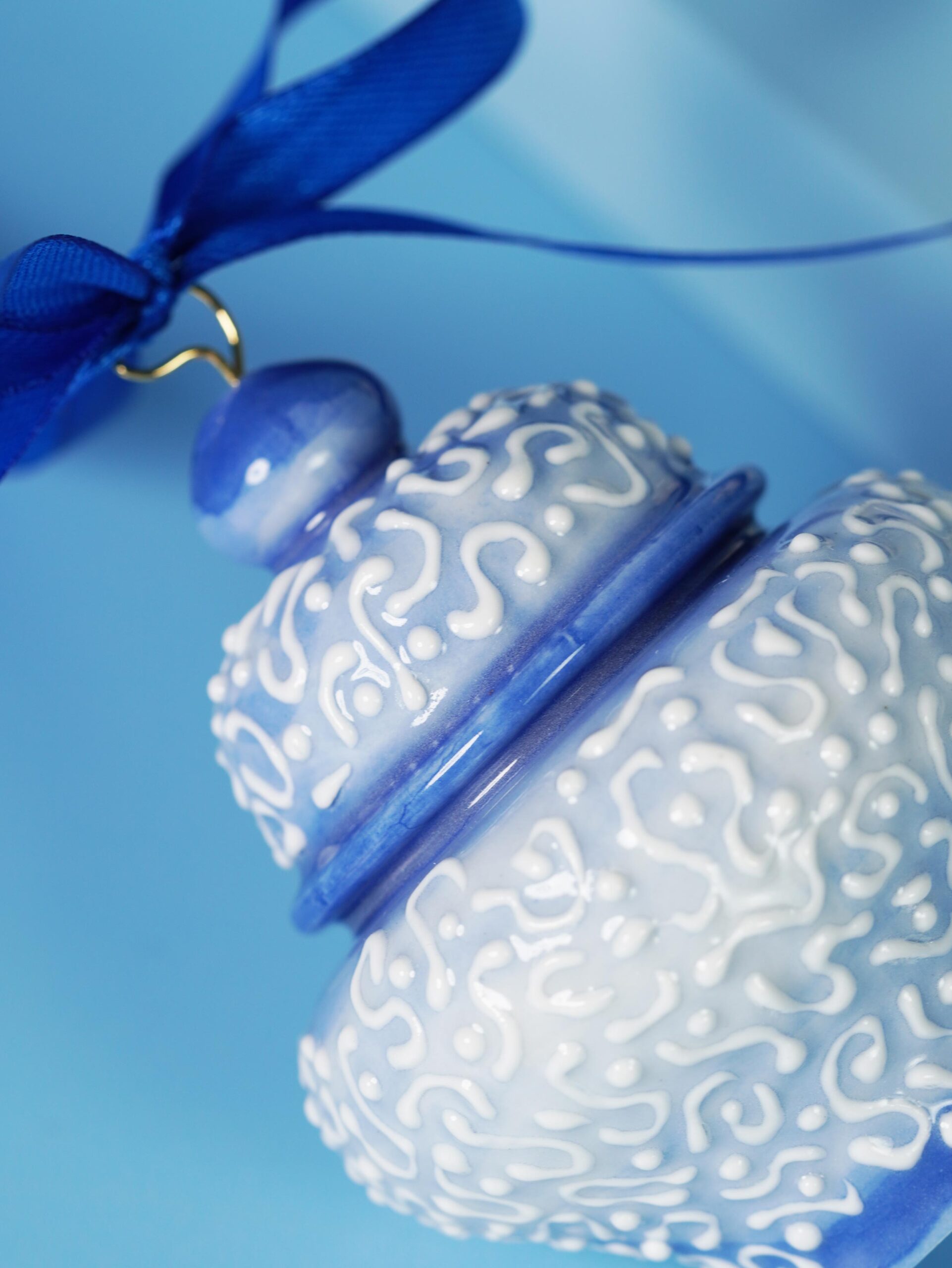 Each piece is slip-cast, hand-decorated with cobalt blue underglaze, and coated in a clear glossy glaze. A soft 18k gold-gilded wire runs through the ornament, ready for hanging. Finished with blue, white, or red ribbons for a festive touch, and some accented with one or more tassels.