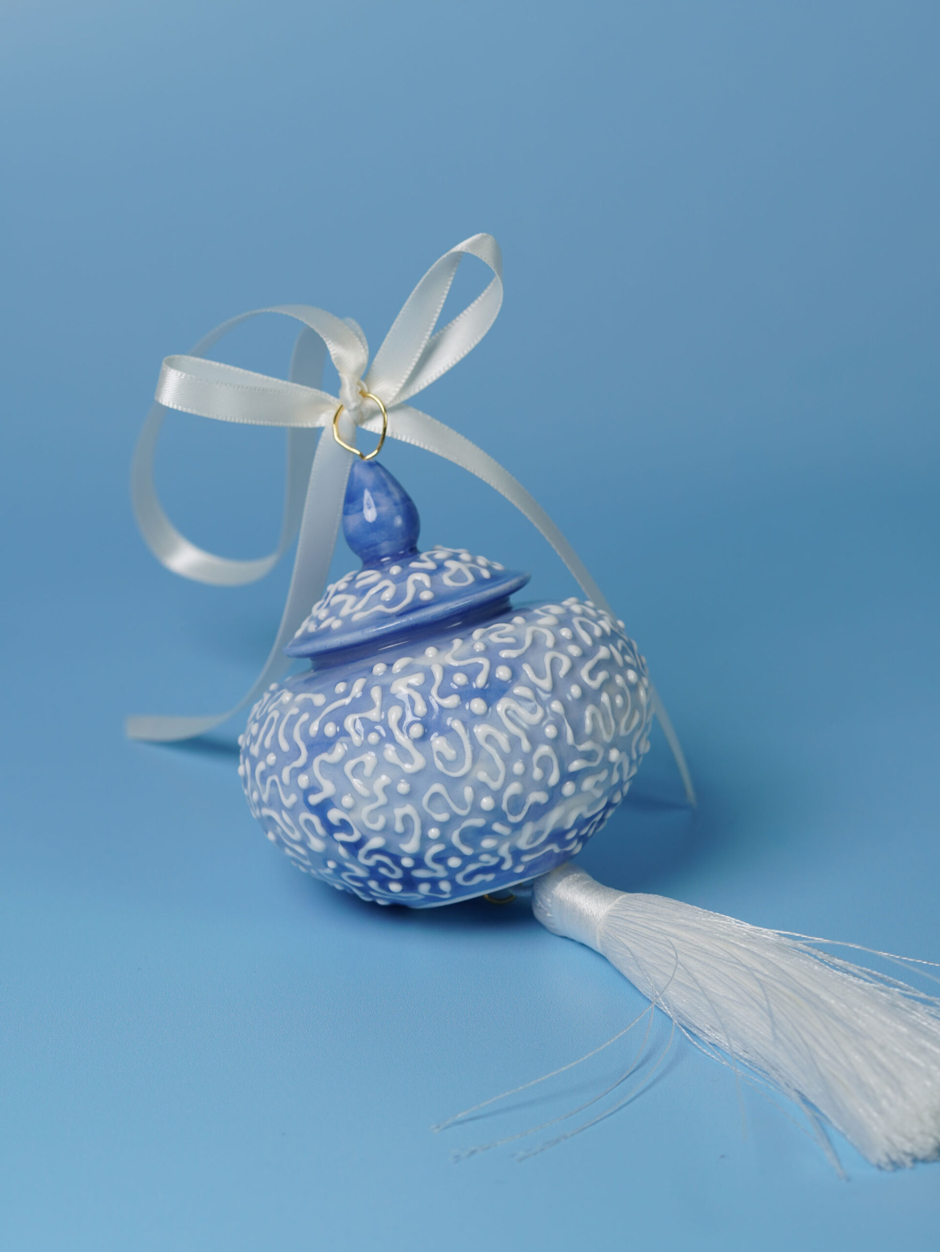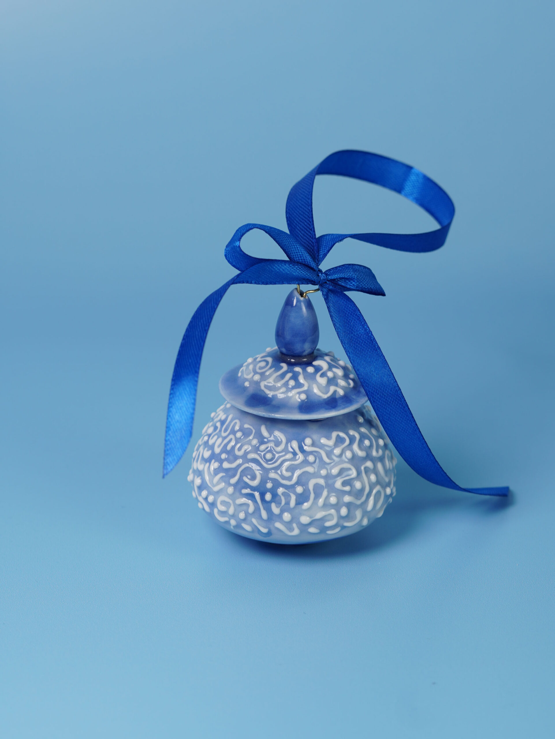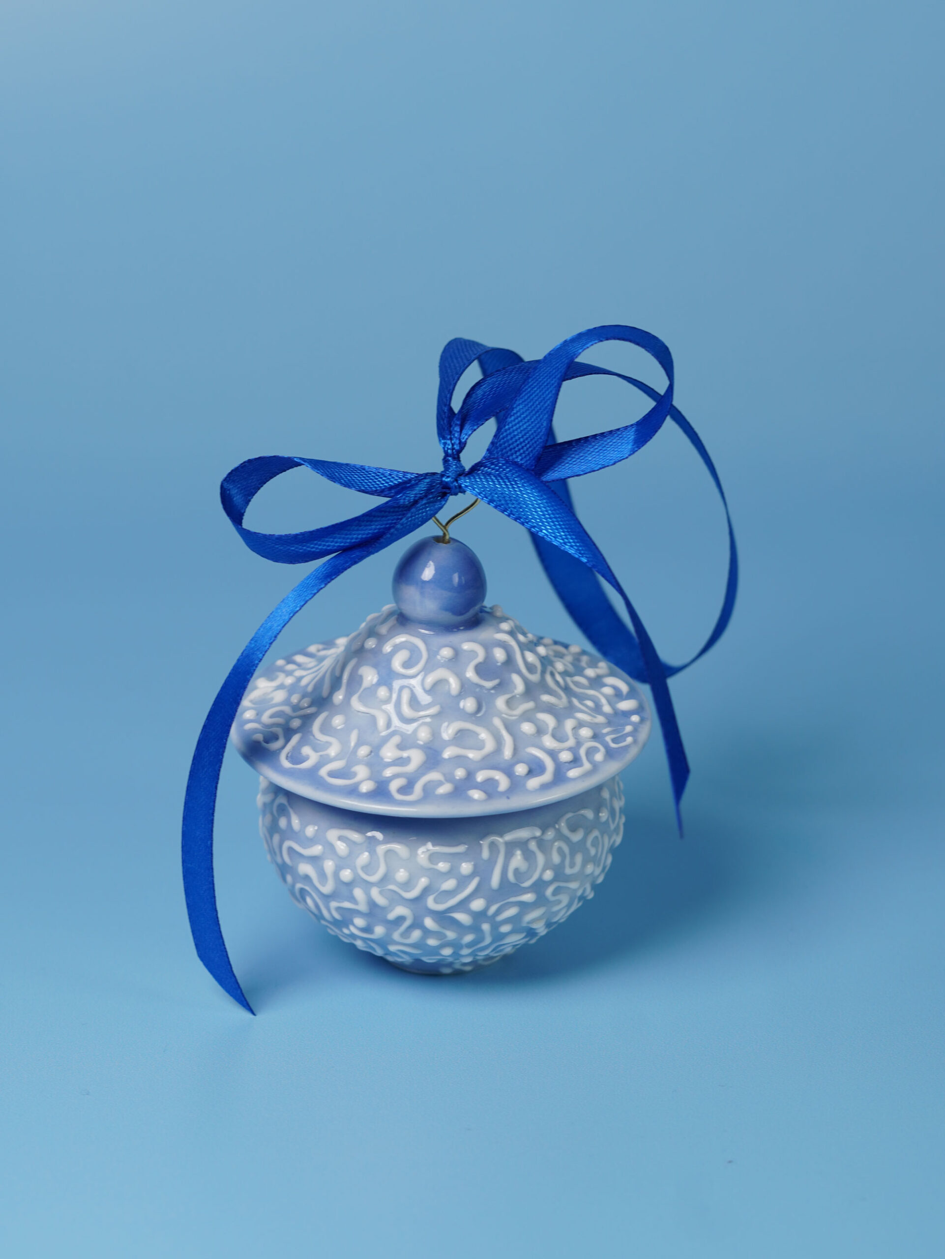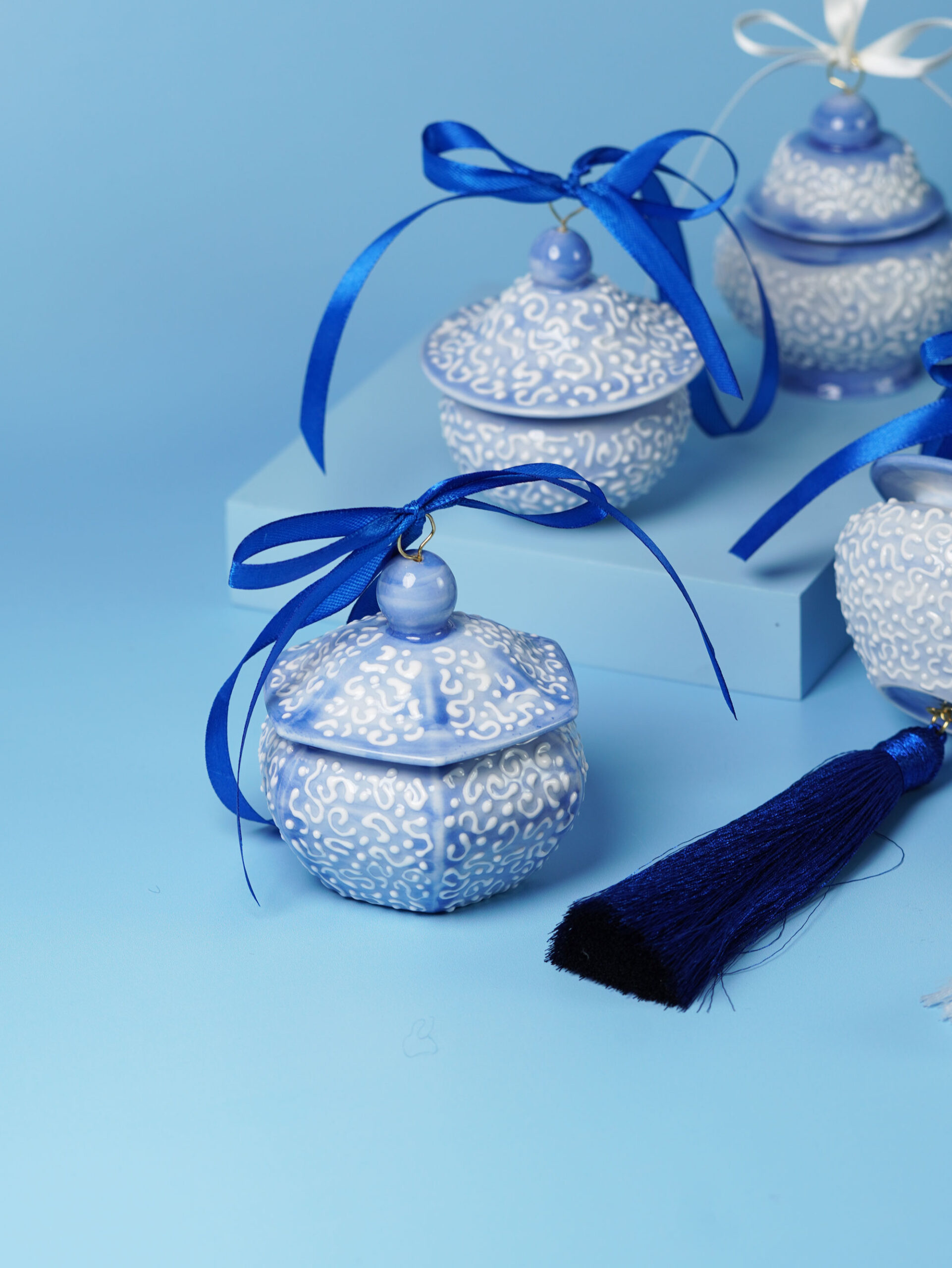 Each piece is slip-cast, hand-decorated with cobalt blue underglaze, and coated in a clear glossy glaze. A soft 18k gold-gilded wire runs through the ornament, ready for hanging. Finished with blue, white, or red ribbons for a festive touch, and some accented with one or more tassels.