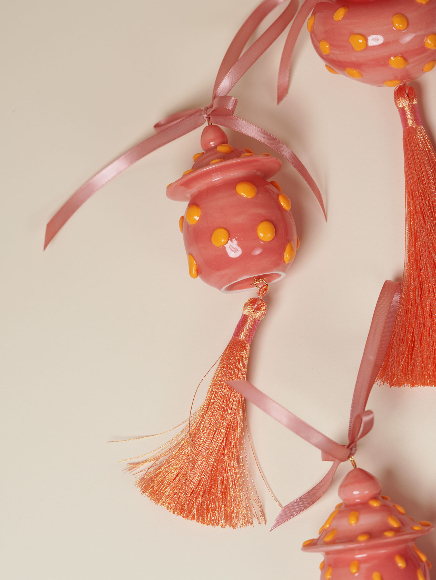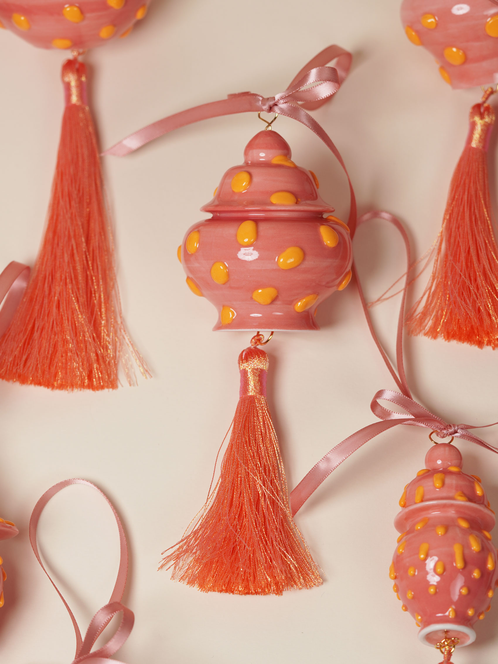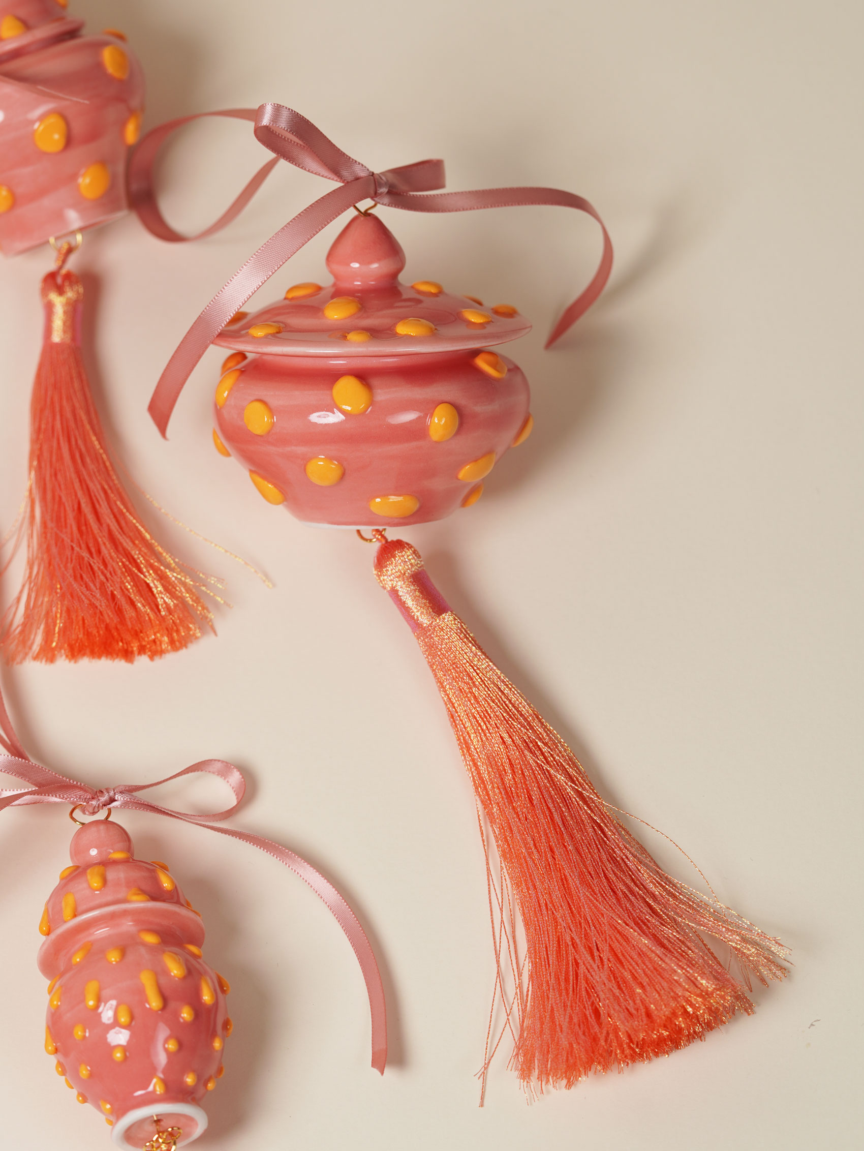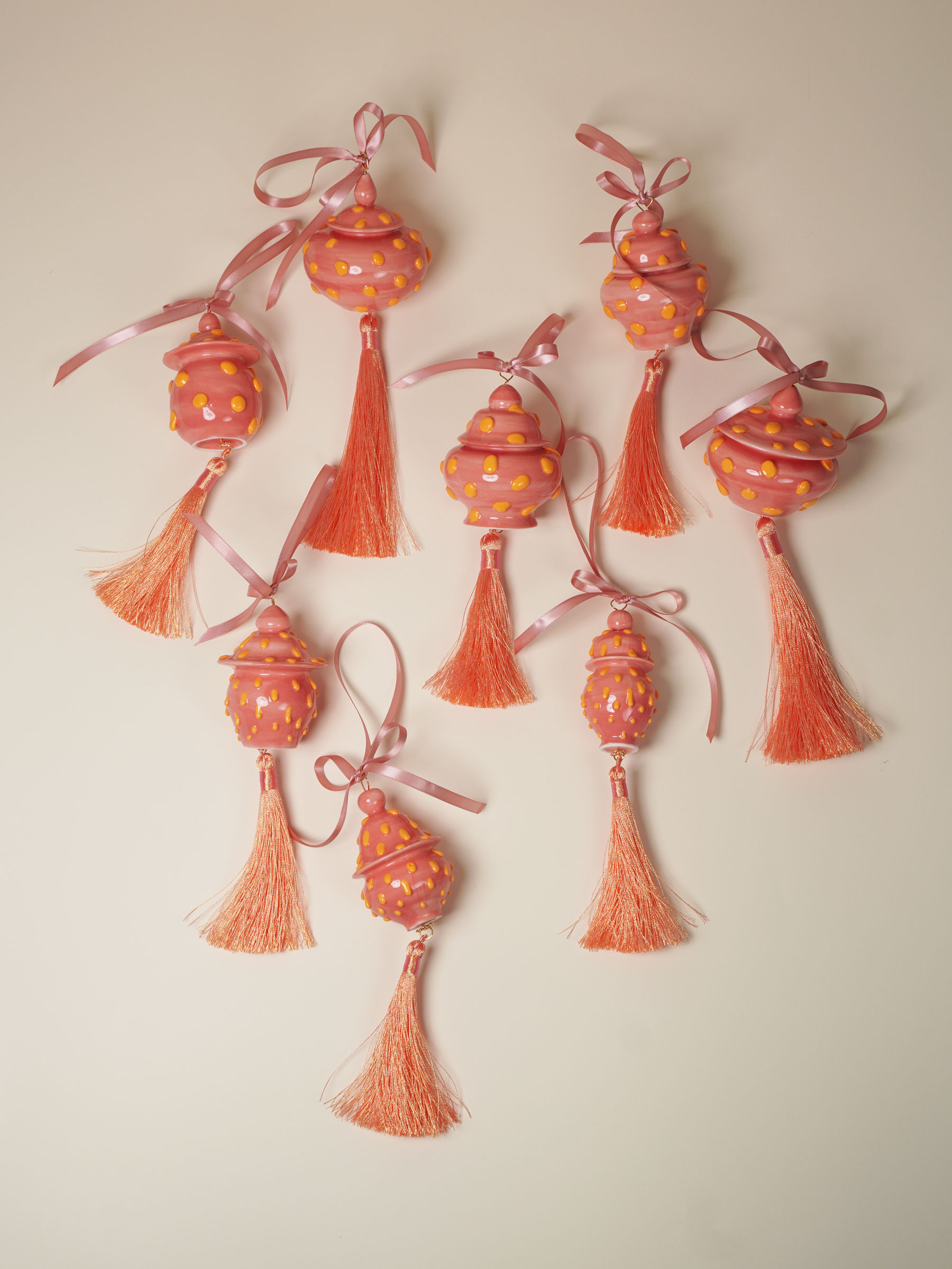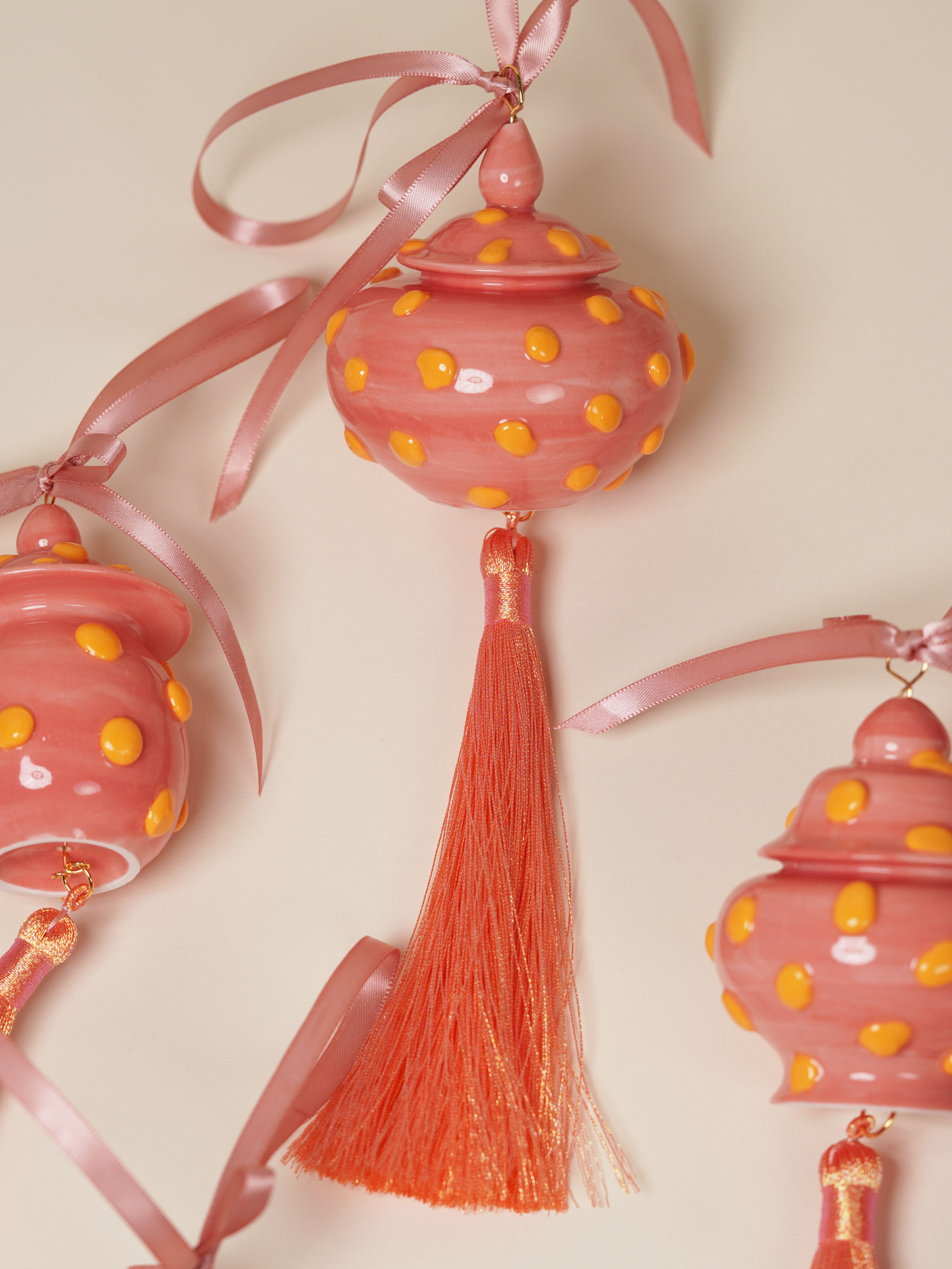 Soft as pastry and sweetly glazed, the Yolk Cream Puffs Ornaments feature playful dotted jars topped with peach ribbons and finished with delicate tassels.