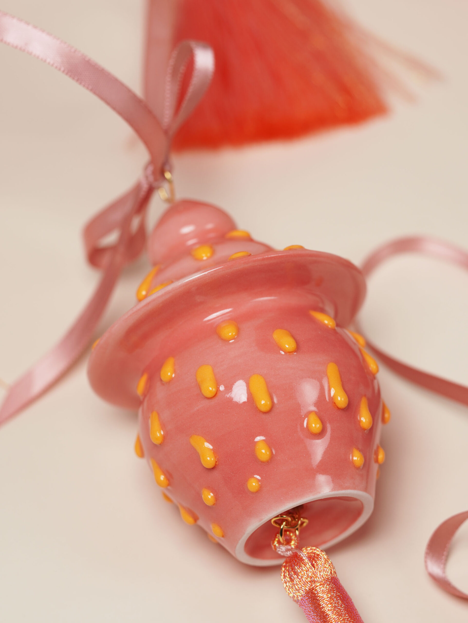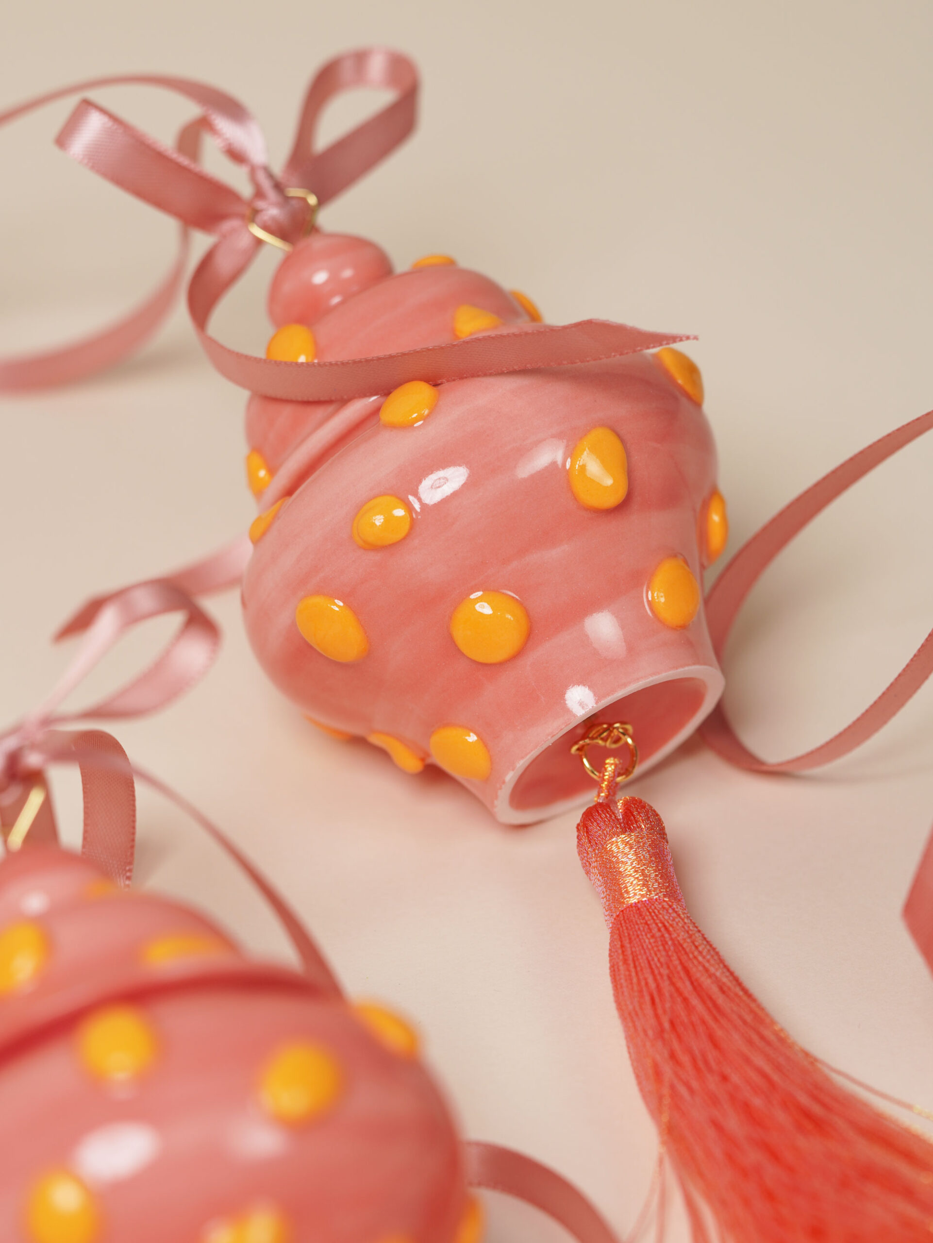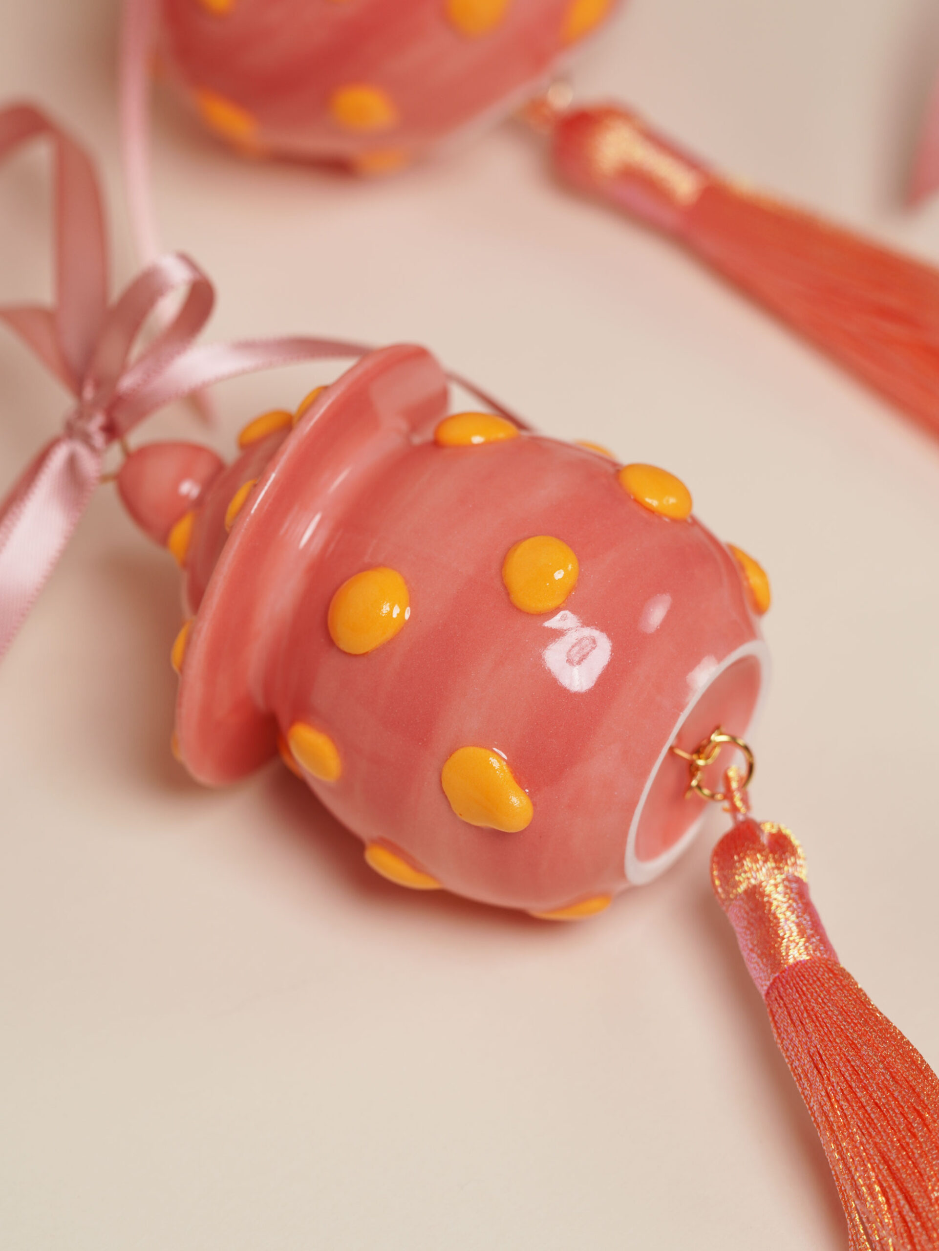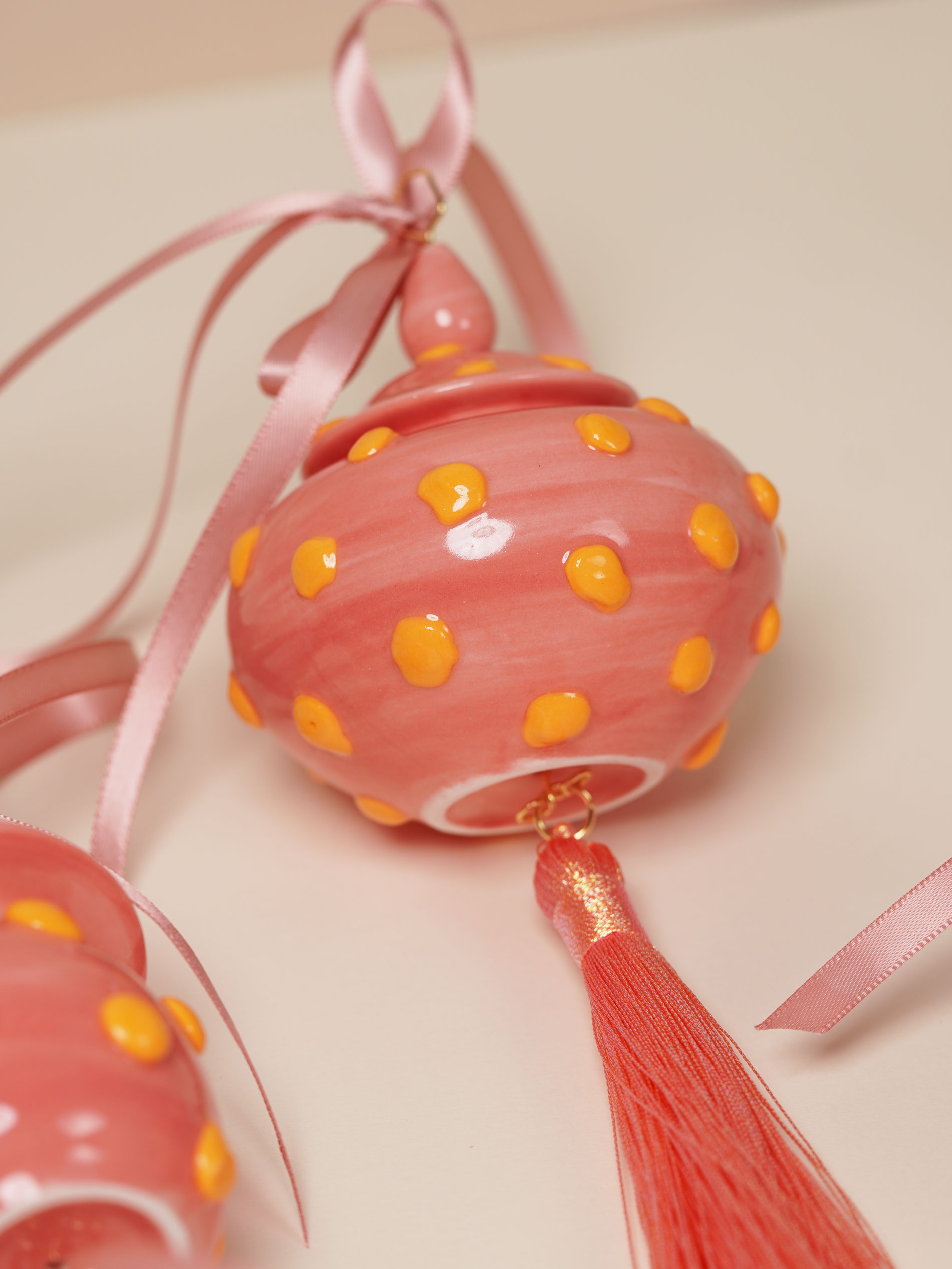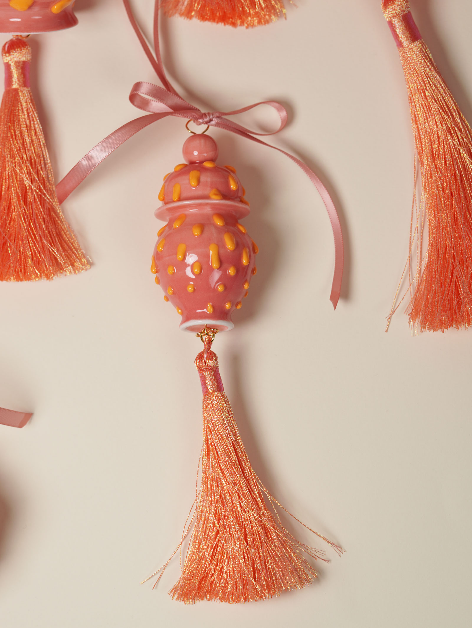 Soft as pastry and sweetly glazed, the Yolk Cream Puffs Ornaments feature playful dotted jars topped with peach ribbons and finished with delicate tassels.